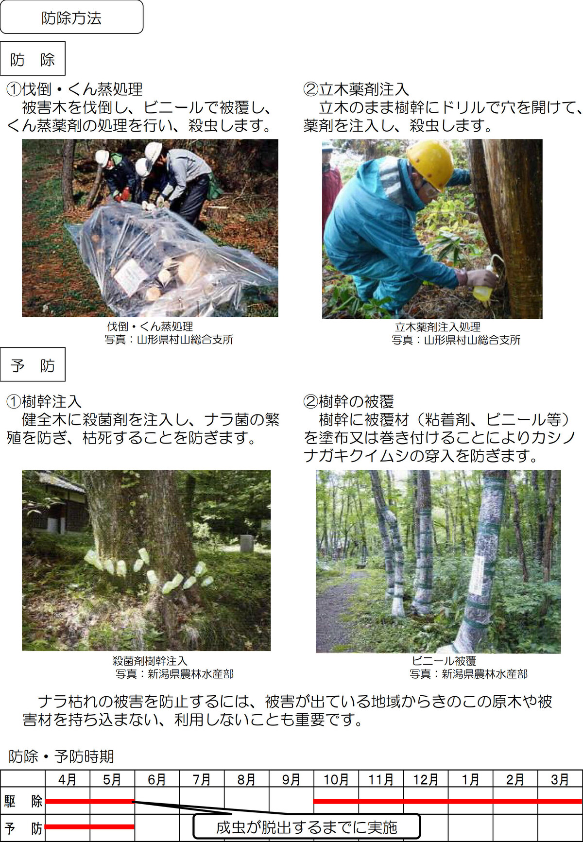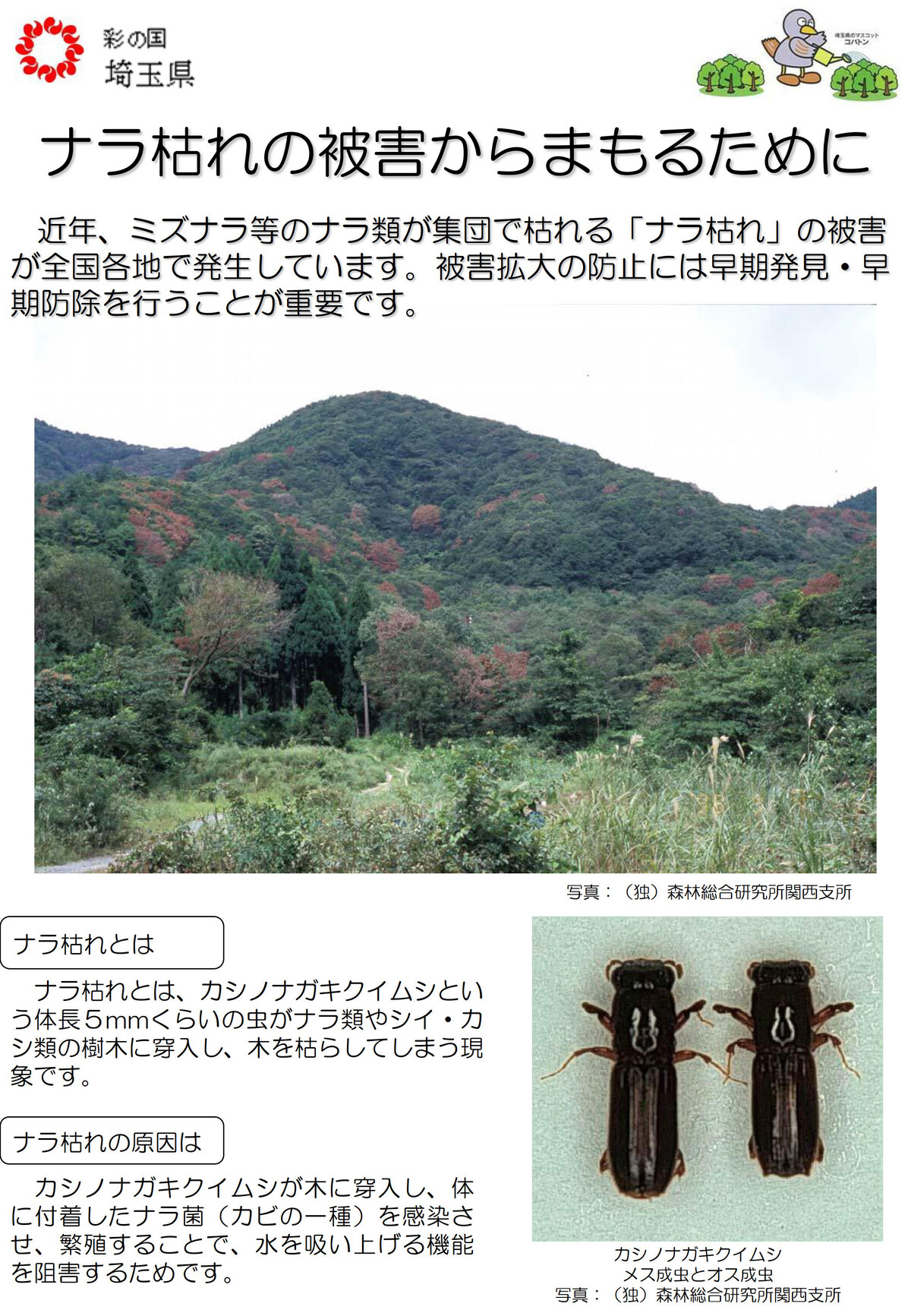 ……被害を放置すると、枯死による倒木で景観が悪くなったり、土砂崩れが起きたりするほか、温暖化や生物多様性の損失など生態系にも影響するため、早期発見と対処が必要になる。