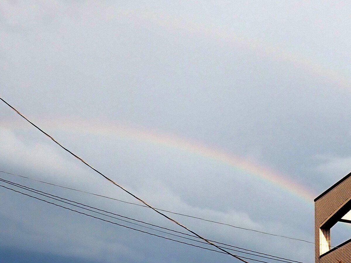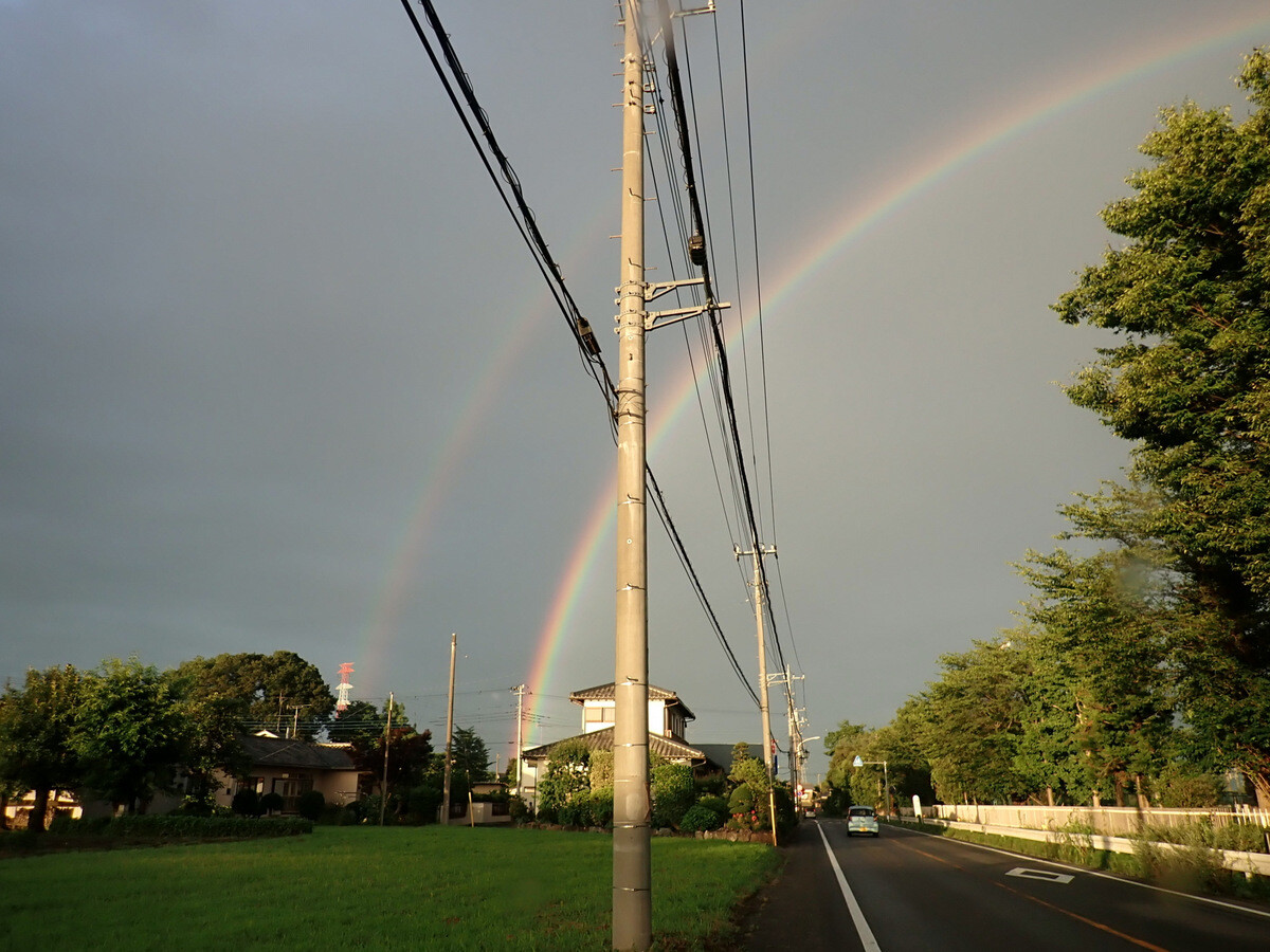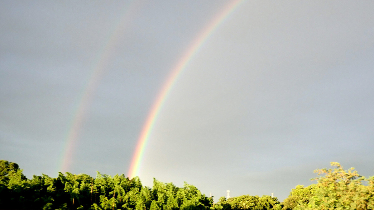 写真にある2本の虹の内、目立つ方の虹は主虹(しゅこう。外側:赤、内側:紫)、外側のうっすらと見える虹は副虹(ふくこう。外側:紫、内側:赤)と呼ばれ、色の順序が逆になっています。主虹と副虹に挟まれた中間の空は主虹の下側、あるいは副虹の上側の空よりも幾分暗く見えます。この暗い領域は「アレキサンダーの暗帯」と呼ぶそうです。