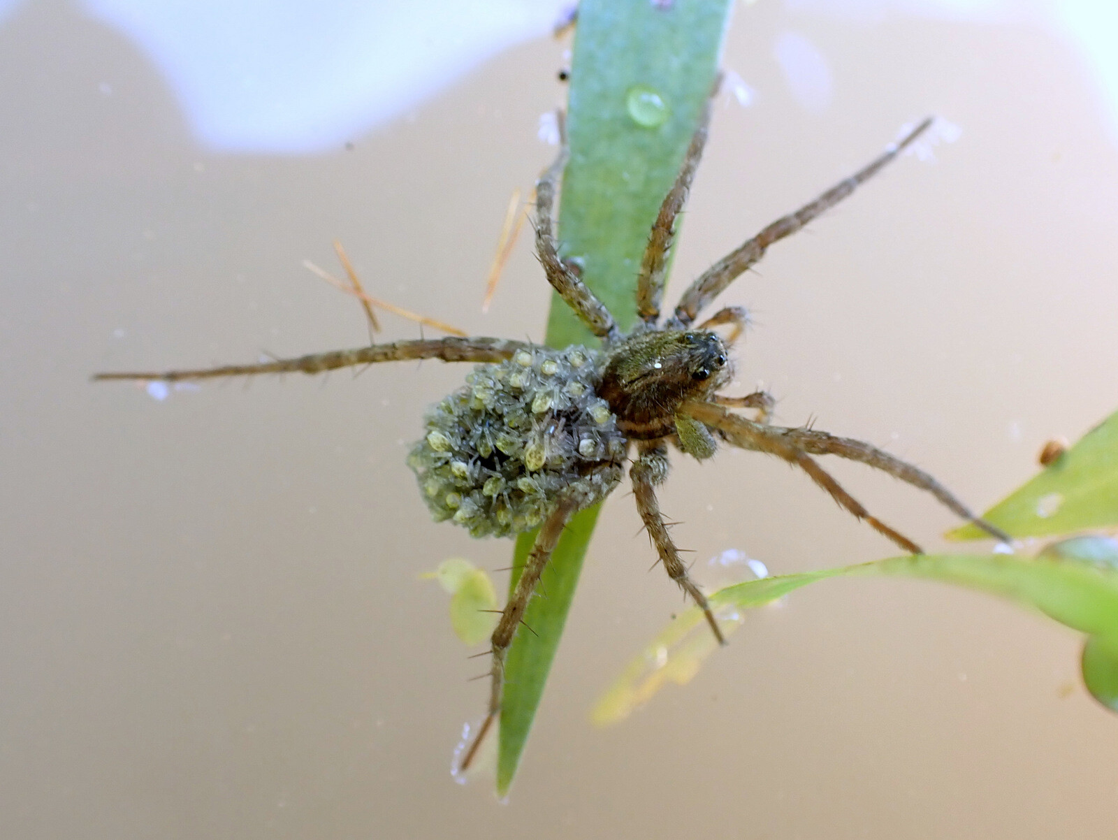卵のうを運び、生まれた子をおんぶするクモ