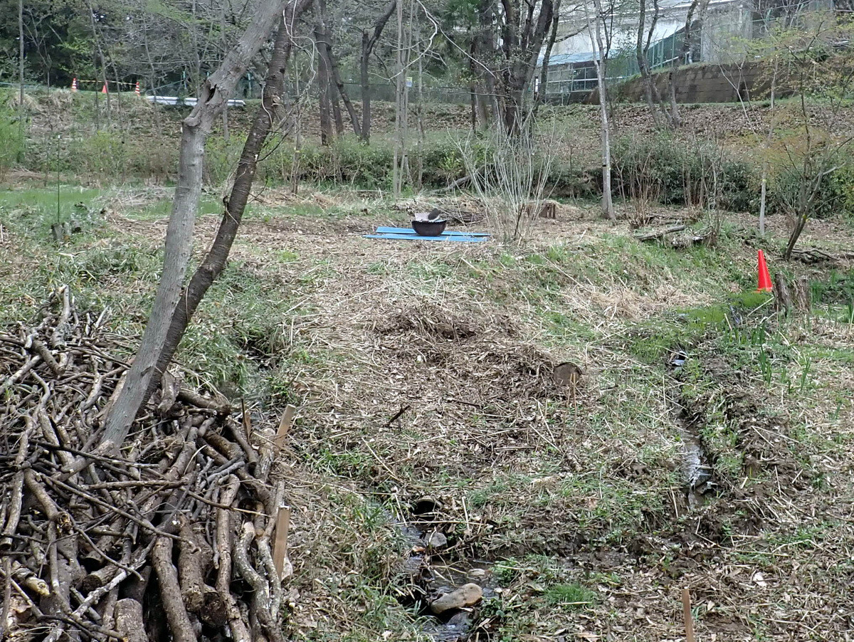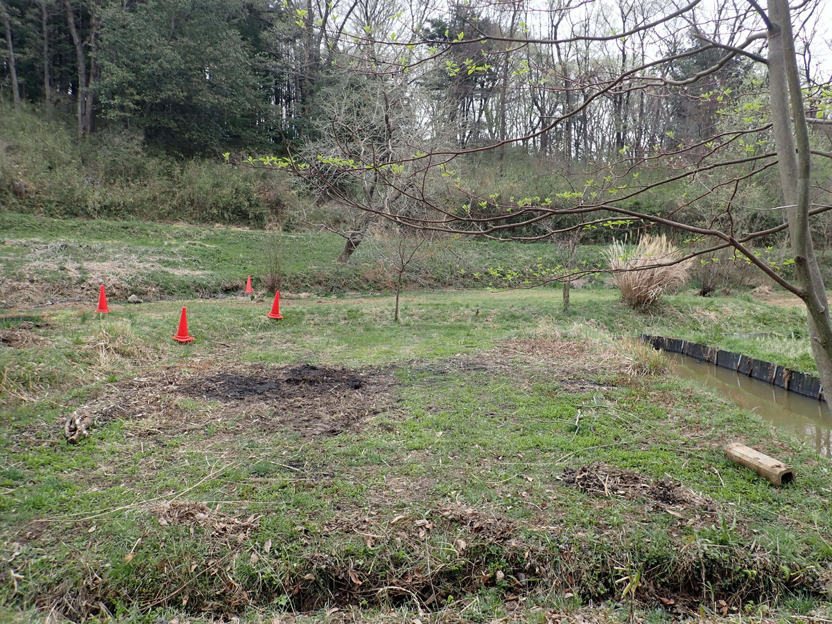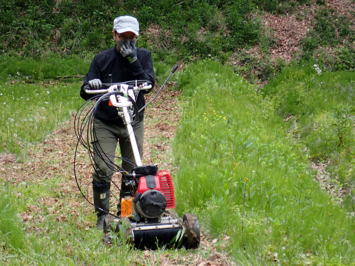 ⑤学びの道下の岩殿D、E地区、入山谷津の岩殿C、F、G、H地区は当面、草刈りを続けて草地として管理する。鎌、刈払機、草刈機(自走式スパイダーモア・ハンマーナイフモア、乗用フリーナイフモア)を使い分けて刈刃のタイプを活かした草地管理を行い、将来は草地(野原)ビオトープを目指す。