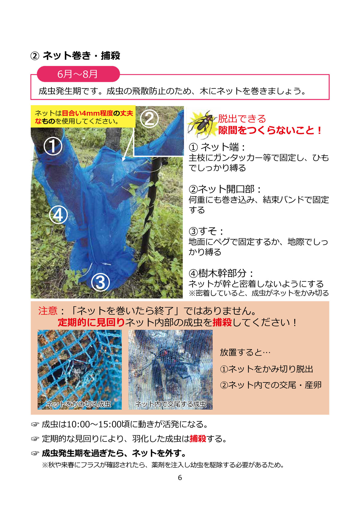 接種作業を11~2月頃までに行い、接種する種駒の量を通常の2~3倍(80~100個/本)にすると、菌のまん延が早くなるため、害菌の侵入を防いだり、接種後、最初の秋や翌年の春に発生し易くなります。