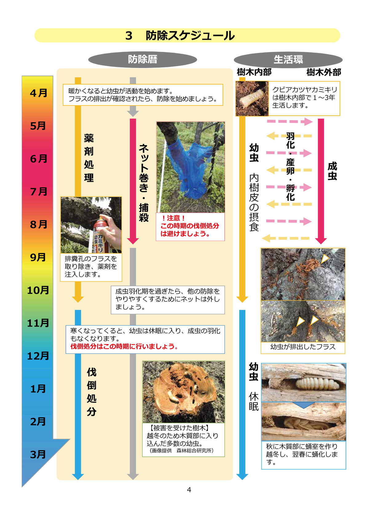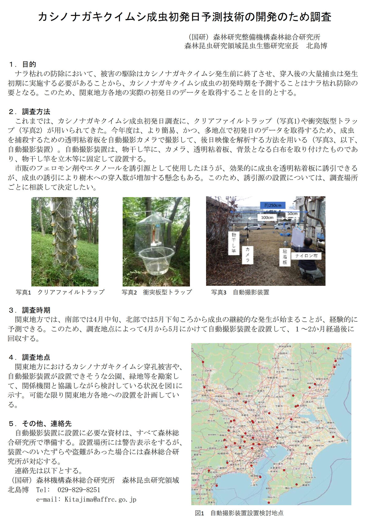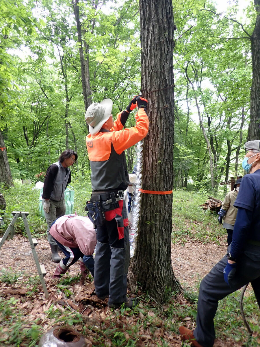 年度前半はナラ枯れ枯死木の発生を抑えるための予防活動。穿孔が始まったコナラの樹幹にカシナガトラップとクリアファイルトラップを設置してカシナガの大量捕殺を目指す(マスアタック防止のための成虫捕殺)。年度後半はコナラ枯死木内のカシナガの幼虫や成虫を殺すための駆除作業を実施。市民の森を管理する文化まちづくり公社、市役所各課、市民団体と連携して予防・駆除作業を実施し、ナラ枯れ後の市民の森づくりについても検討を進める。