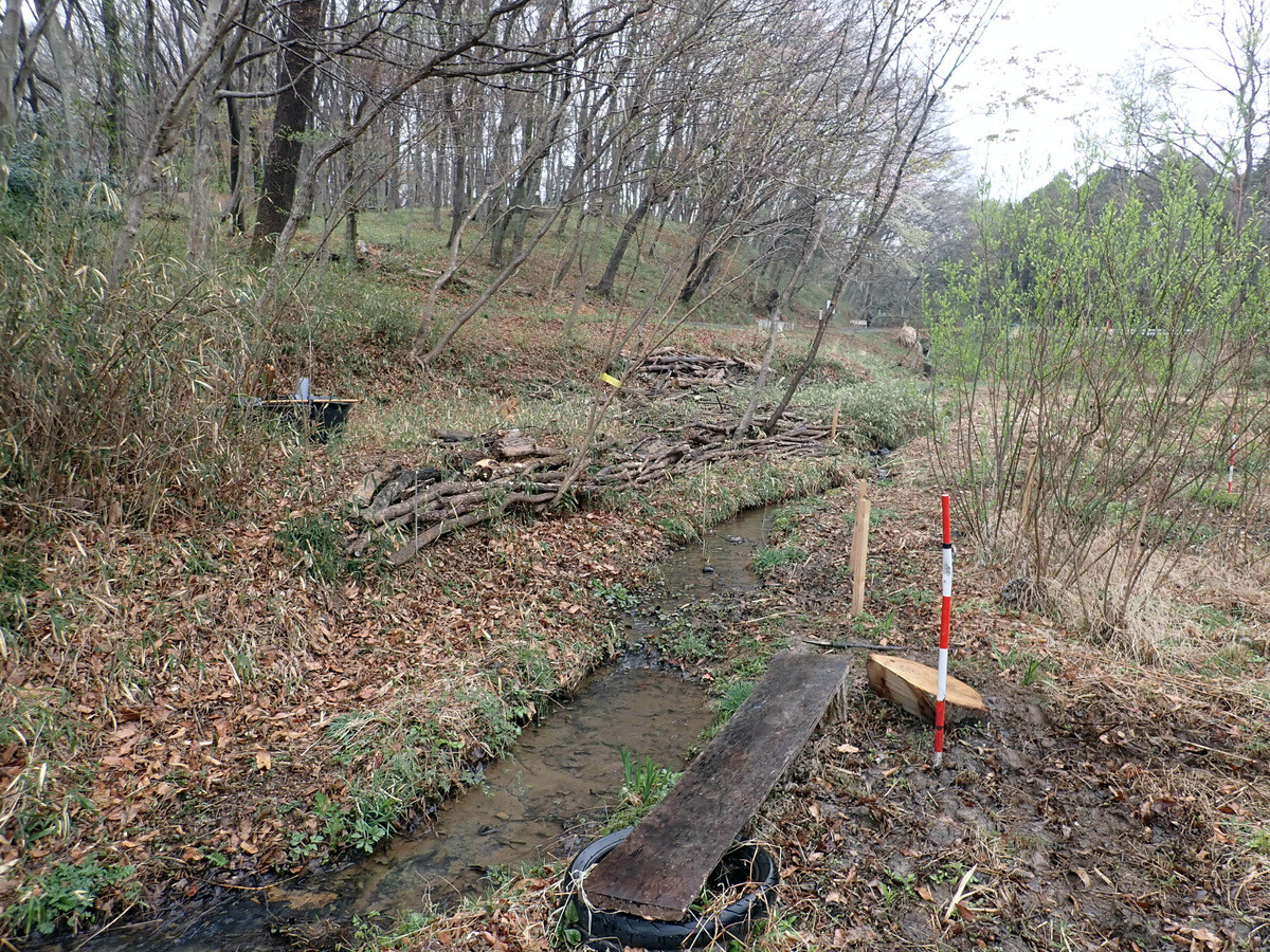 ③田んぼの畦畔を消失し、ヤナギ、ハンノキの侵入により樹林化していた岩殿I地区では耕作放棄前の田んぼの畦畔と水口・水尻を修復し、田んぼ一枚単位に水管理ができる状態に復元する。