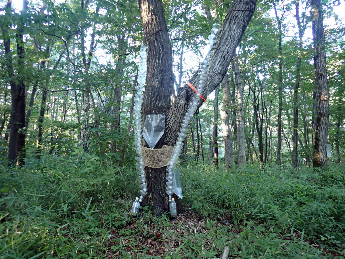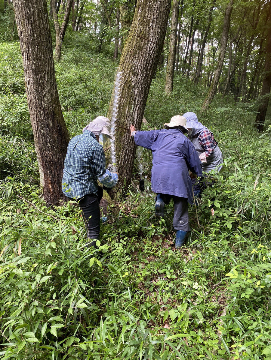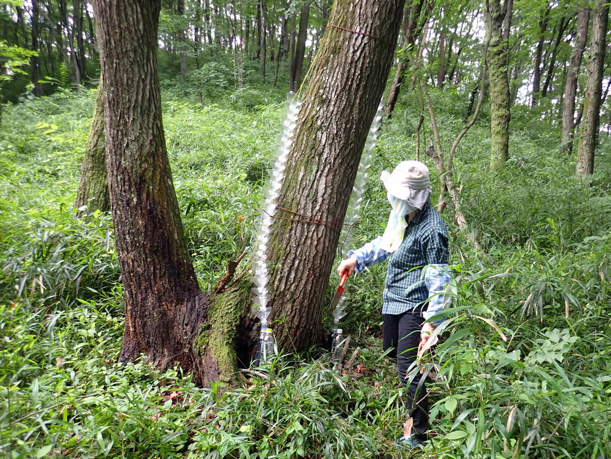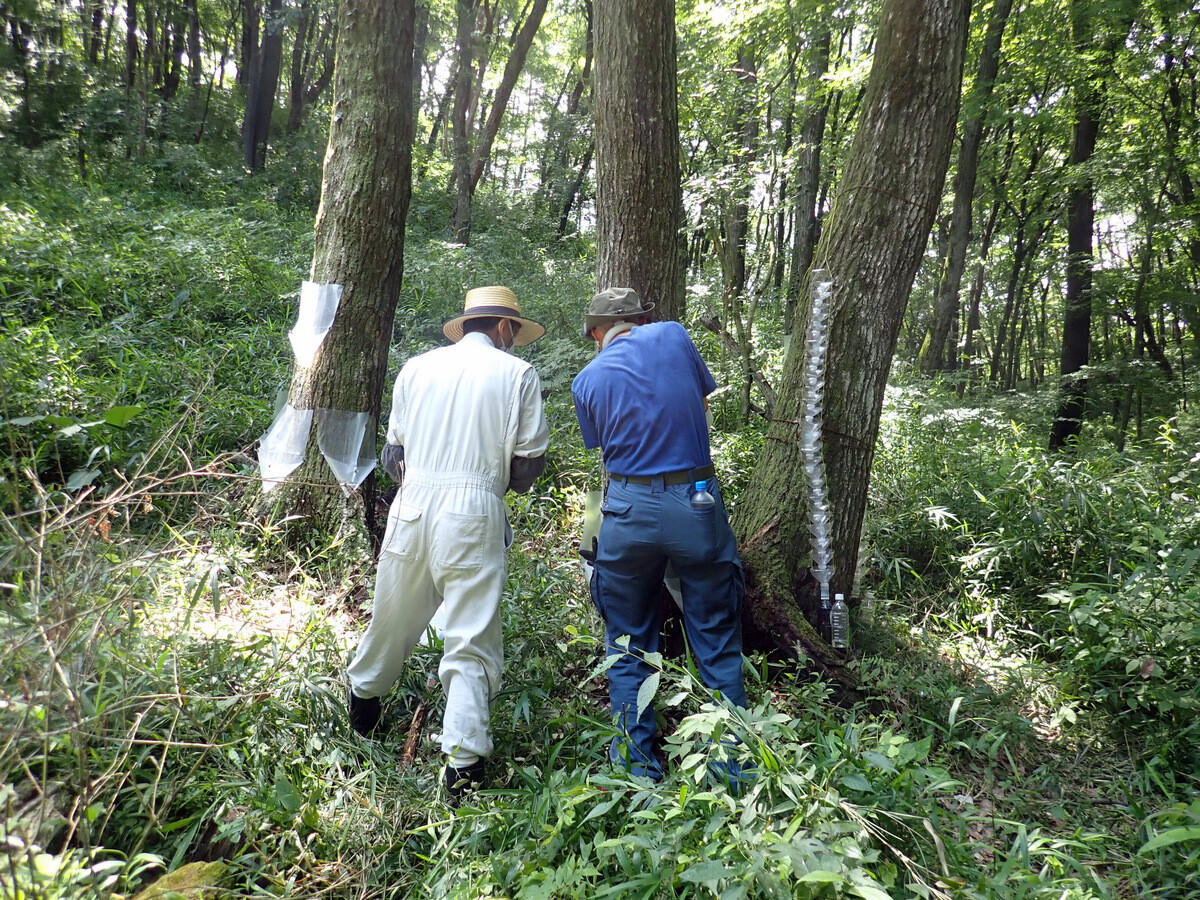 太く大きいコナラにはキクイムシが集まる……ナラ枯れの根本的な対策は、雑木林を皆伐更新(伐採して、切り株から出るひこばえを育てて若返らせること)することです。それは15年以上前に確立された学説です。生態系に配慮するなら、数百平方メートルずつ小面積皆伐更新を行うのがよいとされています。しかし、現実には小面積皆伐更新はほとんど実施されておらず、対症療法的に、ナラ枯れにかかった樹木からカシノナガキクイムシが飛び立たないようにしたり、ナラ枯れで枯死した樹木だけを伐採したりすることにとどまっています。