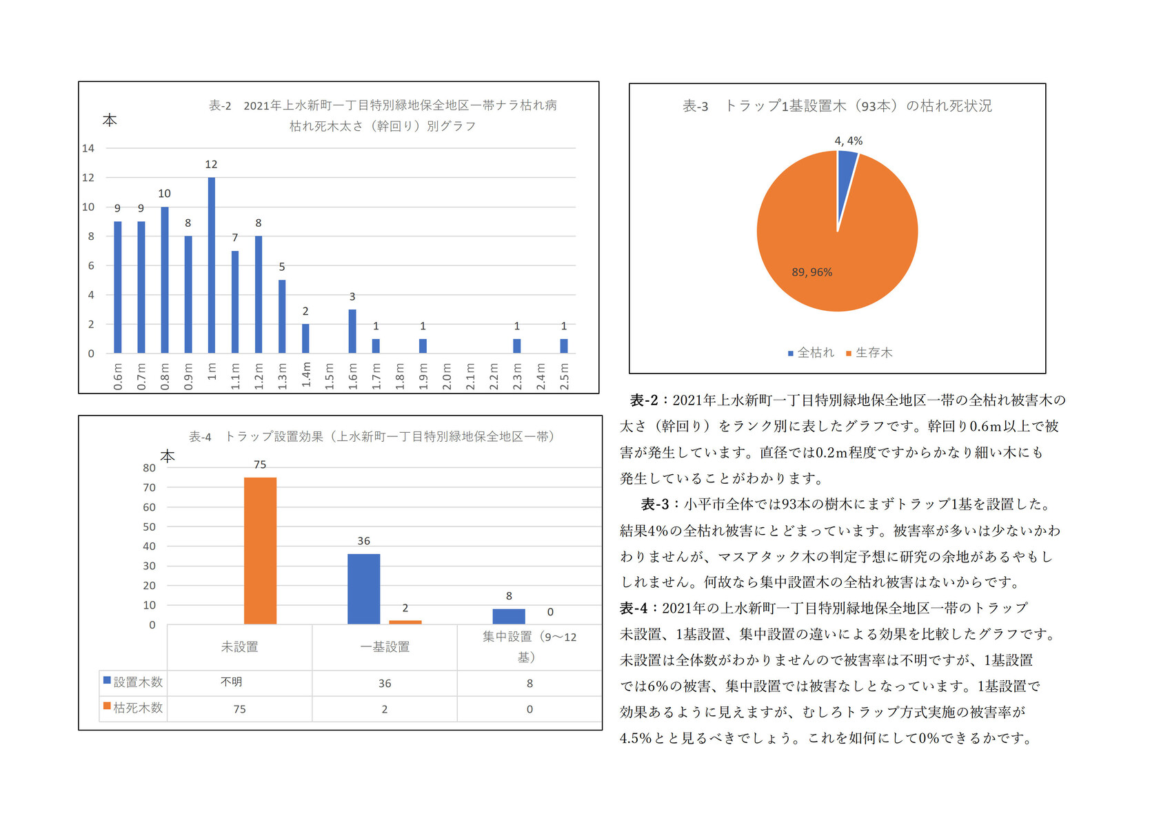 2021年の上水新町一丁目特別緑地保全地区一帯のトラップ未設置[枯死木75本]、1基設置[設置木36本、枯死木2本]、集中設置[設置木8本、枯死木0本]の違いによる効果を比較したグラフです。未設置は全体数がわかりませんので被害率は不明ですが、1基設置では6%の被害、集中設置[9~12基]では被害なしとなっています。1基設置で効果あるように見えますが、むしろトラップ方式実施の被害率が4.5%と見るべきでしょう。これを如何にして0%できるかです。【[]内は引用者追加】