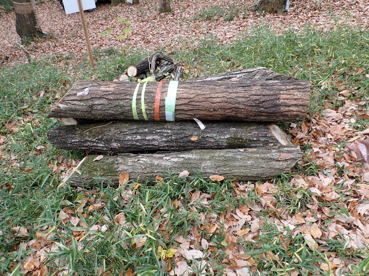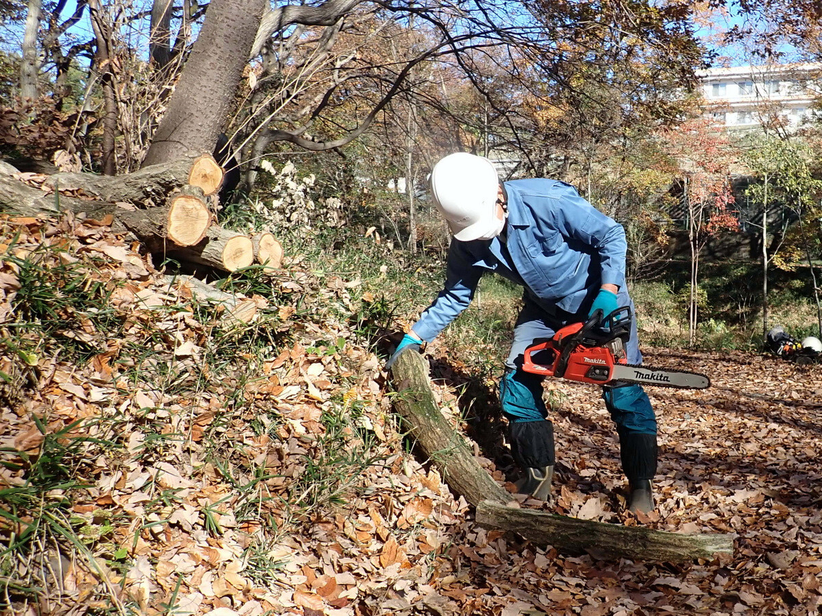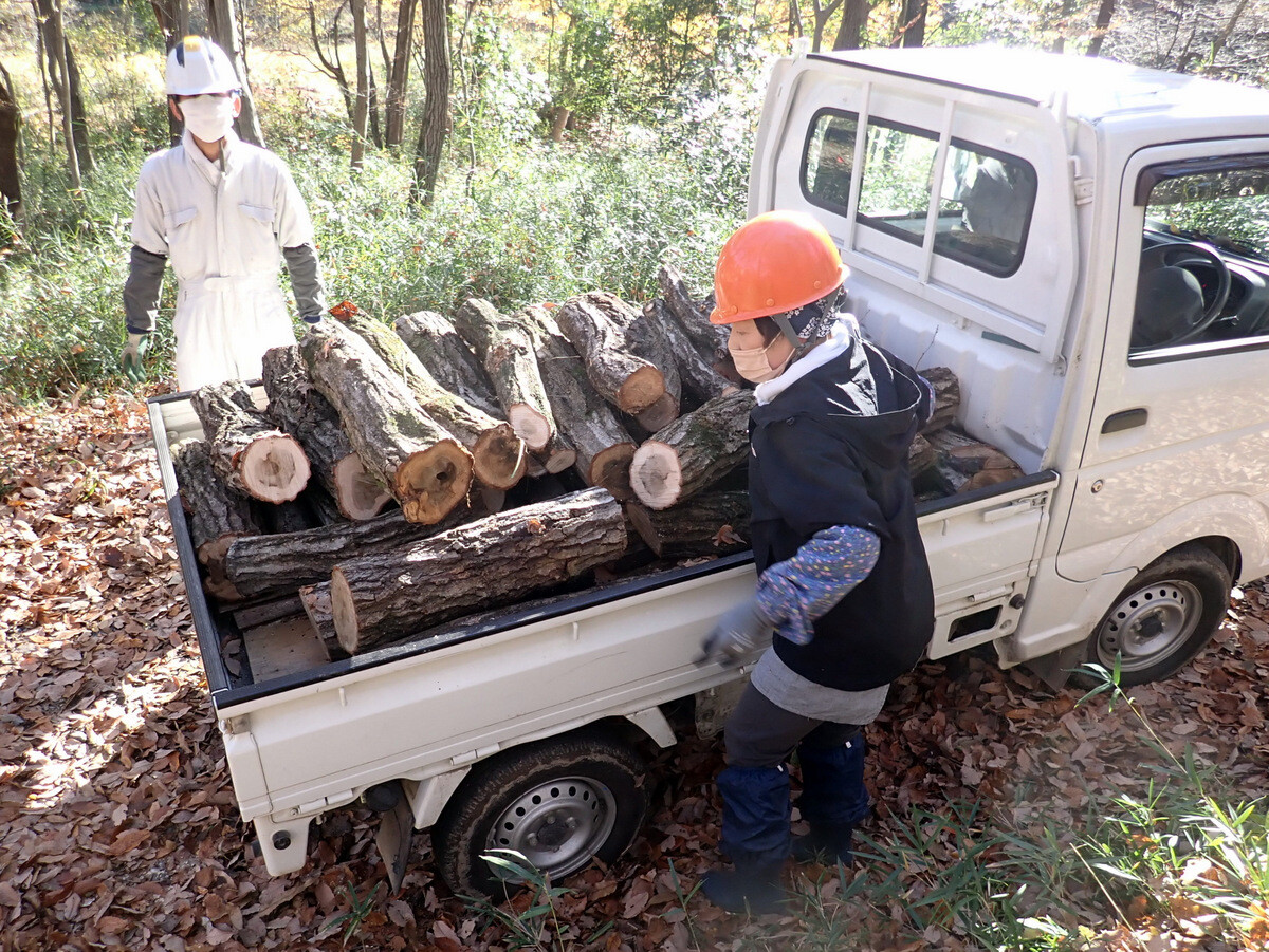 伐採木を~30㎝に玉切りし、乾燥させて幹内のカシナガを殺虫。