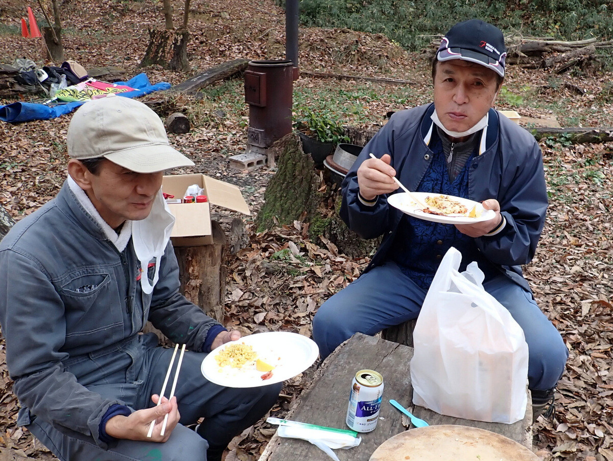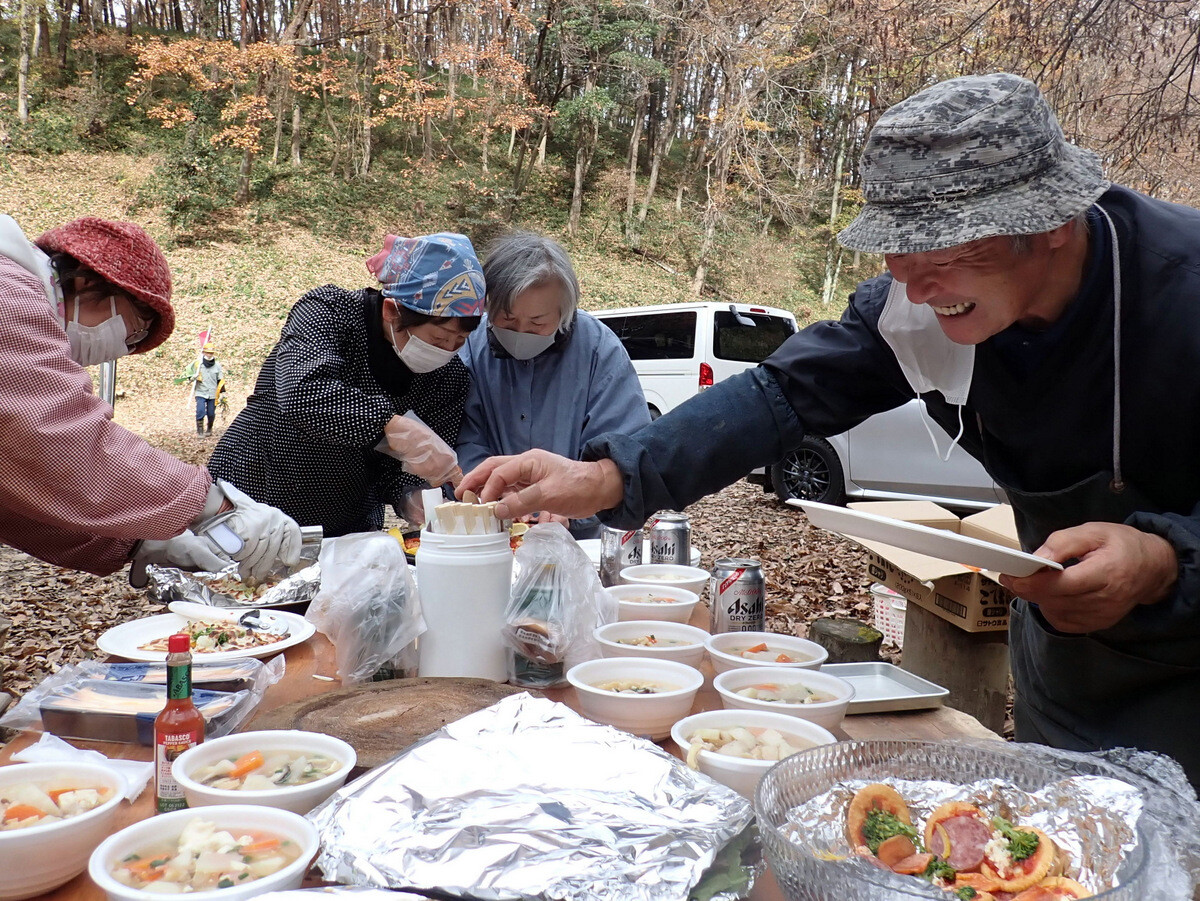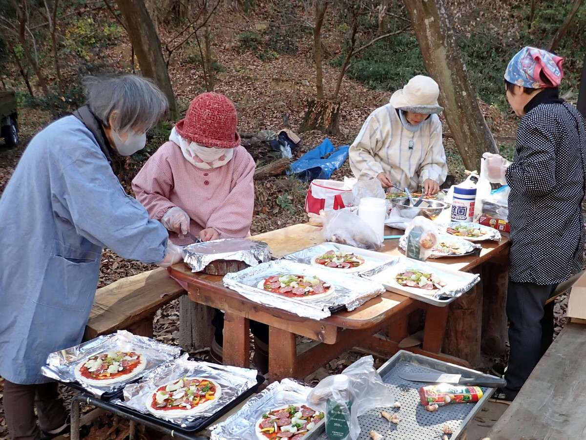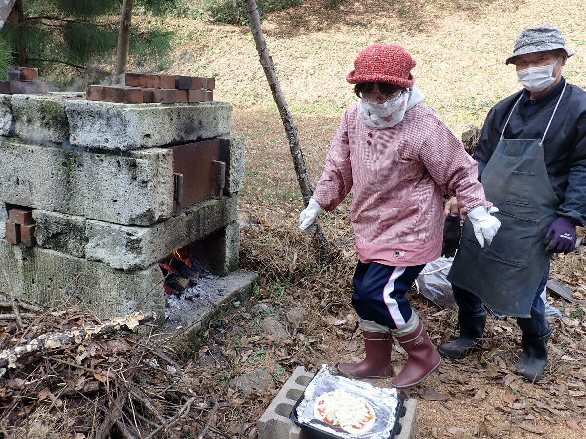 11月19日のイベントの慰労も兼ねて大谷石のピザ釜でピザを焼いて岩殿C地区で軽食会をしました。ピザやサイドメニューは木庭さん、新倉さん、細川さん、丸山さん、ピザ釜とカマドの火の番は江原さん、片桐さん、金子さんが担当しました。