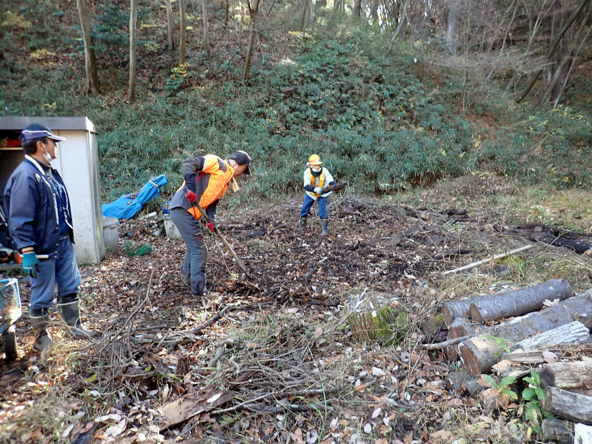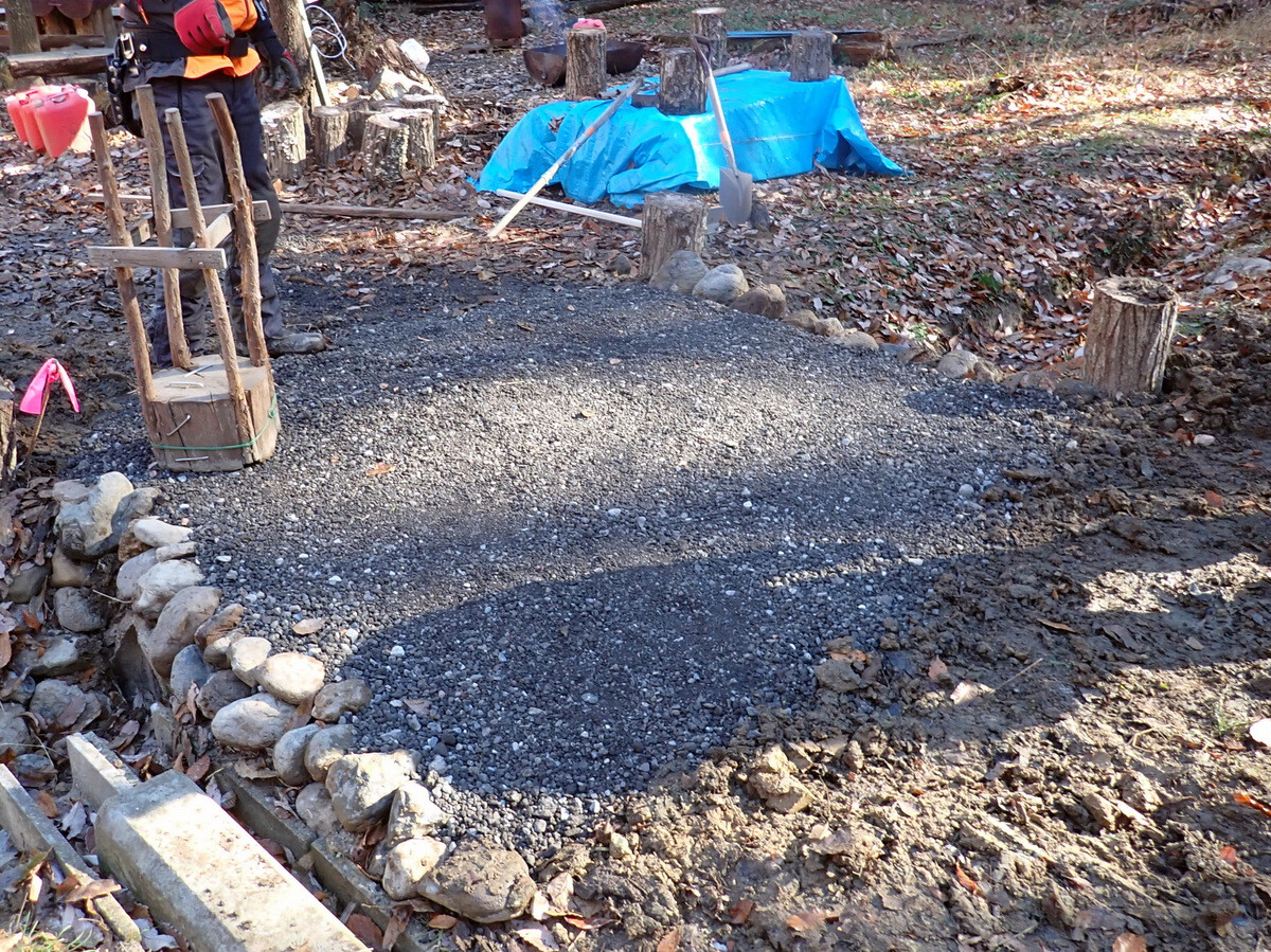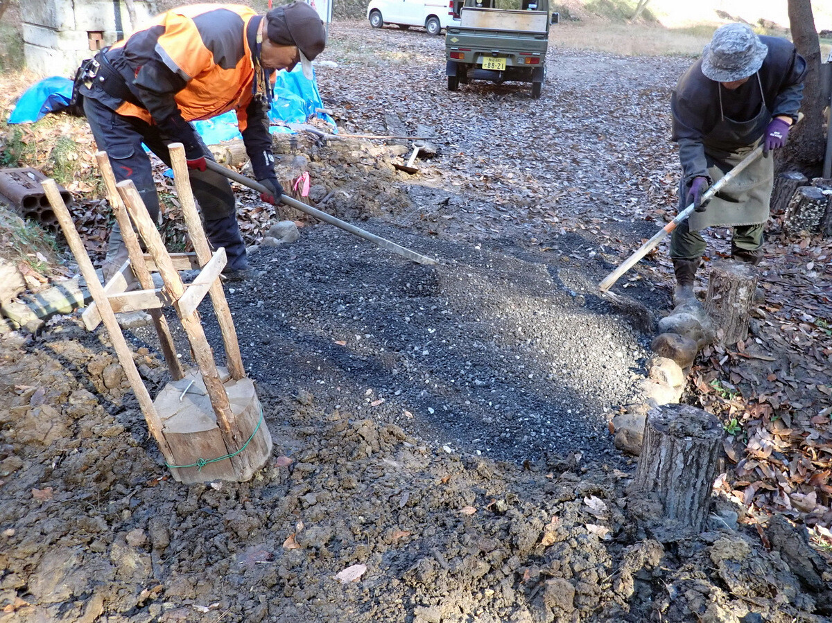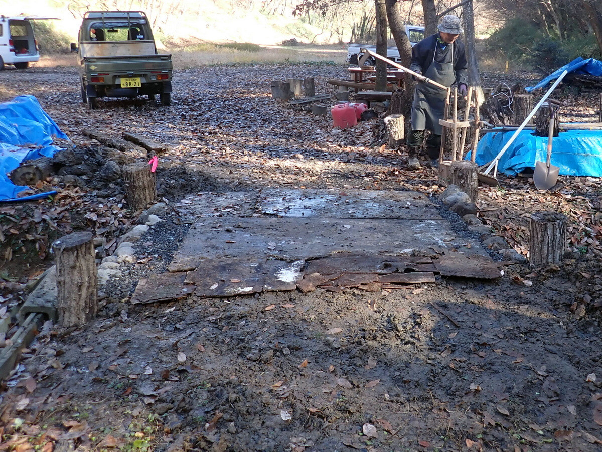 食事の準備に併行して、積み上げたまま放置していた伐採残材の片付け、土橋の橋板増設、駐車スペースの排水溝掘りなどの作業もしました。