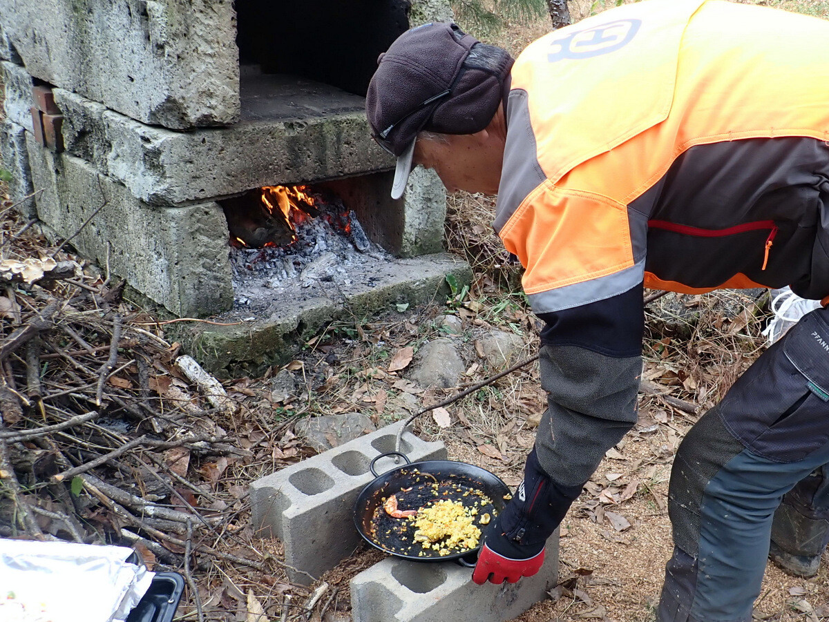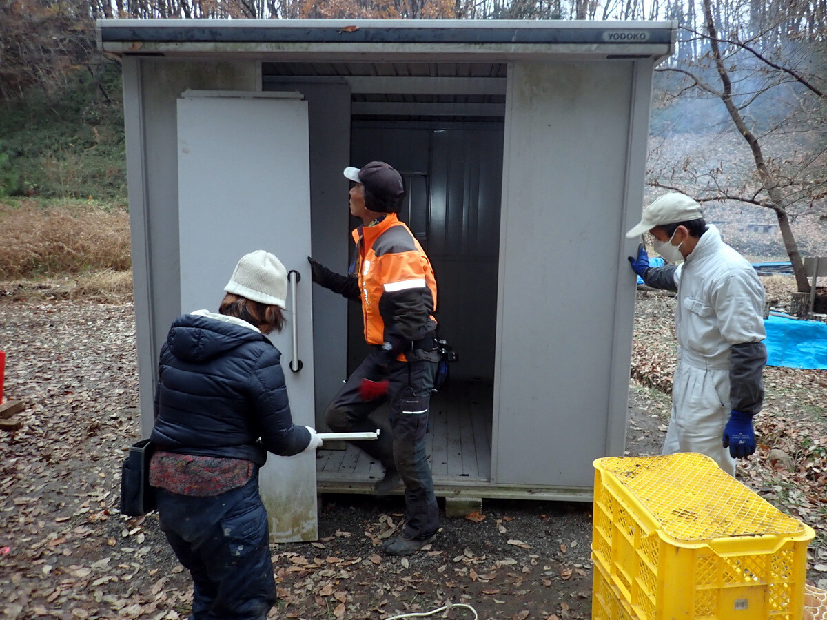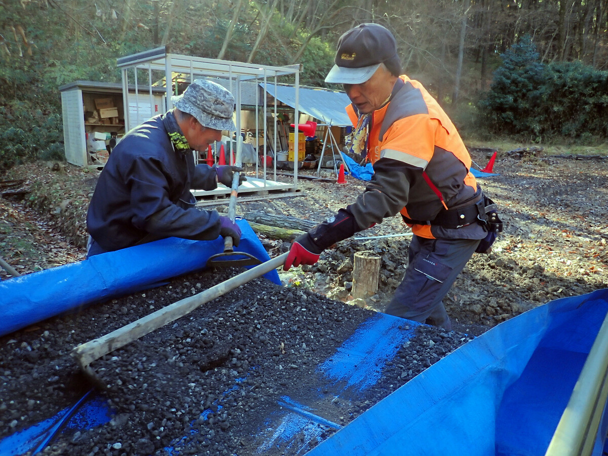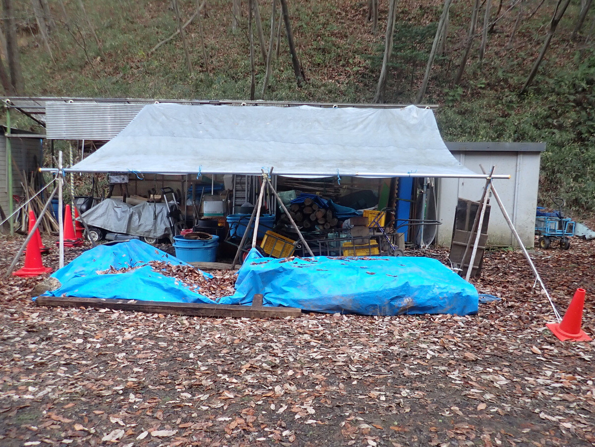 食事の準備に併行して、積み上げたまま放置していた伐採残材の片付け、土橋の橋板増設、駐車スペースの排水溝掘りなどの作業もしました。
