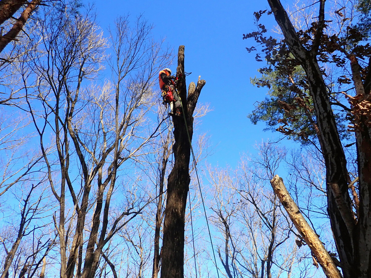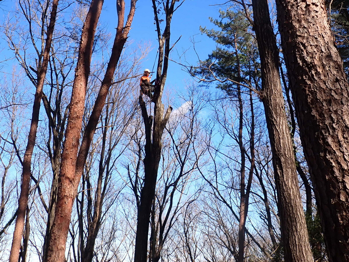 ナラ枯れ枯死木№134(目通り直径52㎝、樹齢52)は高所作業で伐採しました。