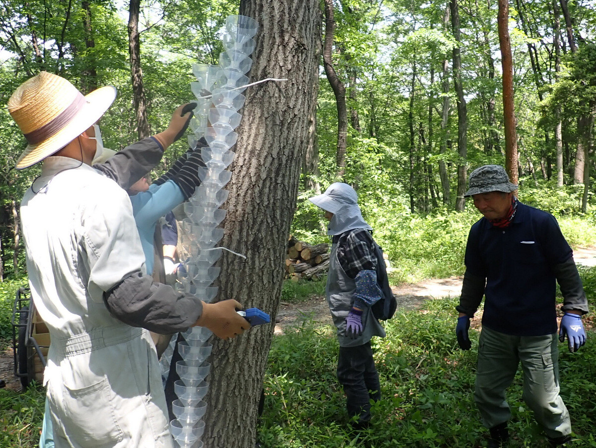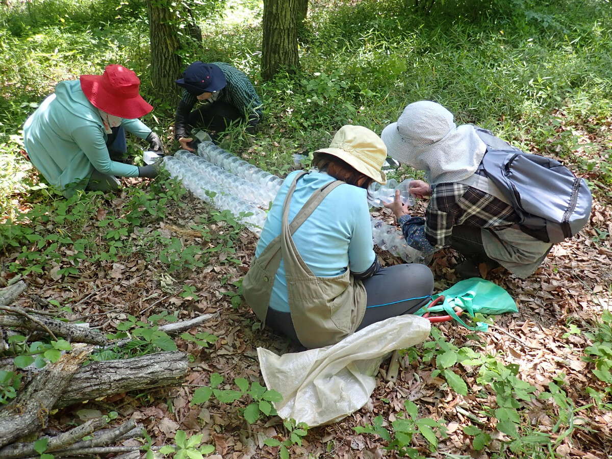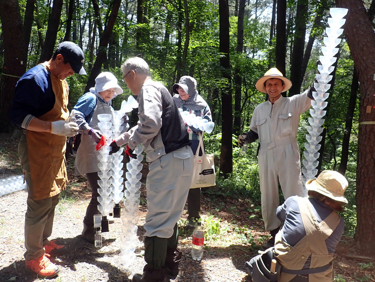 市民の森保全クラブ定例作業日。参加者は芦田さん、江原さん、片桐さん、金子さん、木谷さん、小松さん、斉藤さん、鳥取さん、新倉さん、細川さん、丸山さんとHikizineの12名。カシナガトラップの設置を始めました。