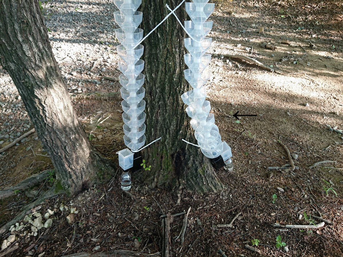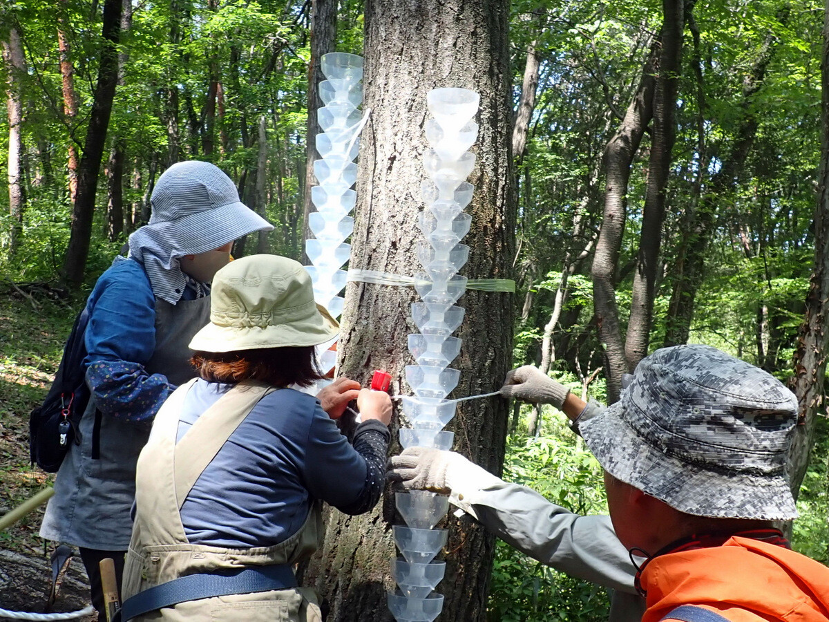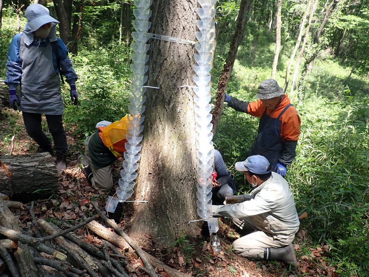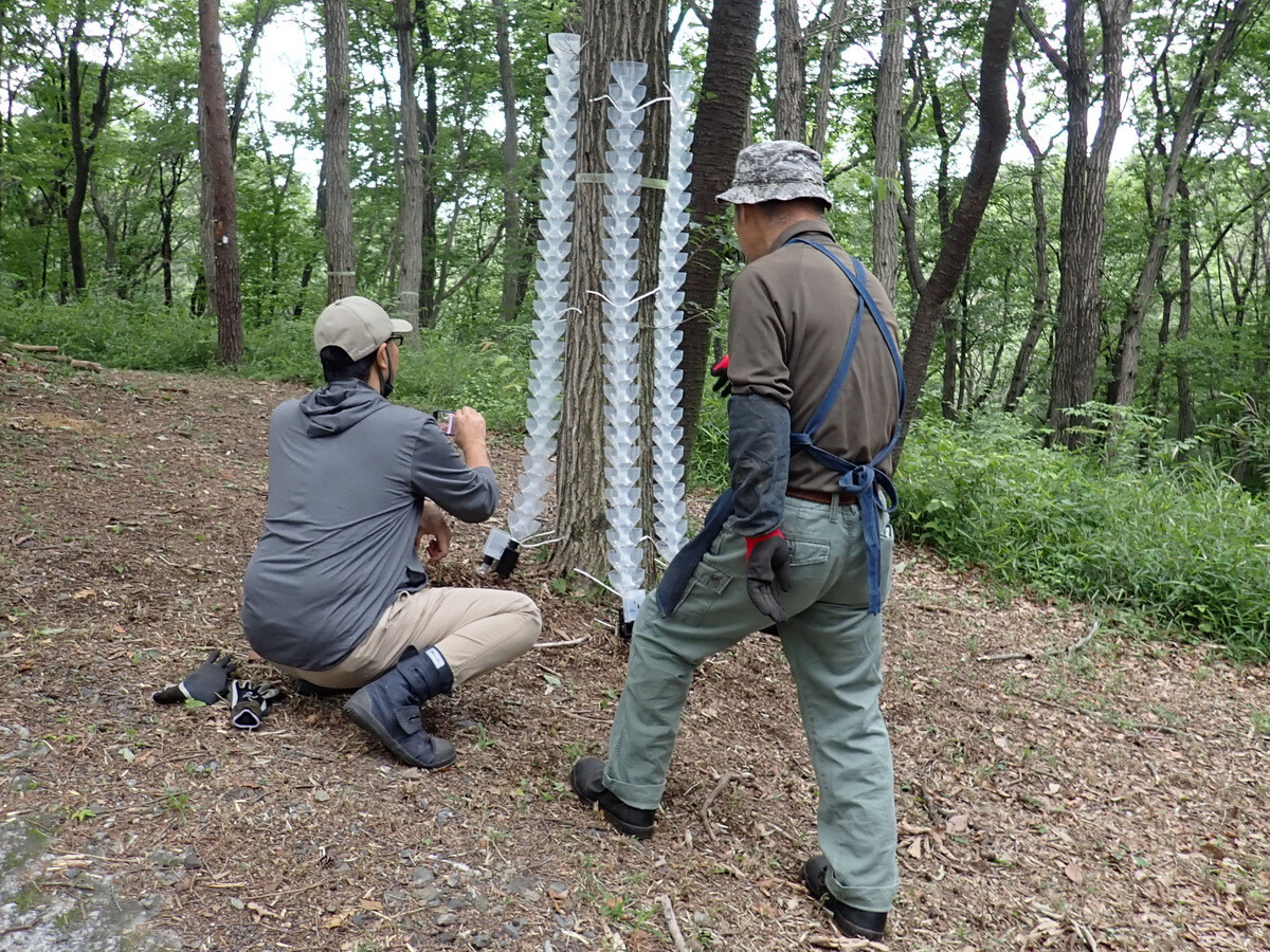 市民の森追加作業日。参加者は江原さん、木谷さん、鳥取さん、細川さんとHikizineの5名。尾根の道でトラップの設置をしました。5日につけたトラップにカシノナガキクイムシが入っていました。