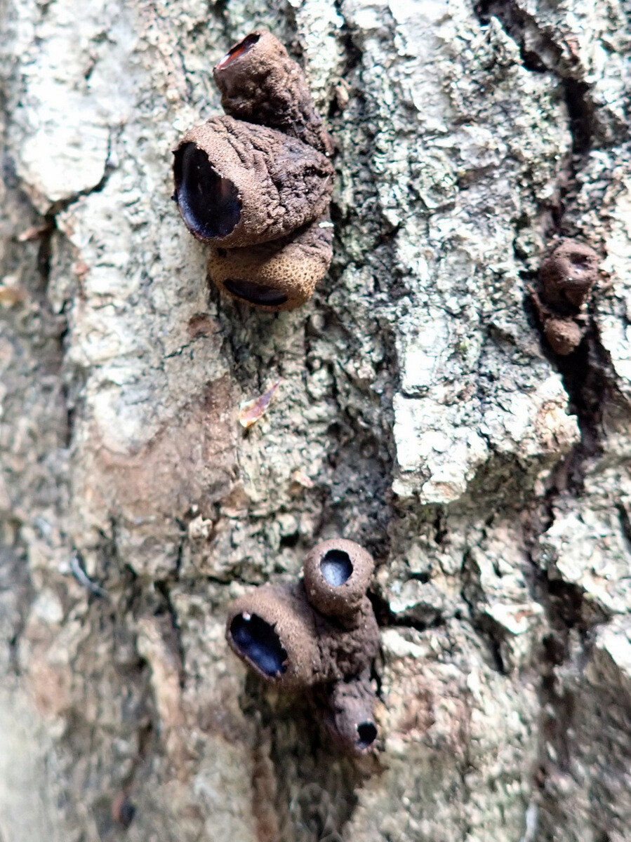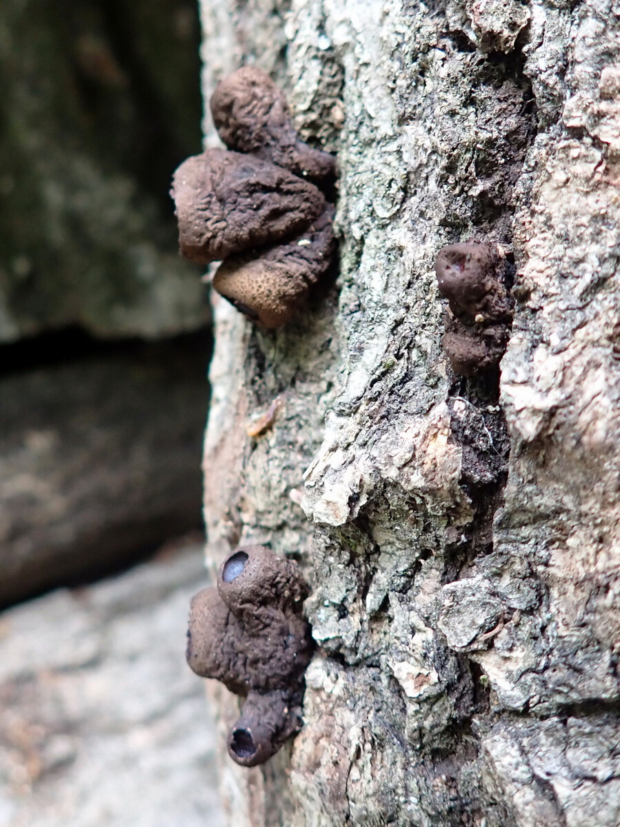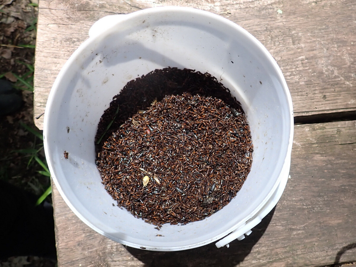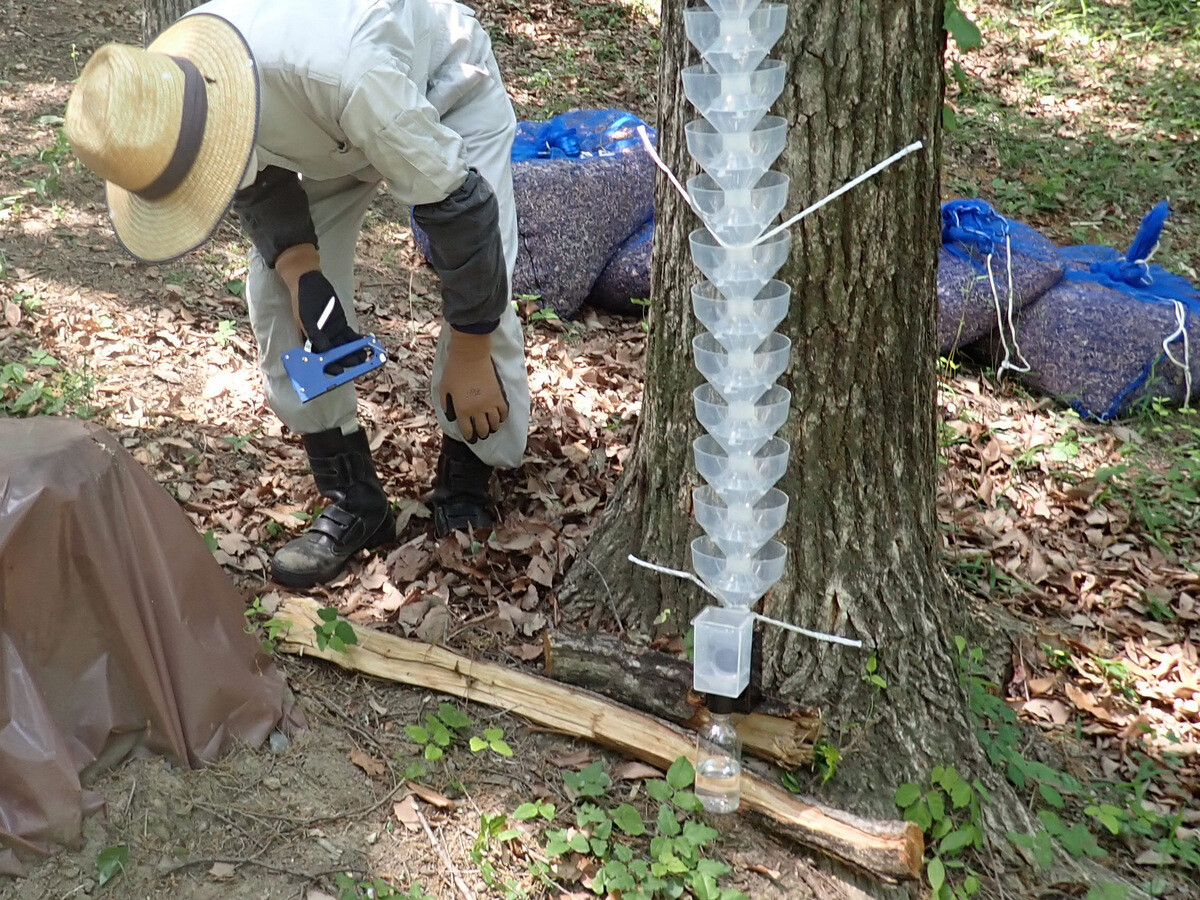 市民の森追加作業日。参加者は江原さん、木谷さん、鳥取さん、細川さんとHikizineの5名。尾根の道でトラップの設置をしました。5日につけたトラップにカシノナガキクイムシが入っていました。