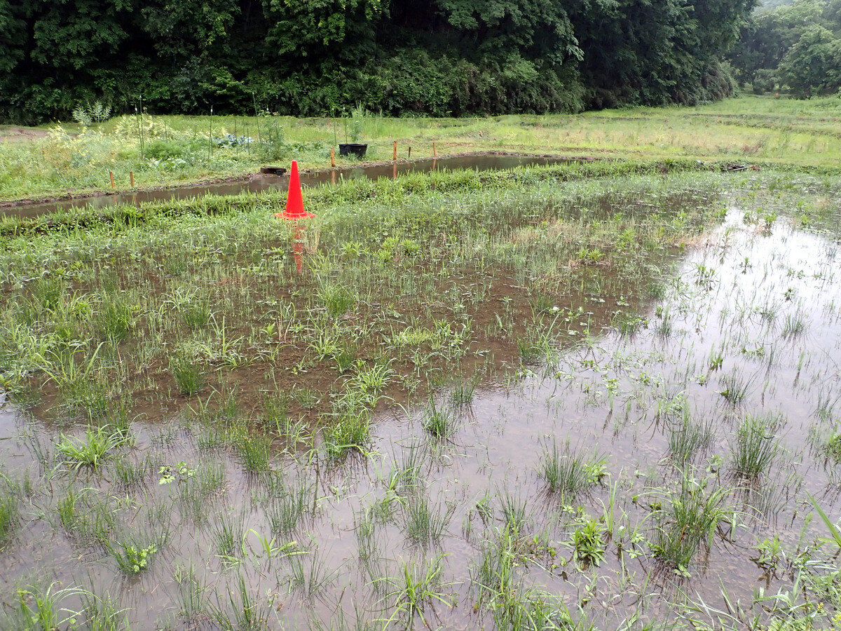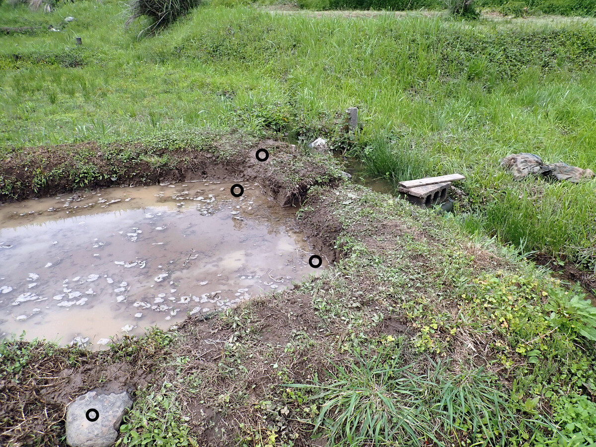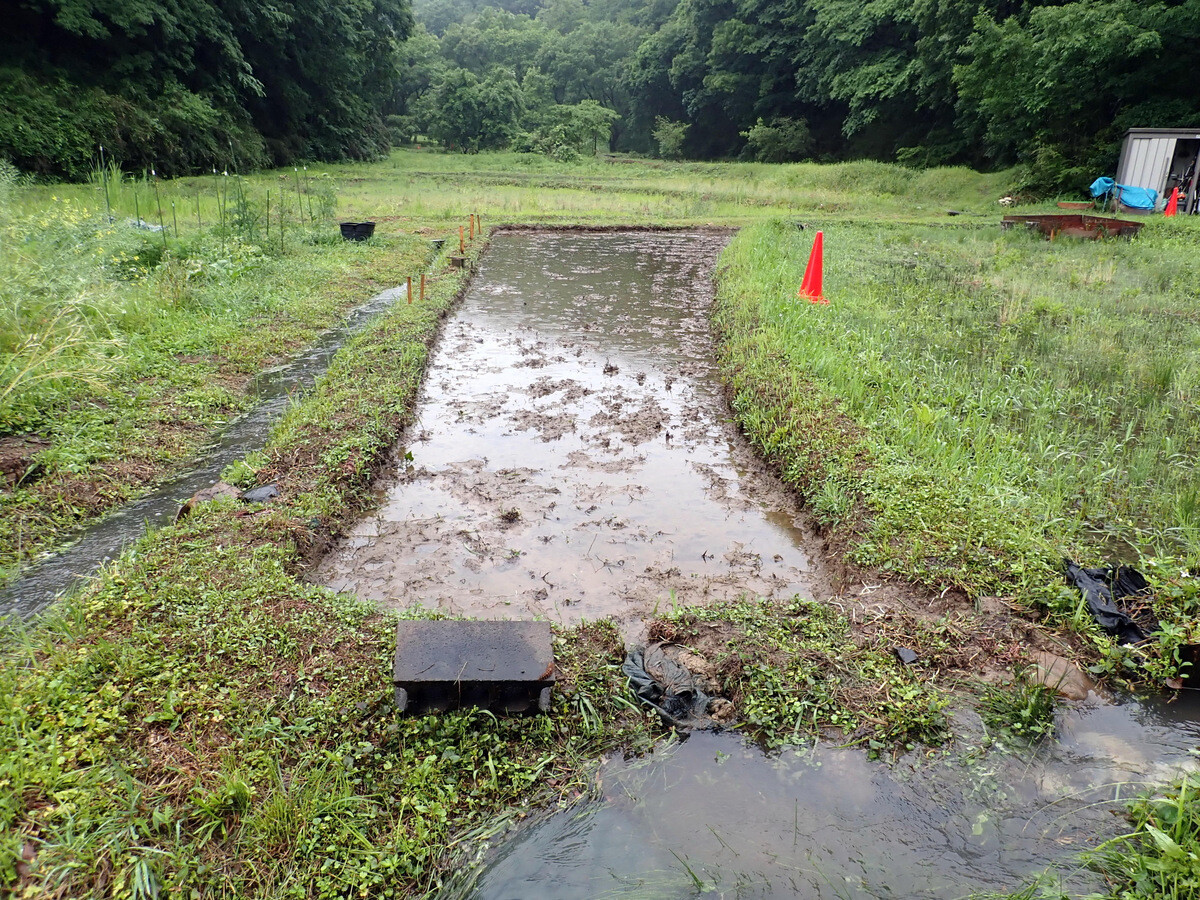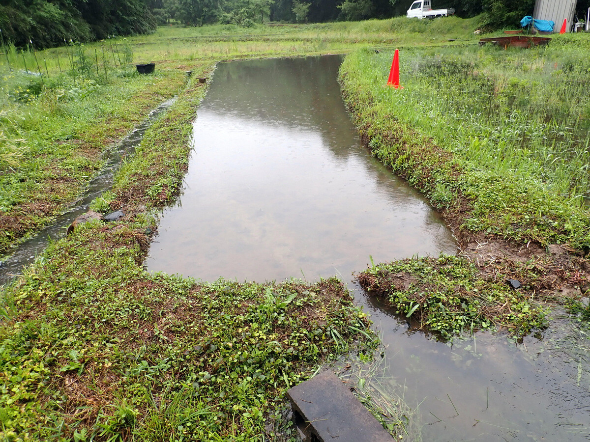 昨日、今日の2日間、雨が降った(鳩山アメダスの降水量8.0㎜)ので、畦塗りをするのには充分な深さで田んぼに水が溜まっていましたが、後日に実施することにして、今日は田んぼの改造をしました。田んぼの四隅を削り、受水口、排水口の付け替えをして田んぼの作付可能面積が2㎡ほど増えました。