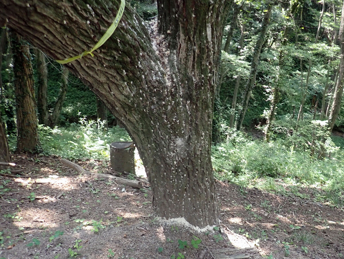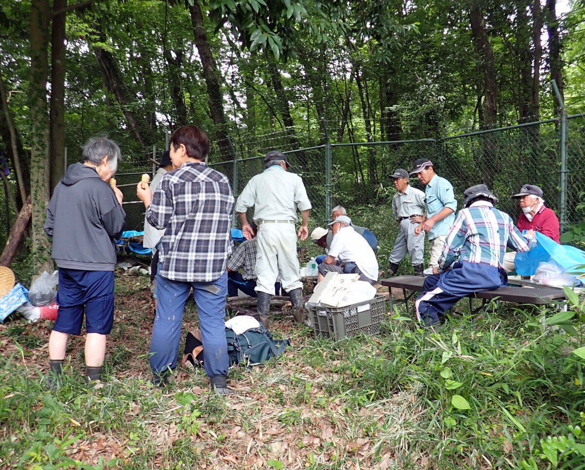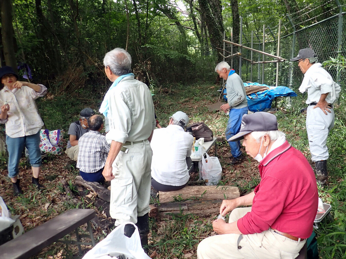 市民の森保全クラブ定例活動日。参加者は芦田さん、新井さん、江原さん、金子さん、木庭さん、木谷さん、木庭さん、鳥取さん、新倉さん、細川さん、丸山さん、鷲巣さん、Hikizineの12名。トラップの保守点検・カシナガ回収、刈払機で更新・皆伐エリアの篠刈り・アカメガシワなどの除伐、作業道・南向き斜面の草刈り、樹冠上部が腐朽して折損して作業道に落下する危険がある2本に株立ちしているコナラの1本の伐採をしました。