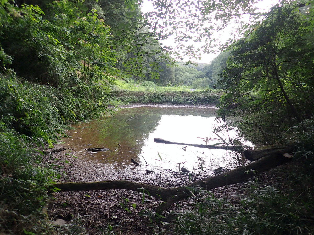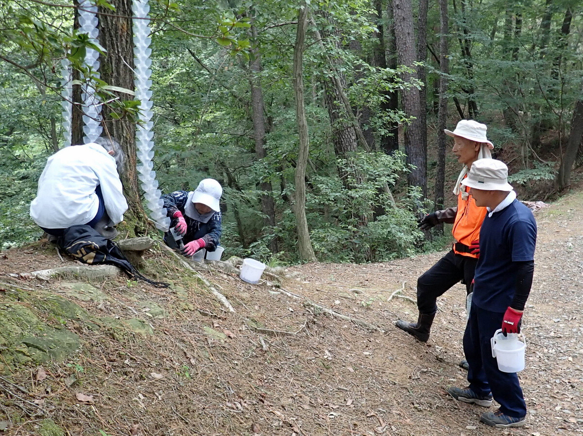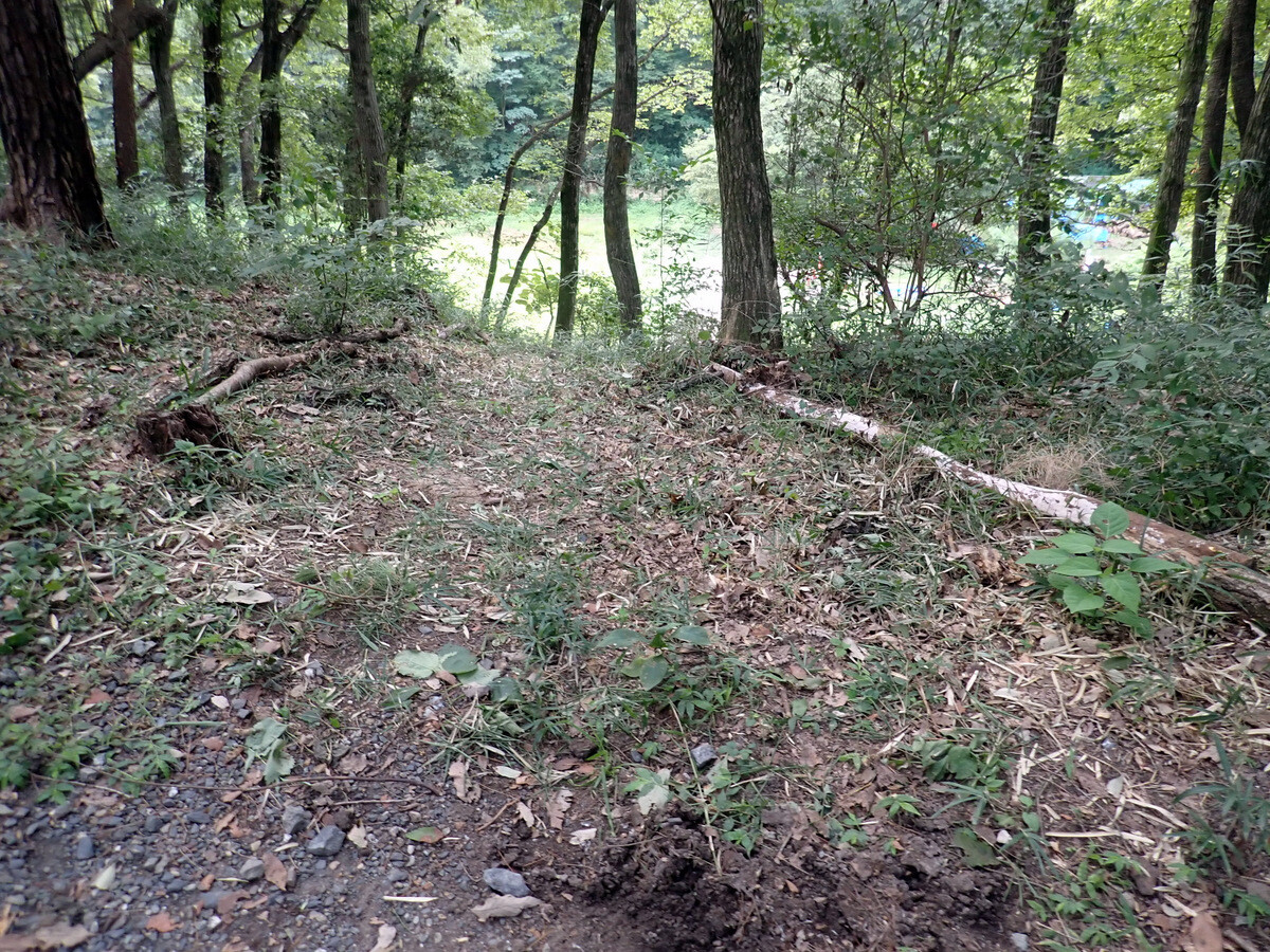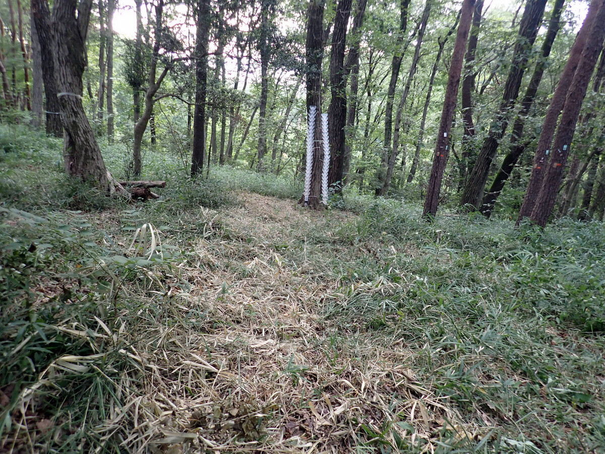 猛暑が続いています。市民の森保全クラブ、8月最初の活動日。参加者は芦田さん、新井さん、江原さん、金子さん、木谷さん、鳥取さん、新倉さん、細川さん、丸山さん、鷲巣さん、渡部さん、Hikizineの12名。炎天下での作業を避けて尾根の道の四阿付近で活動しました。10月21日に市民の森で実施される文化まちづくり公社主催『自然学習ウォーキング 市民の森であそぼう!』で市民の森保全クラブが実施する「森の作業体験 伐採したコナラの枝をノコギリで切ってみよう!」で使うコナラ枯死木選びました。当日はボッシュ林-青木ノ入-入山沼から現場に来るコースが設定されています。ボッシュ林内でプログラムを追加できないか、公社の原島さん、岩崎さんと渡部さん、Hikizineで検討しました。