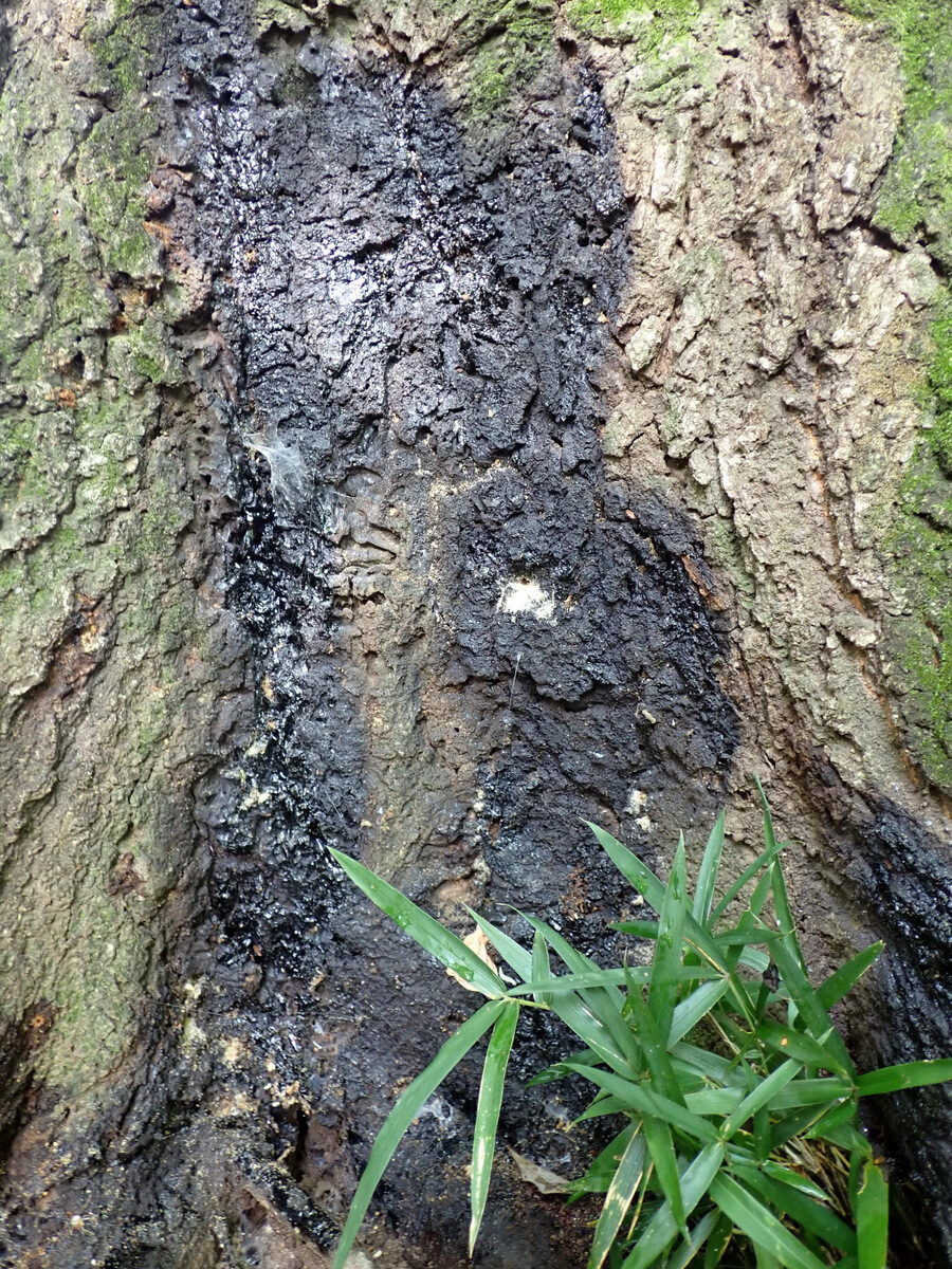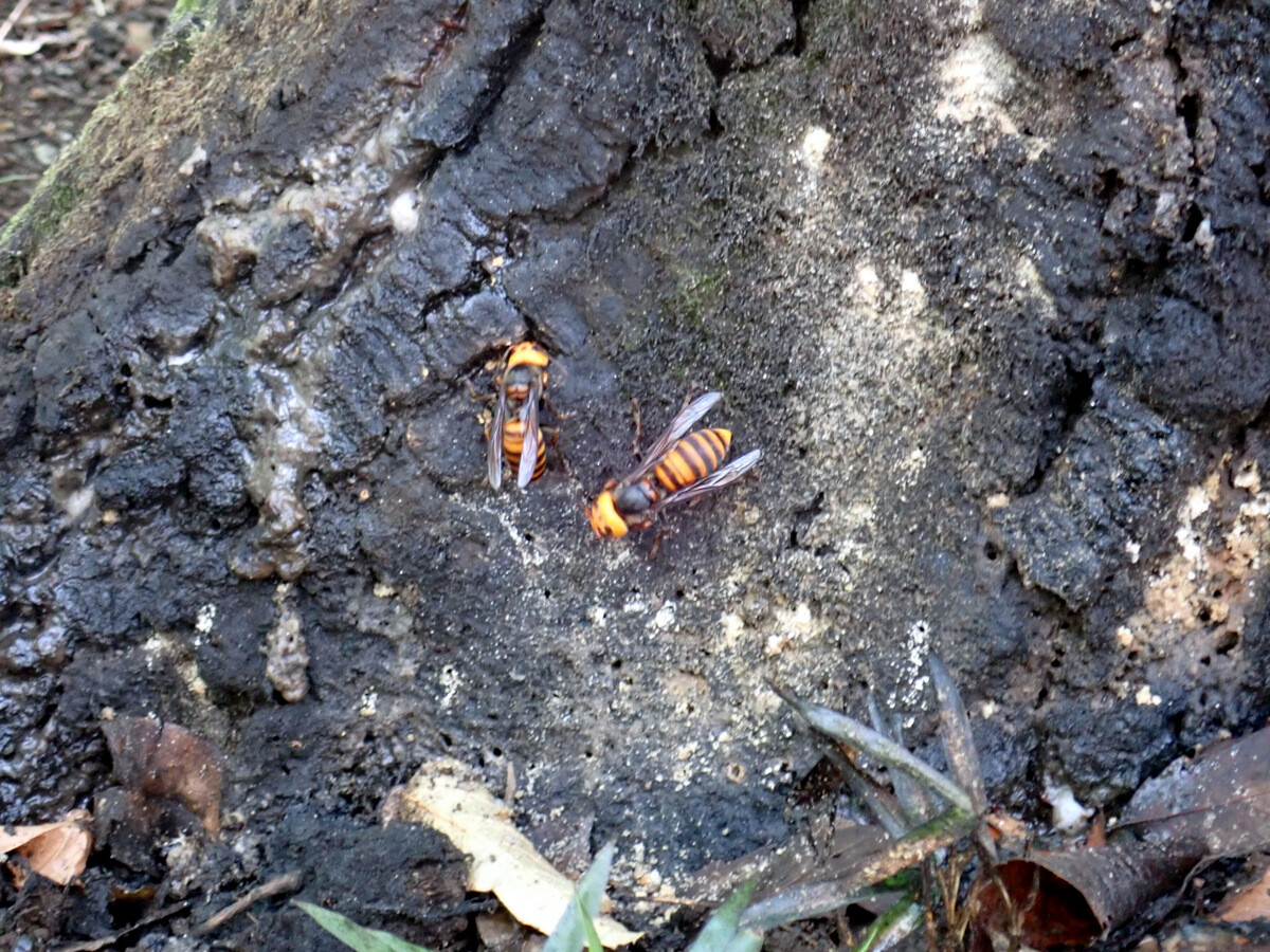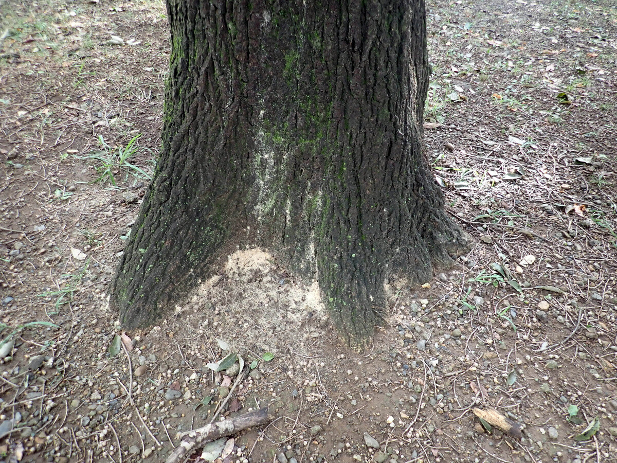 桜木神社(下新井1360番)のシラカシ2本は根元にフラスが堆積していました。
