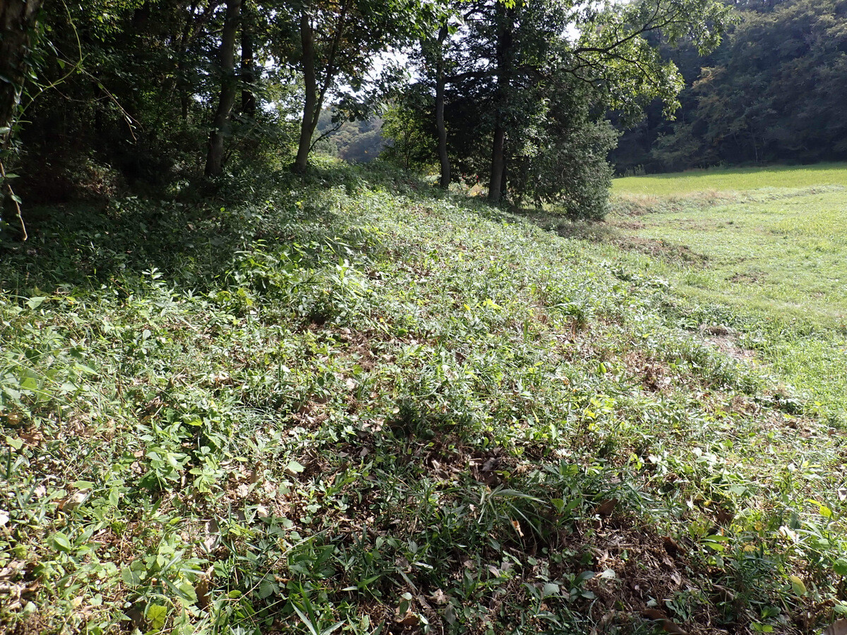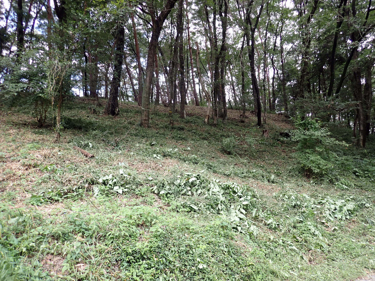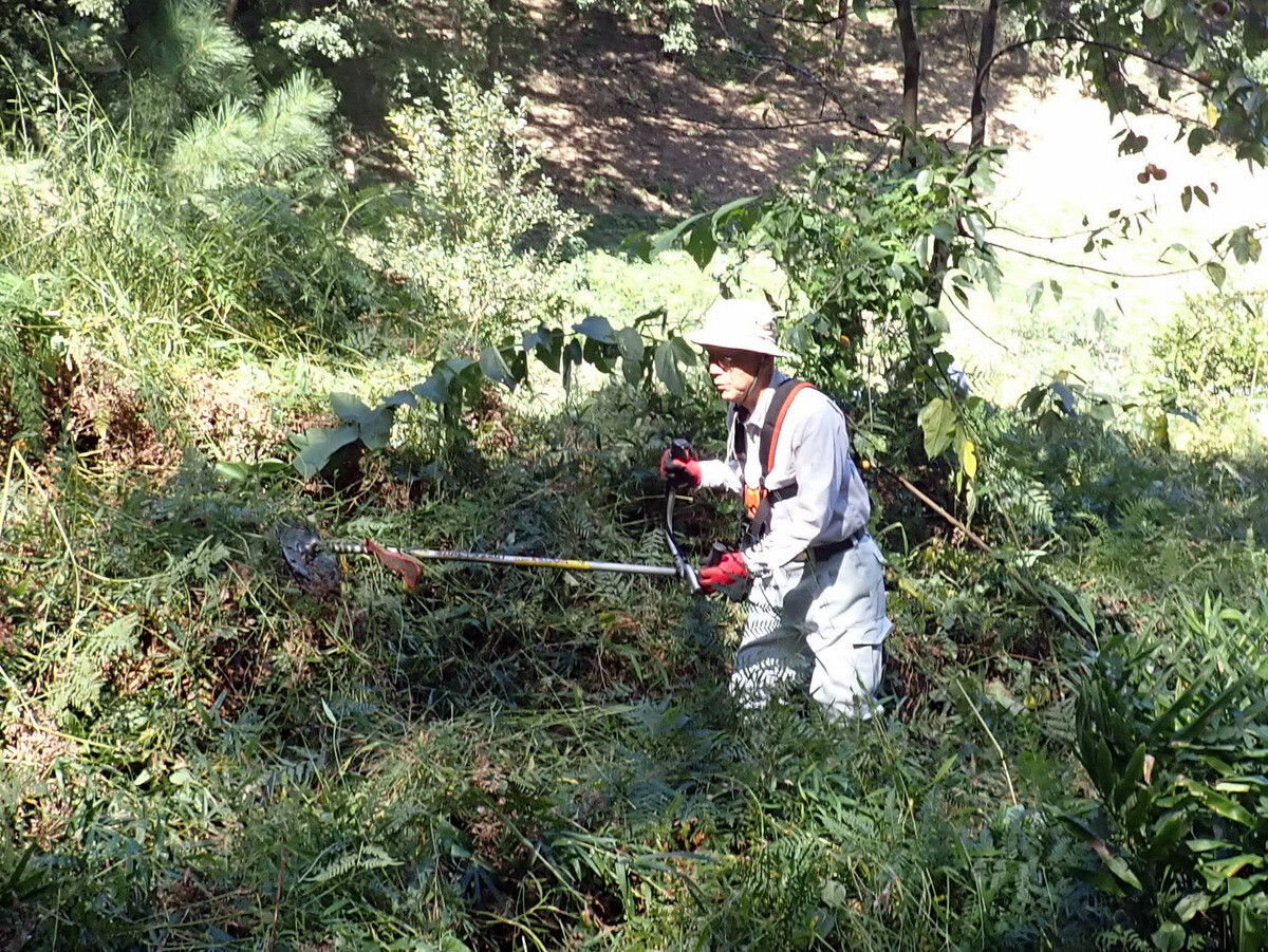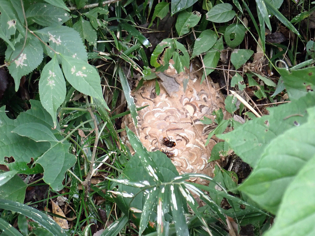 江原さんが南向き斜面の草刈り中にスズメバチの巣を発見。巣の大きさは20㎝以上はありそうです。