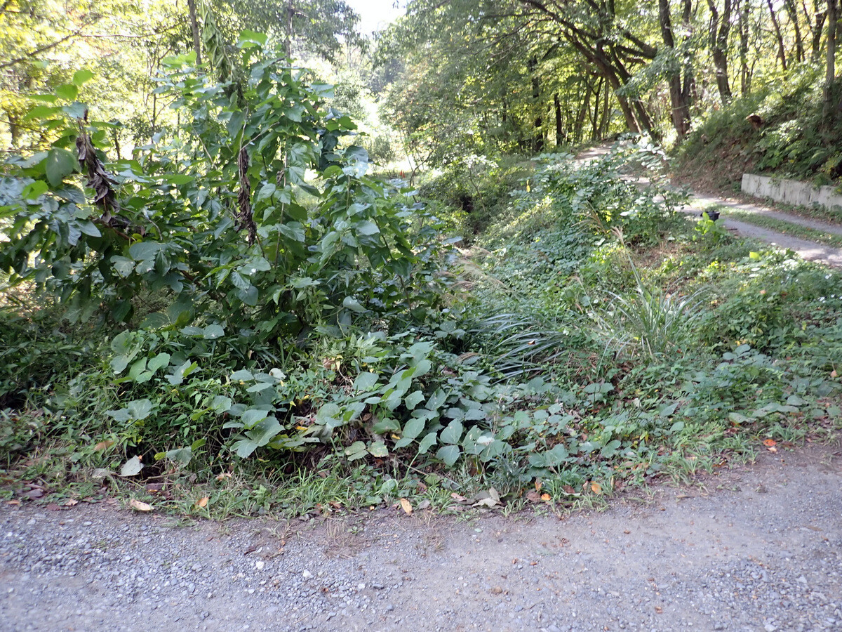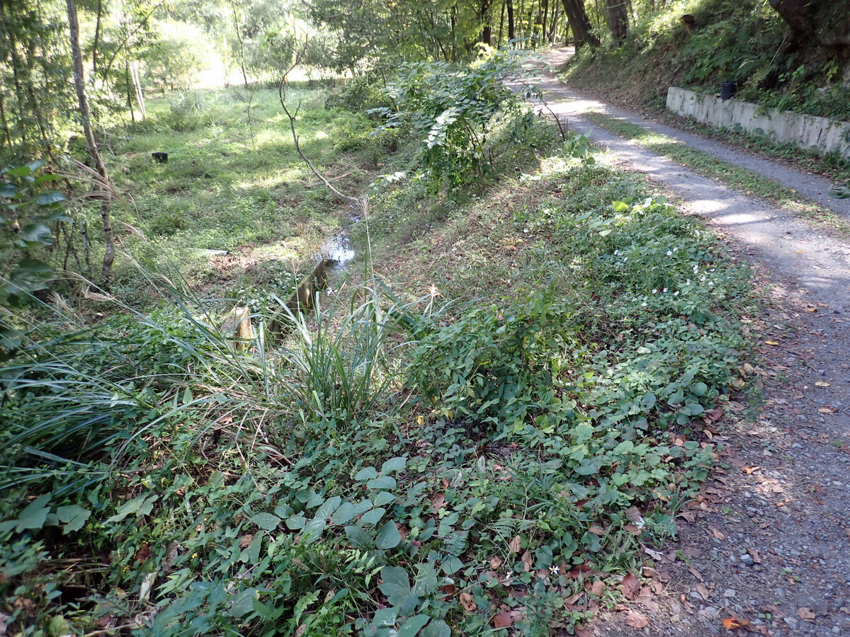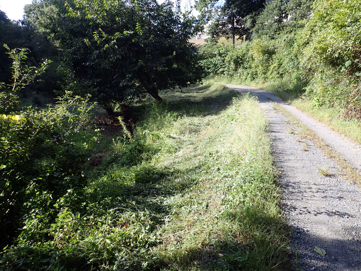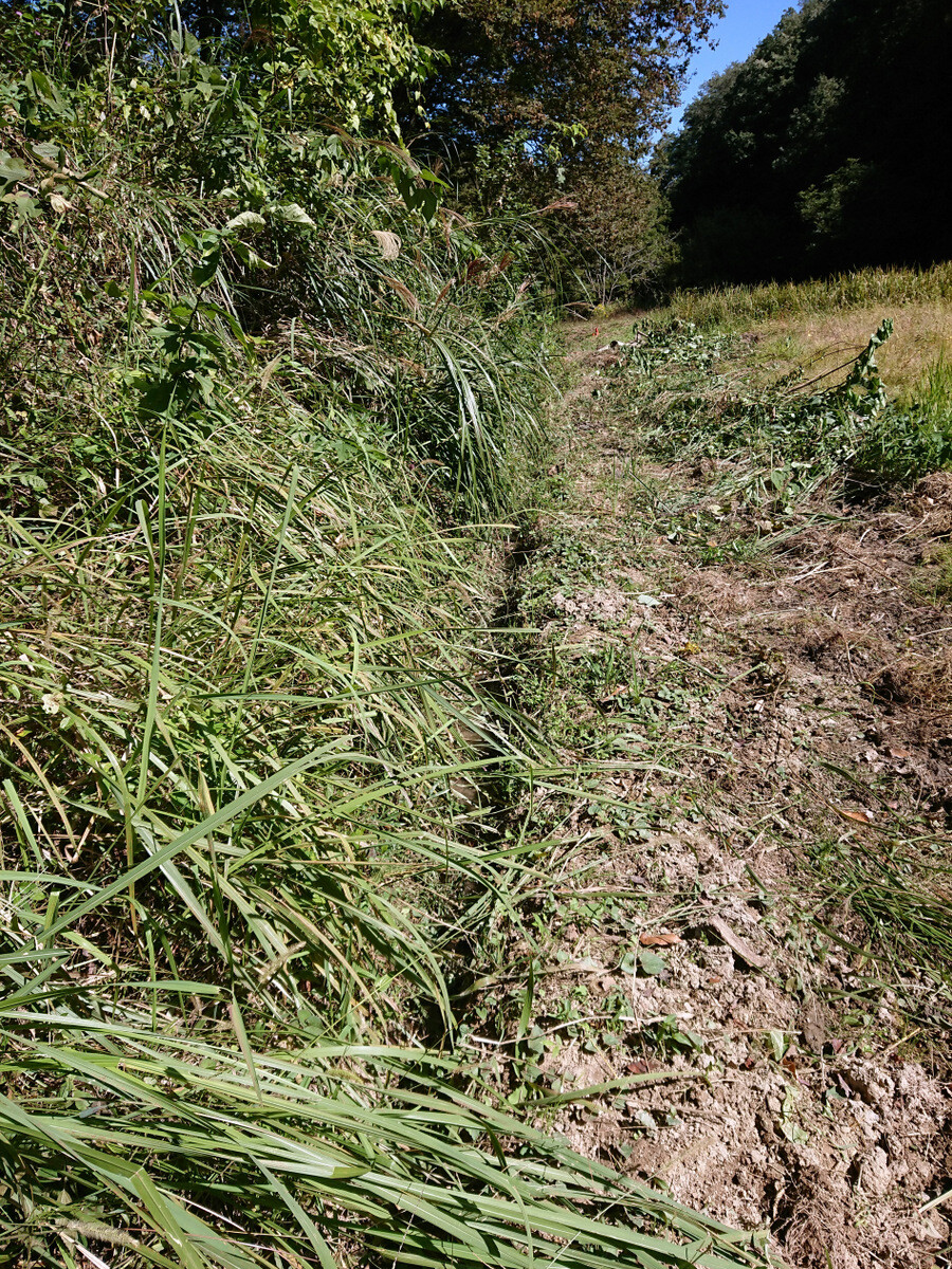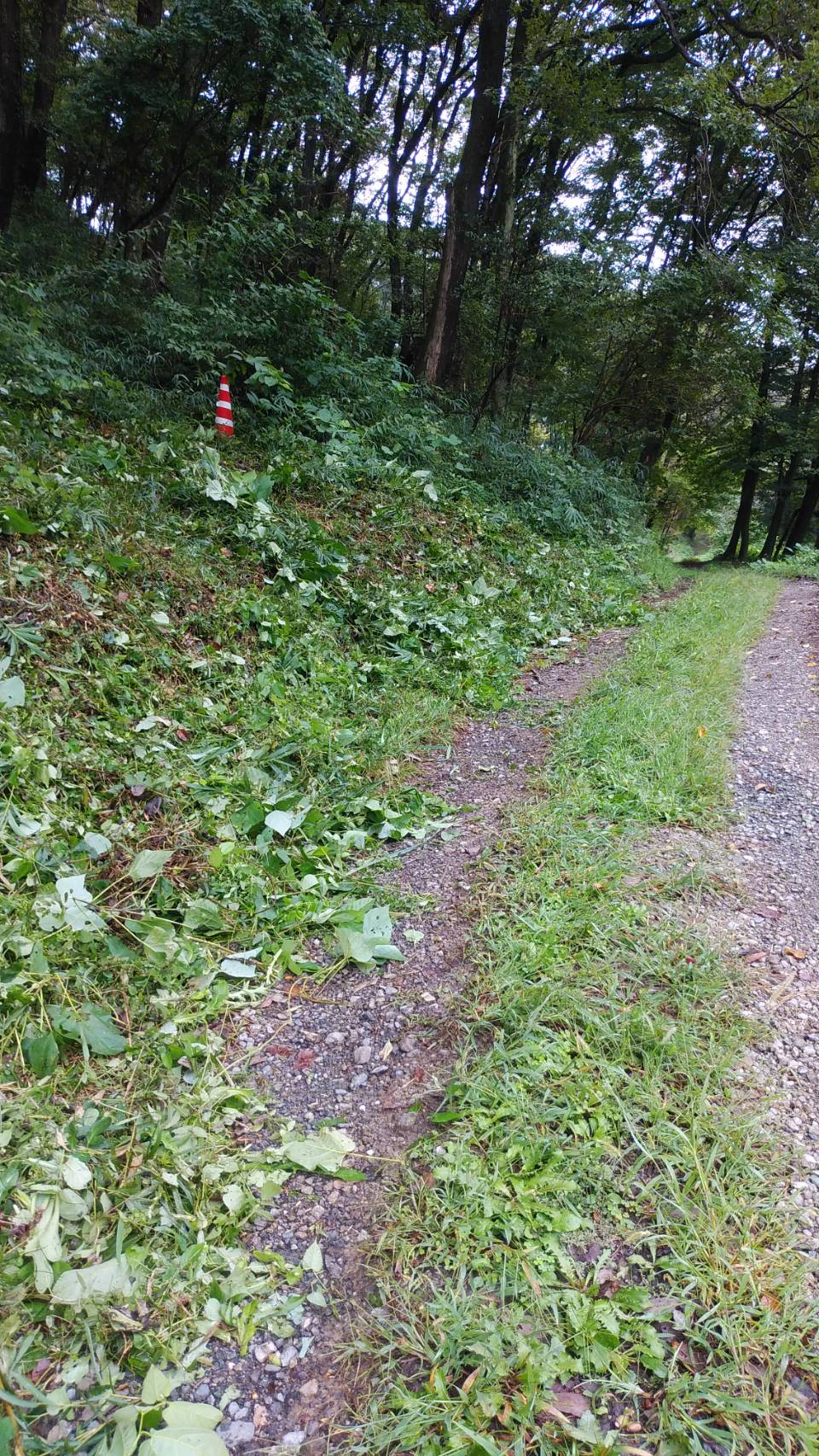 入山沼付近の学びの道の草刈りを始めました。コンクリート擁壁とフェンスがある区域のU字溝が埋め込まれている場所です。今日は、道の上にはみ出している部分を刈りました。