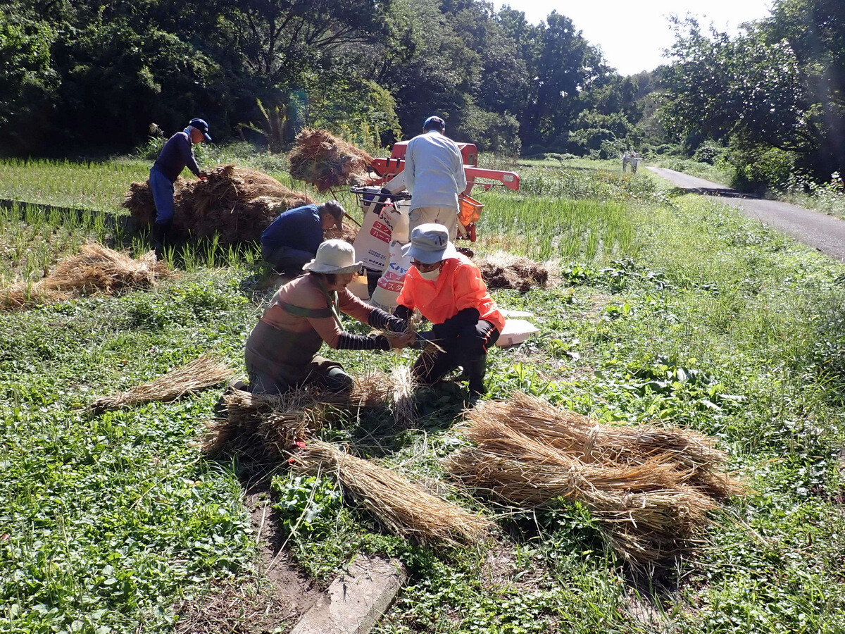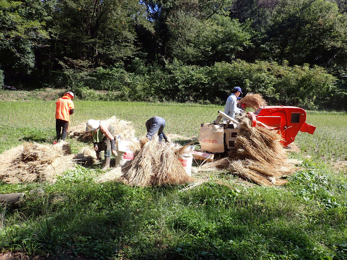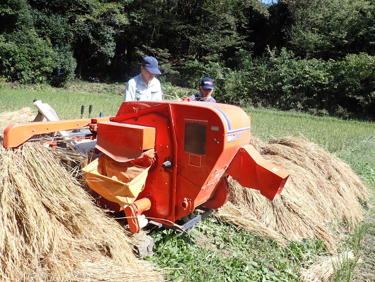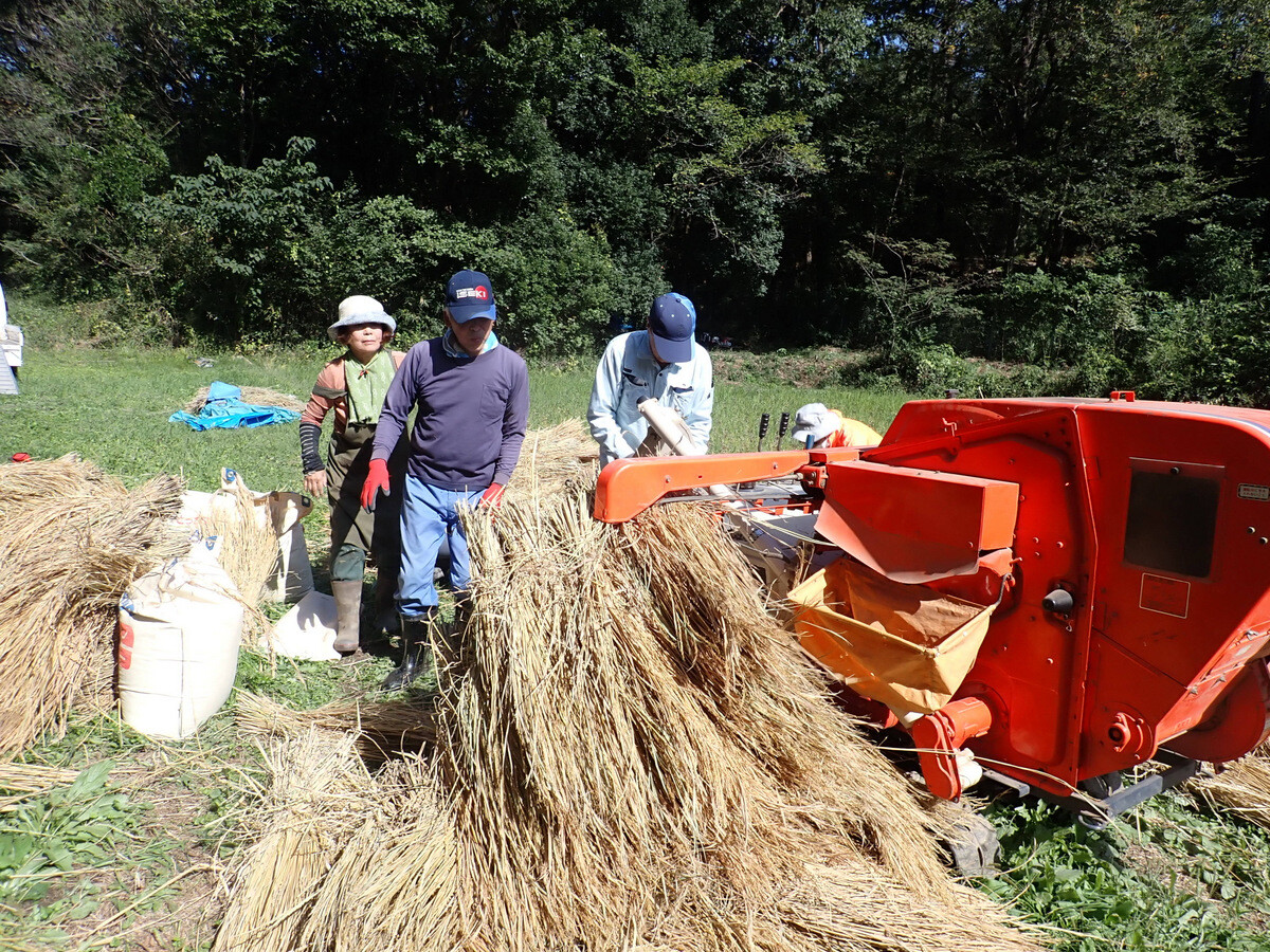 9月19日に稲刈り・稲架掛けした毛塚の田んぼでハーベスターを使ってコシヒカリを脱穀しました。片桐さん、永田さん、ありがとうございます。稲架棒を片付け、稲ワラの分配までして1日で作業が終わりました。
