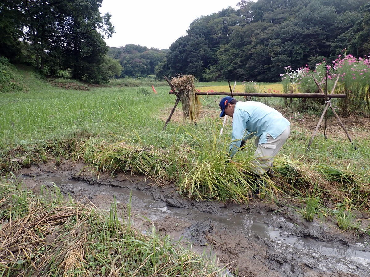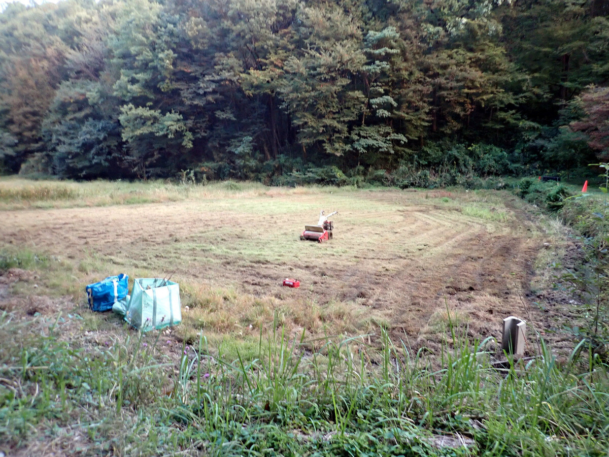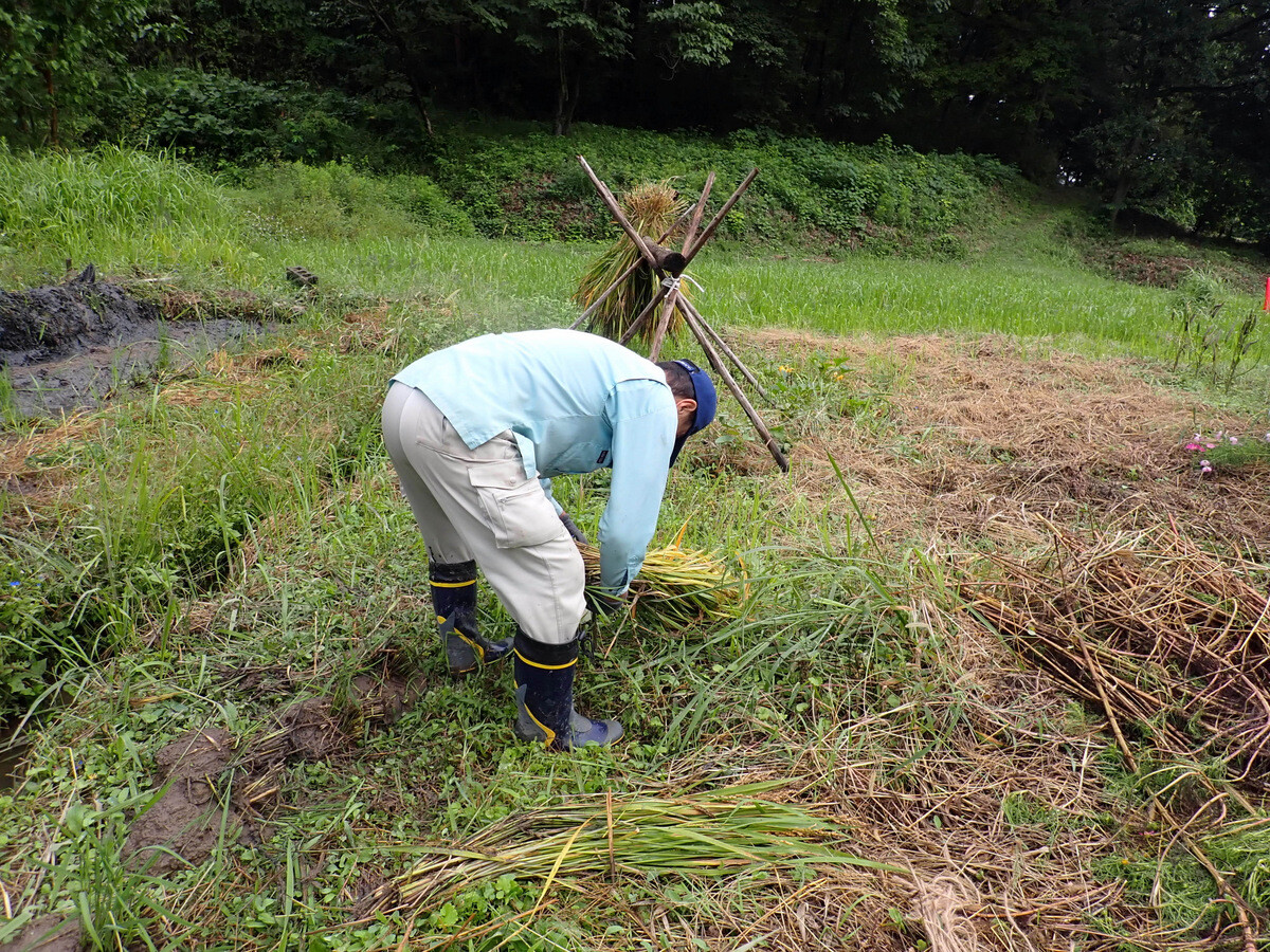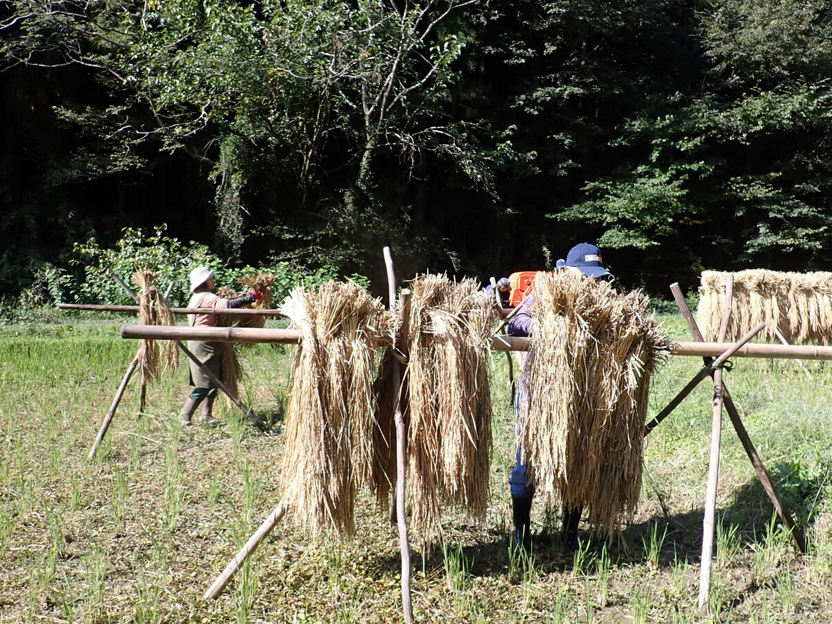 9月19日に稲刈り・稲架掛けした毛塚の田んぼでハーベスターを使ってコシヒカリを脱穀しました。片桐さん、永田さん、ありがとうございます。稲架棒を片付け、稲ワラの分配までして1日で作業が終わりました。