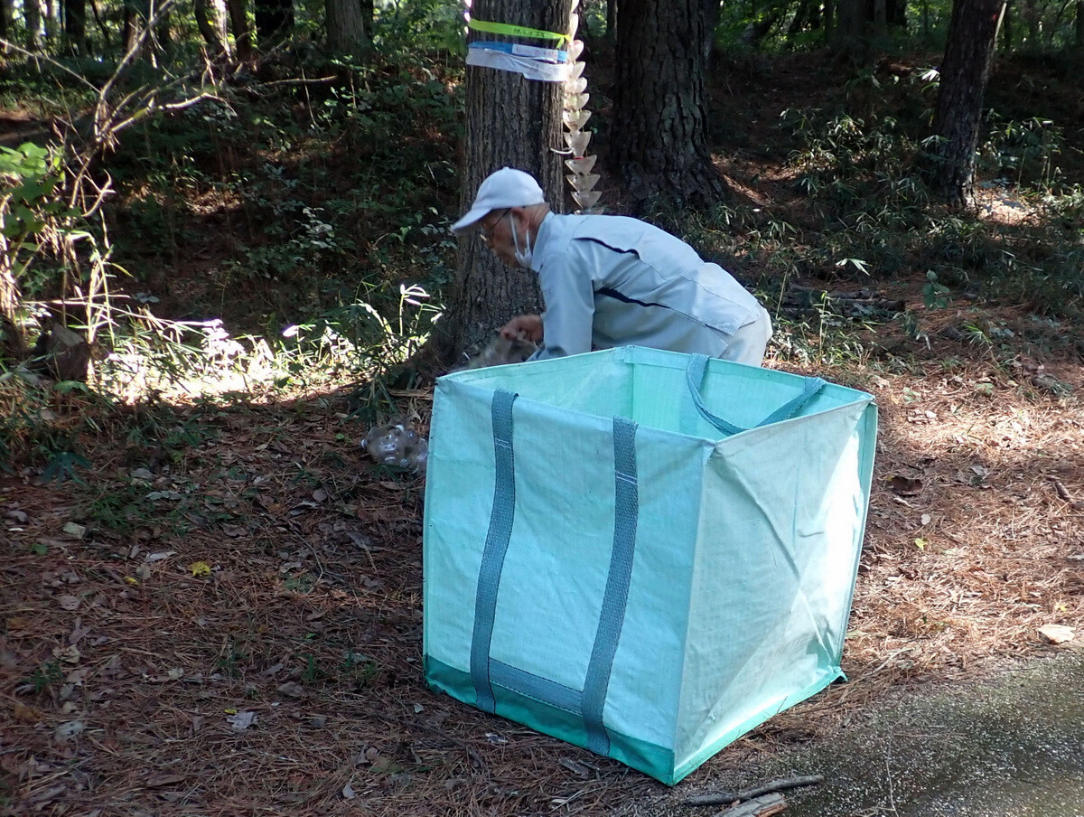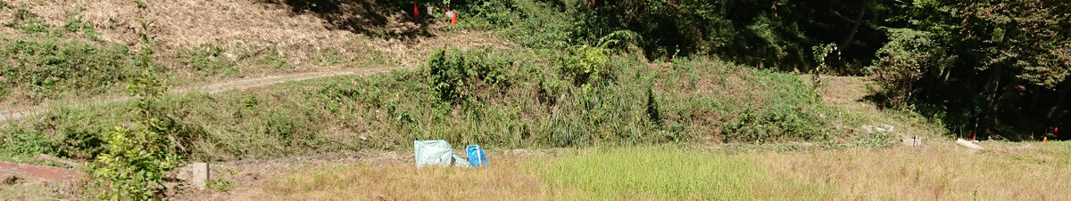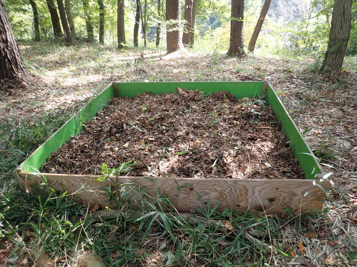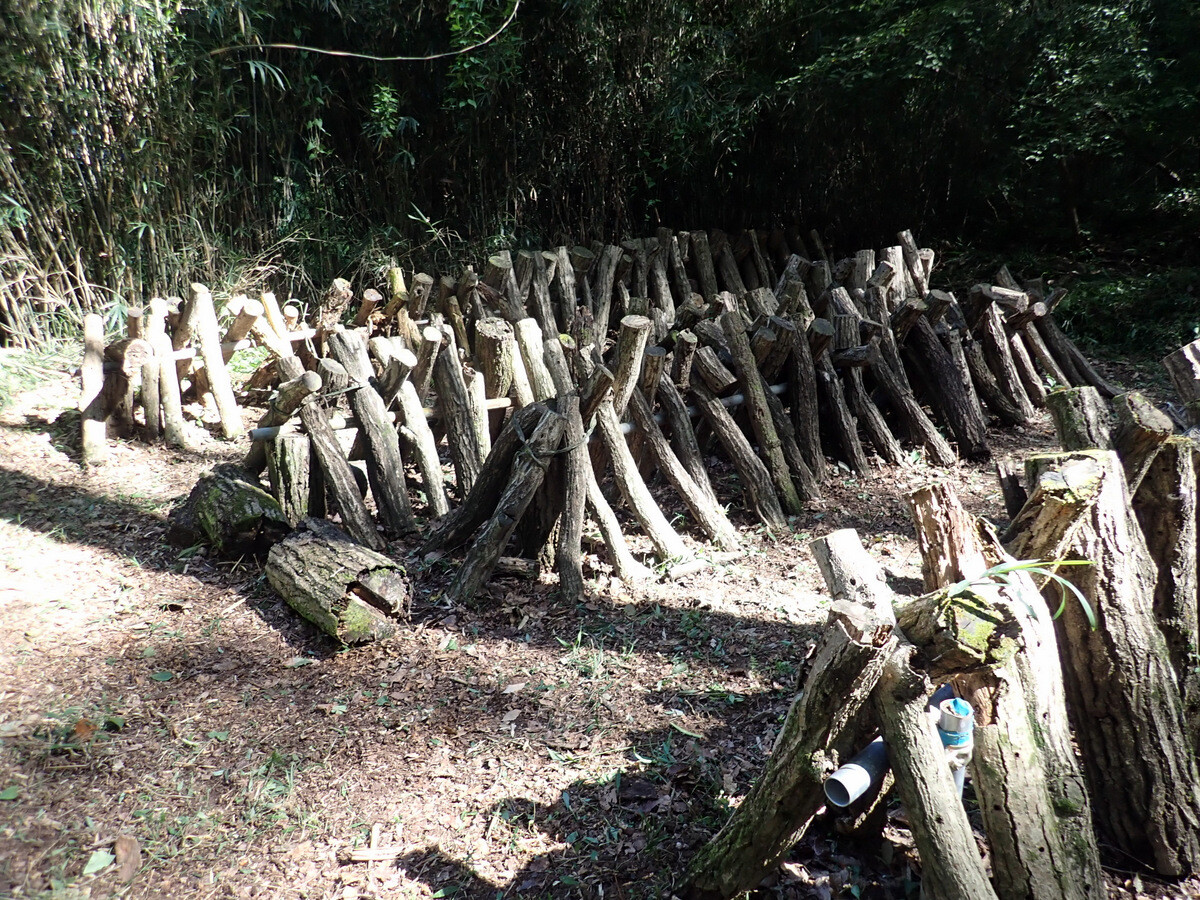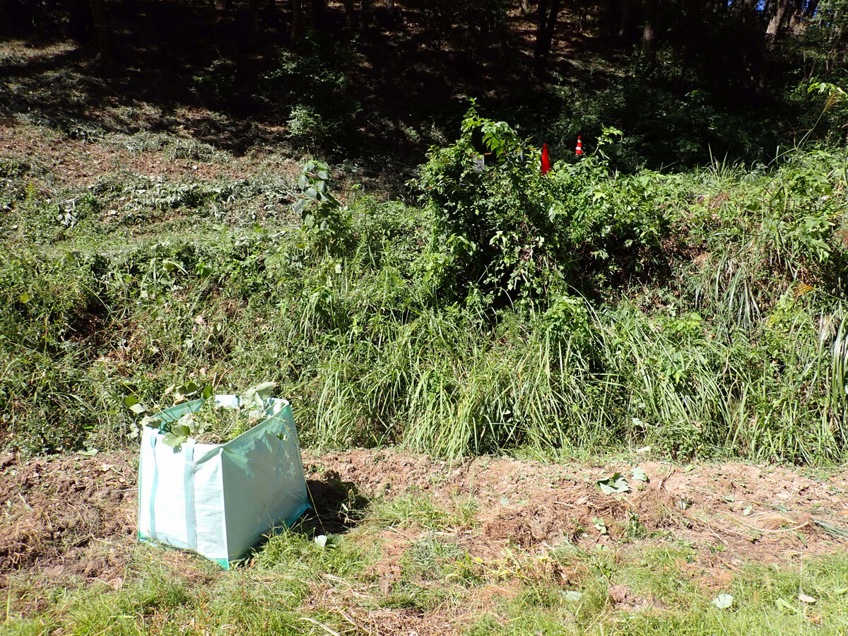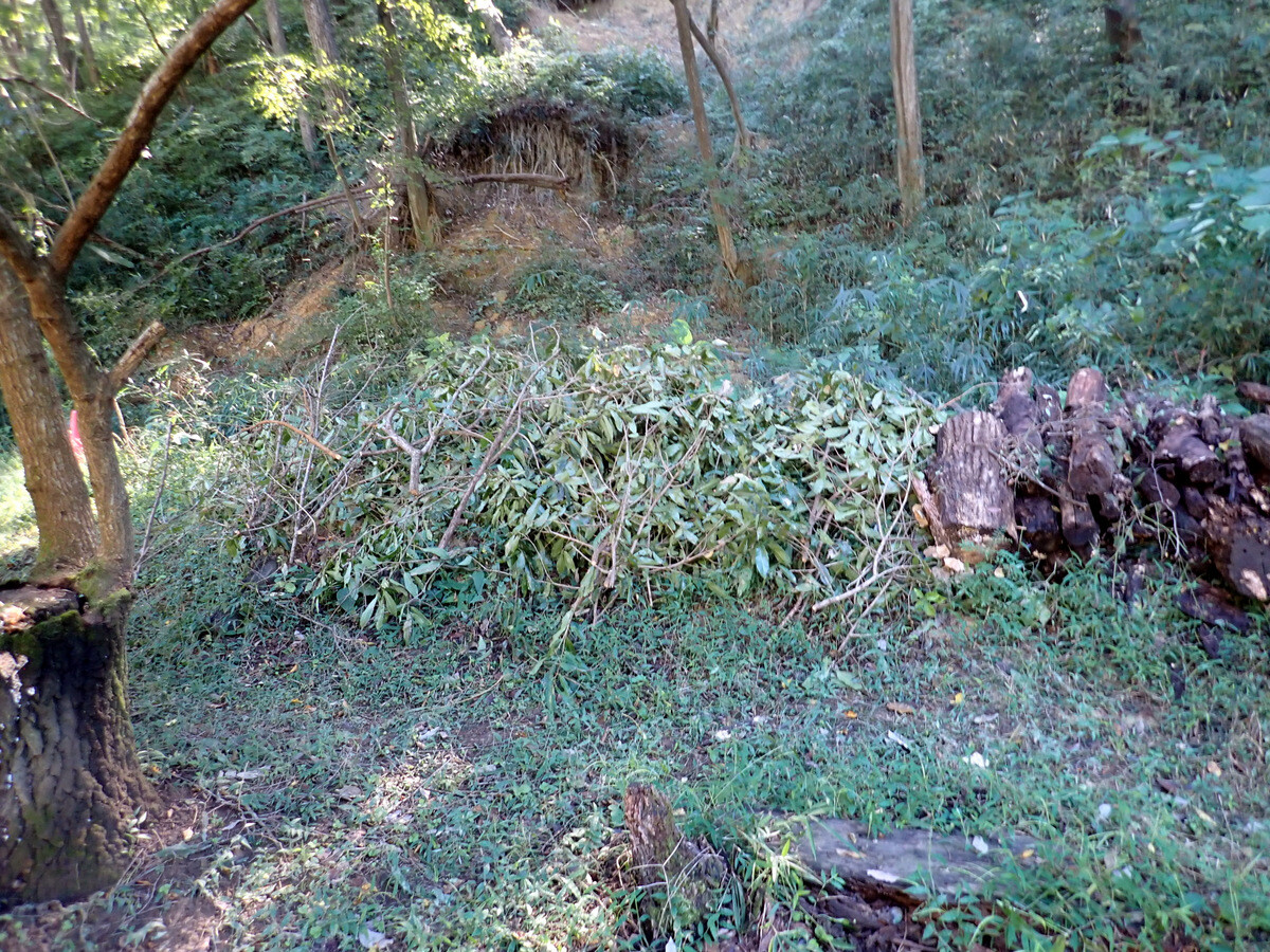 尾根の道付近のチップいれた收草袋をまとめ、落葉堆肥箱の中のアズマネザサを刈り取りました。