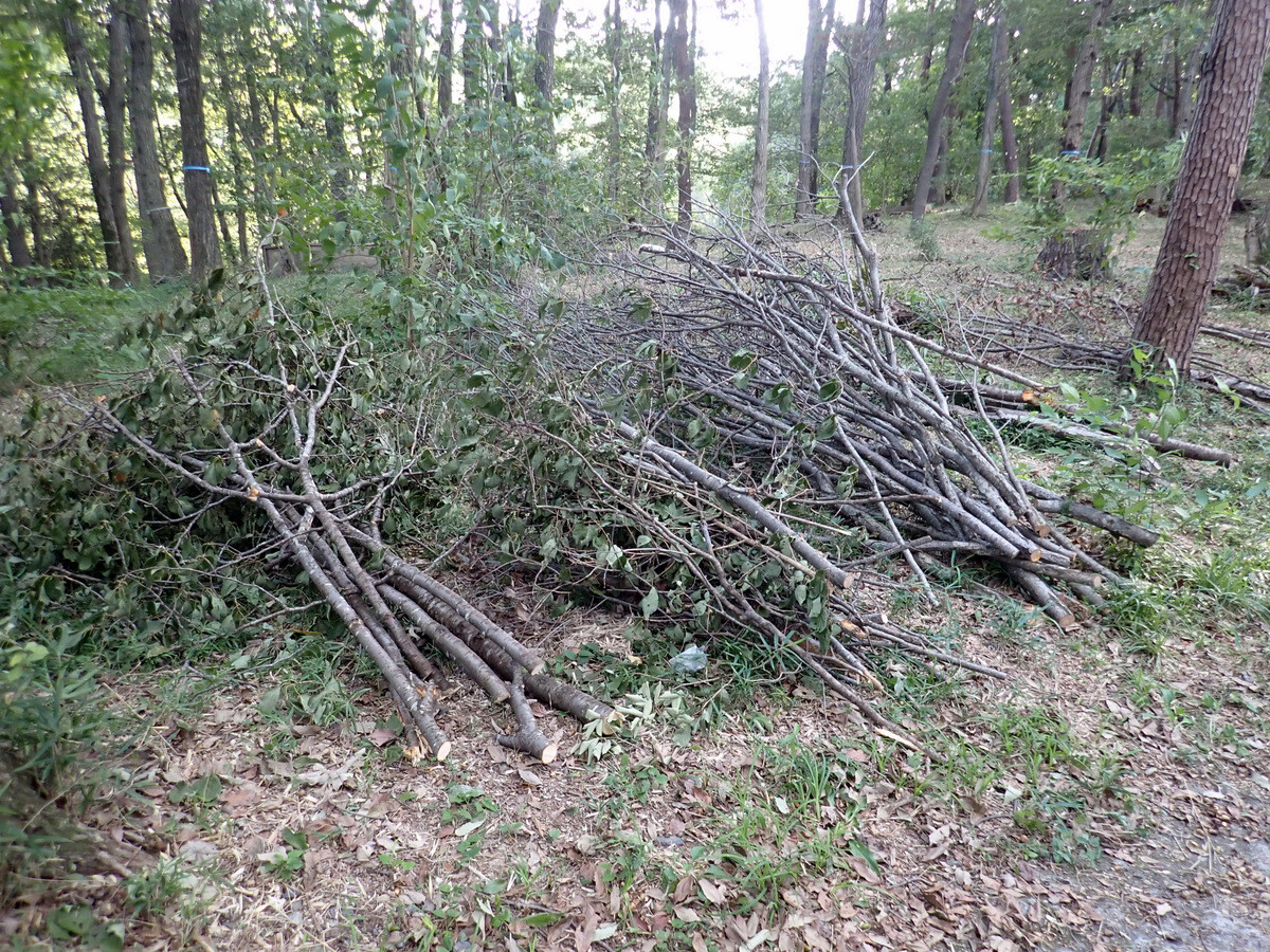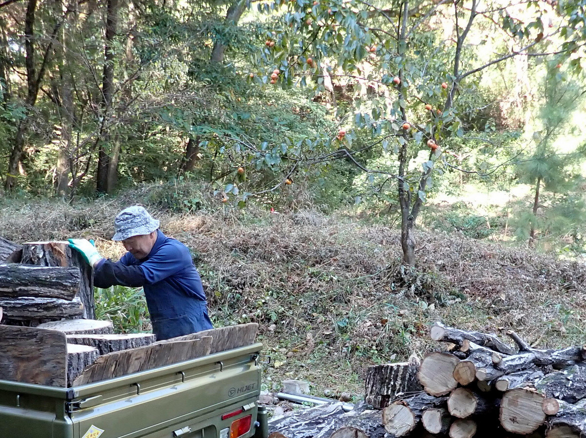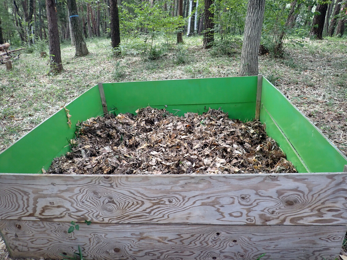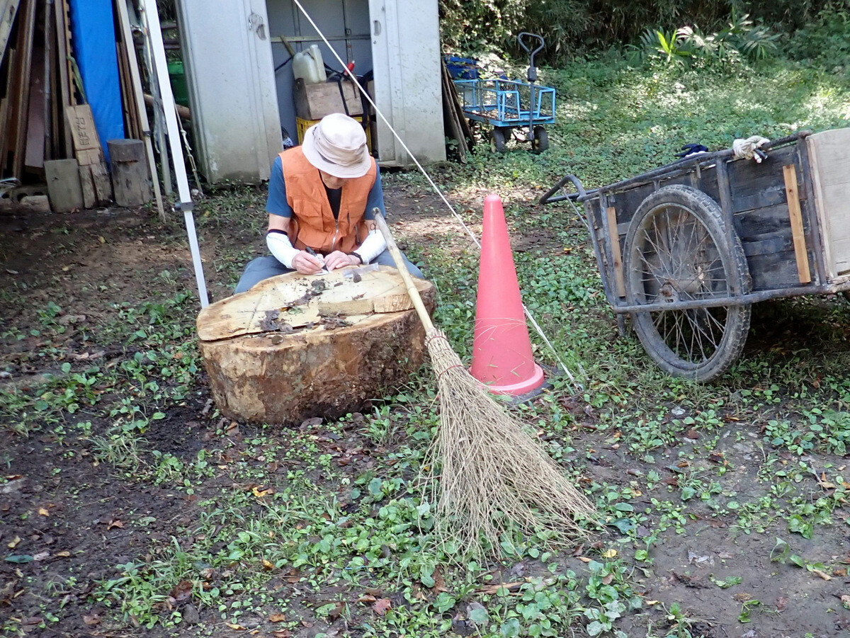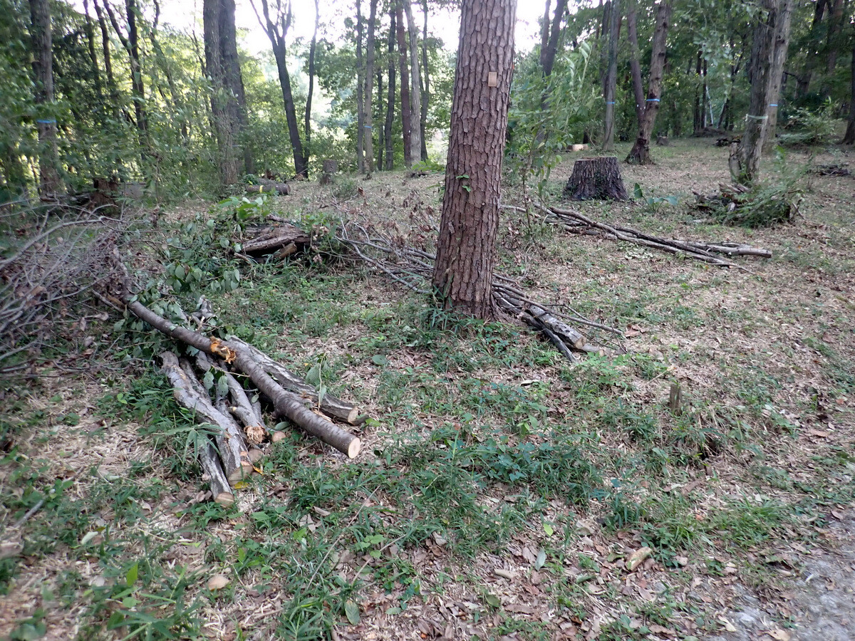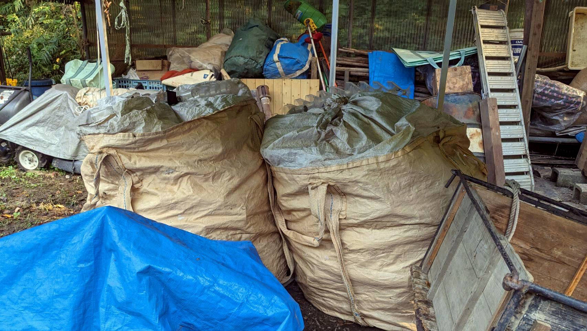 尾根の道付近のチップいれた收草袋をまとめ、落葉堆肥箱の中のアズマネザサを刈り取りました。