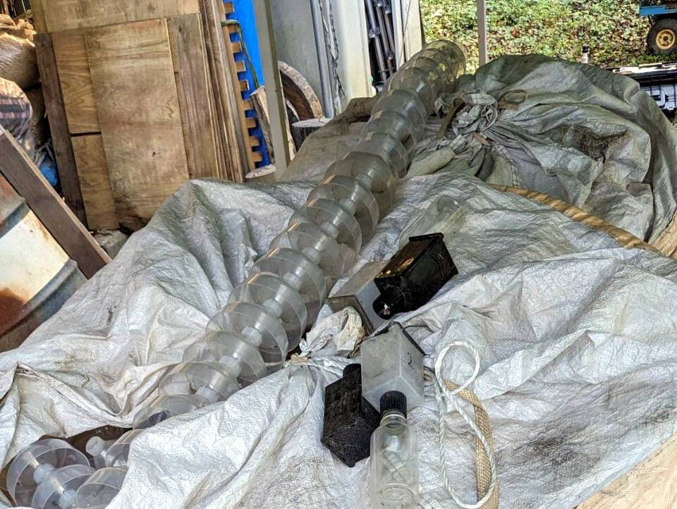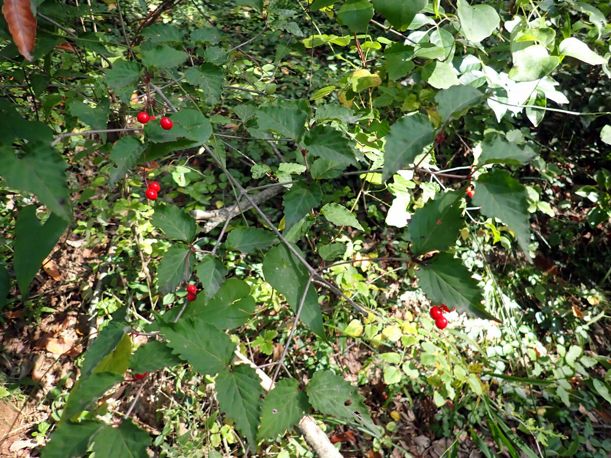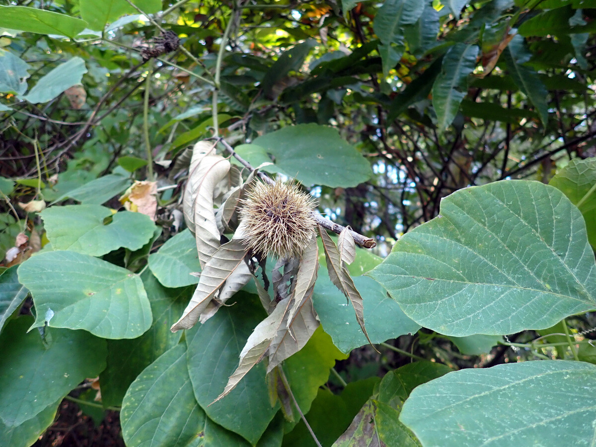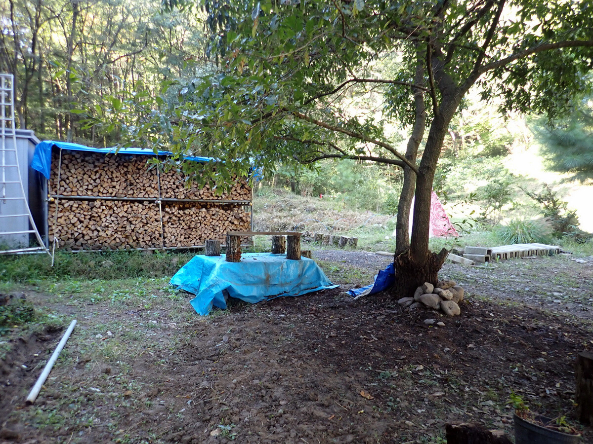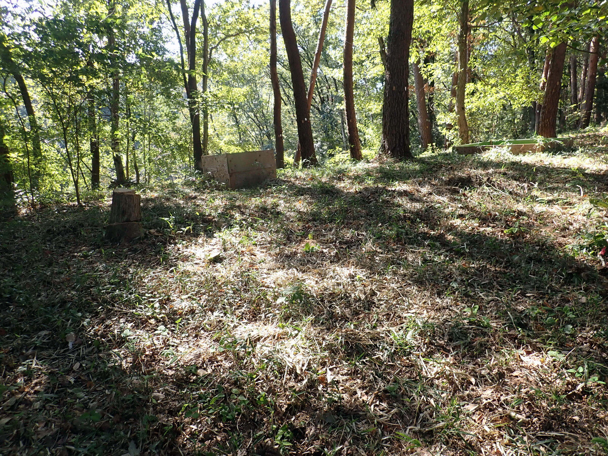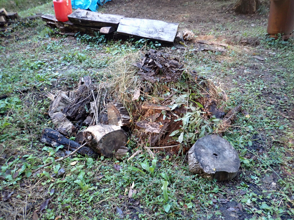尾根の道付近のチップいれた收草袋をまとめ、落葉堆肥箱の中のアズマネザサを刈り取りました。