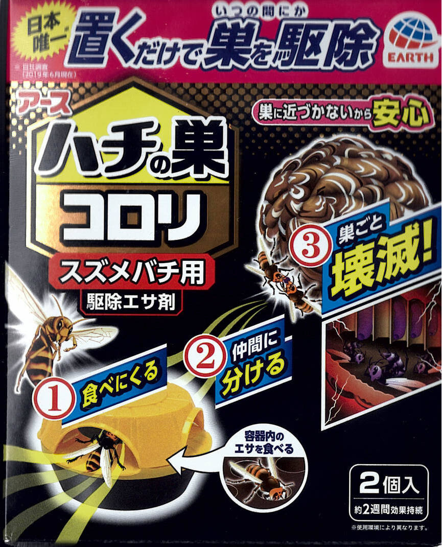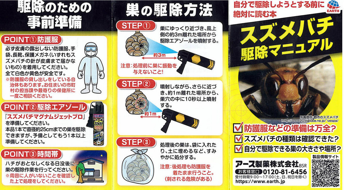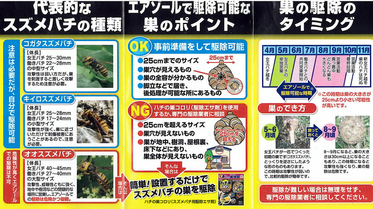 対策として、蜂駆除スプレー「ハチアブマグナムジェット」(アース製薬)、スズメバチ用駆除エサ剤「ハチの巣コロリ」(アース製薬)、スズメバチ忌避剤「スズメバチサラバ」(高知大学発ベンチャー・株式会社KINP)などを検討しています。