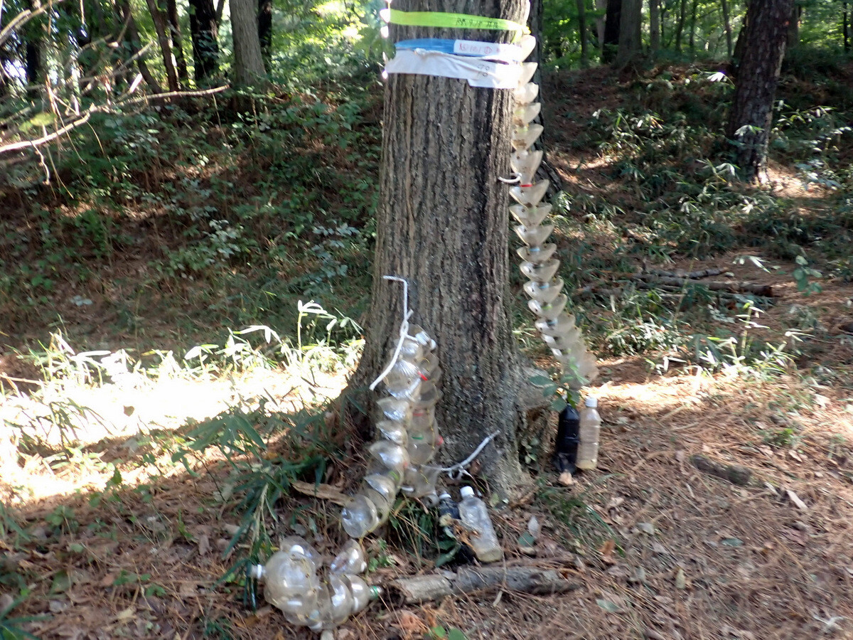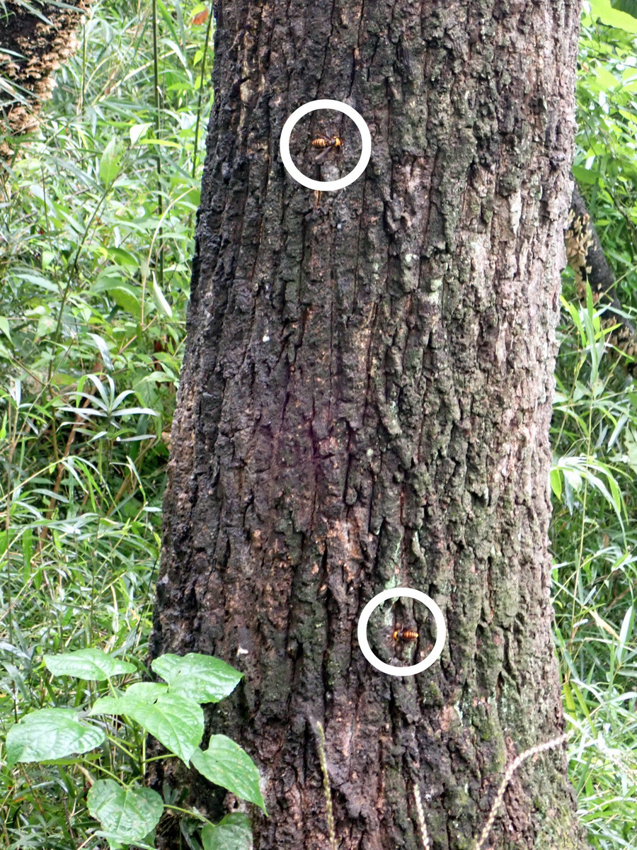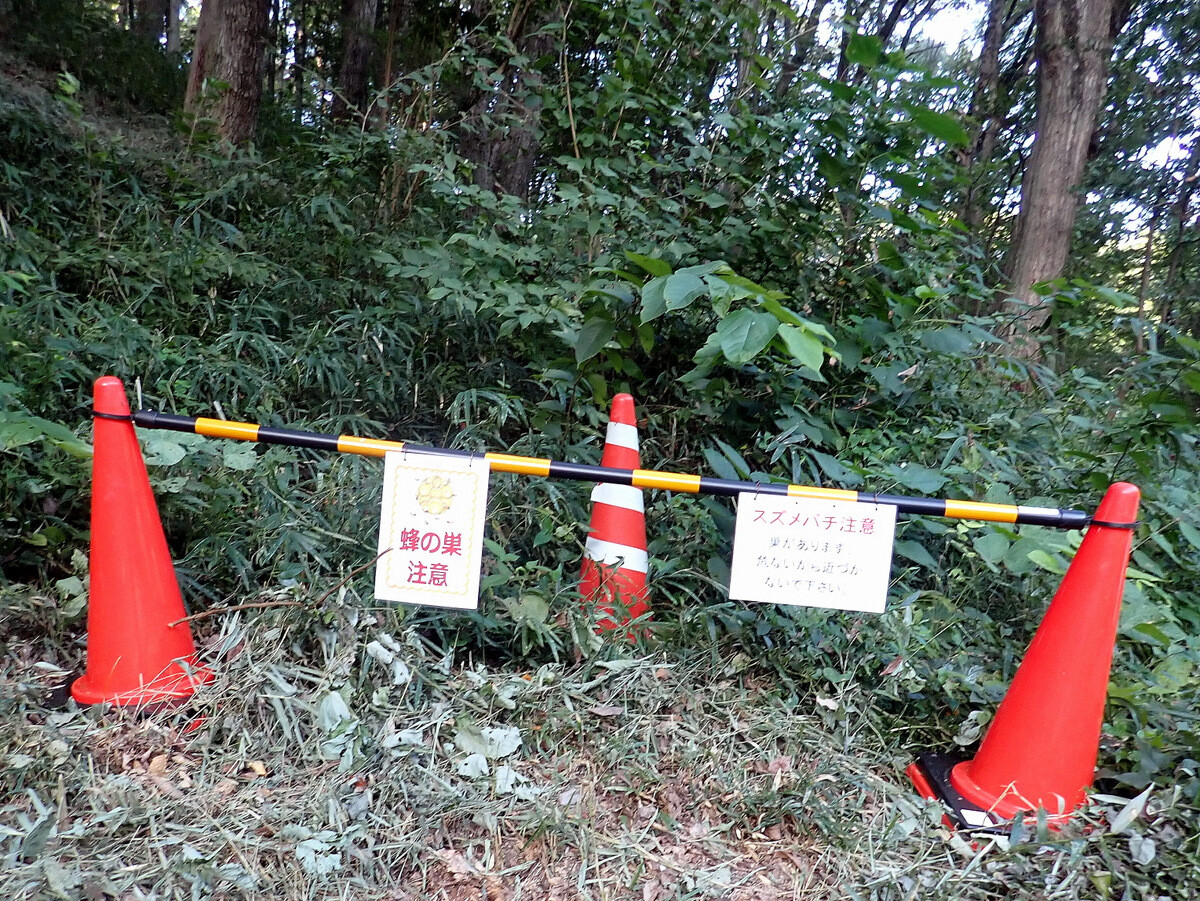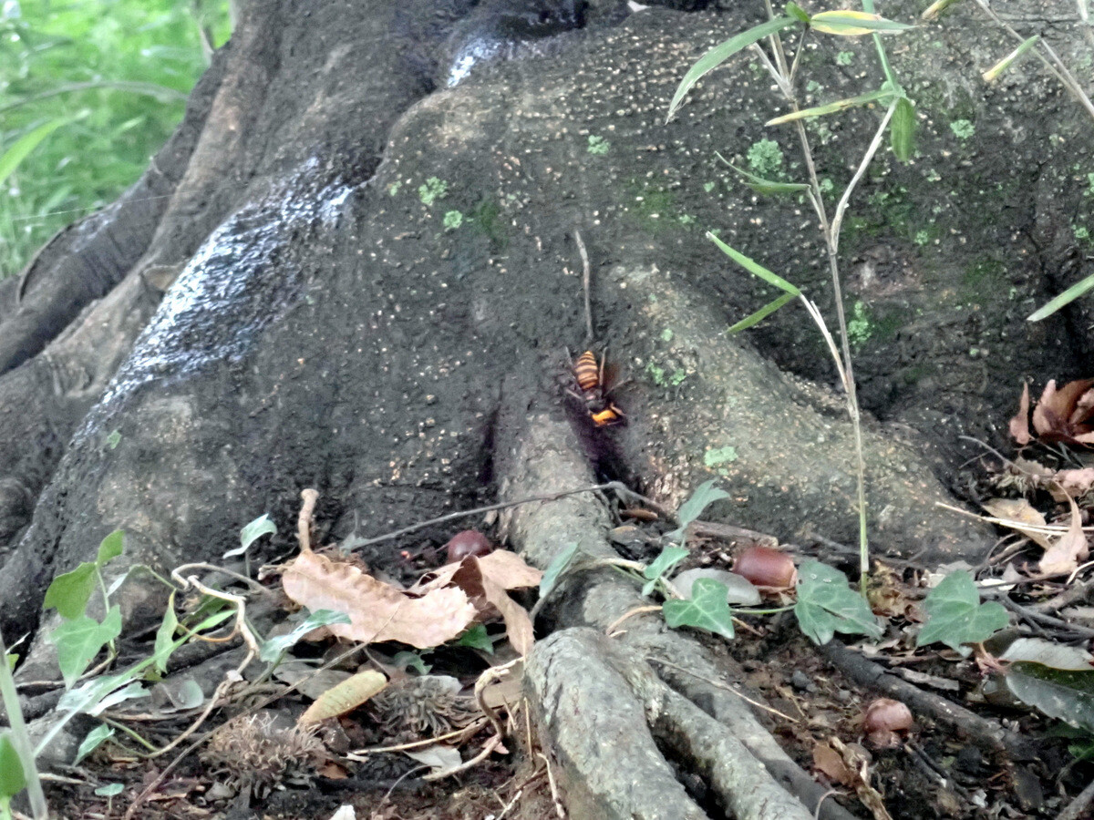 市民の森作業道下のクヌギの樹液にスズメバチが群がっています。カラーコーンを立てています。近づかないようにして下さい。