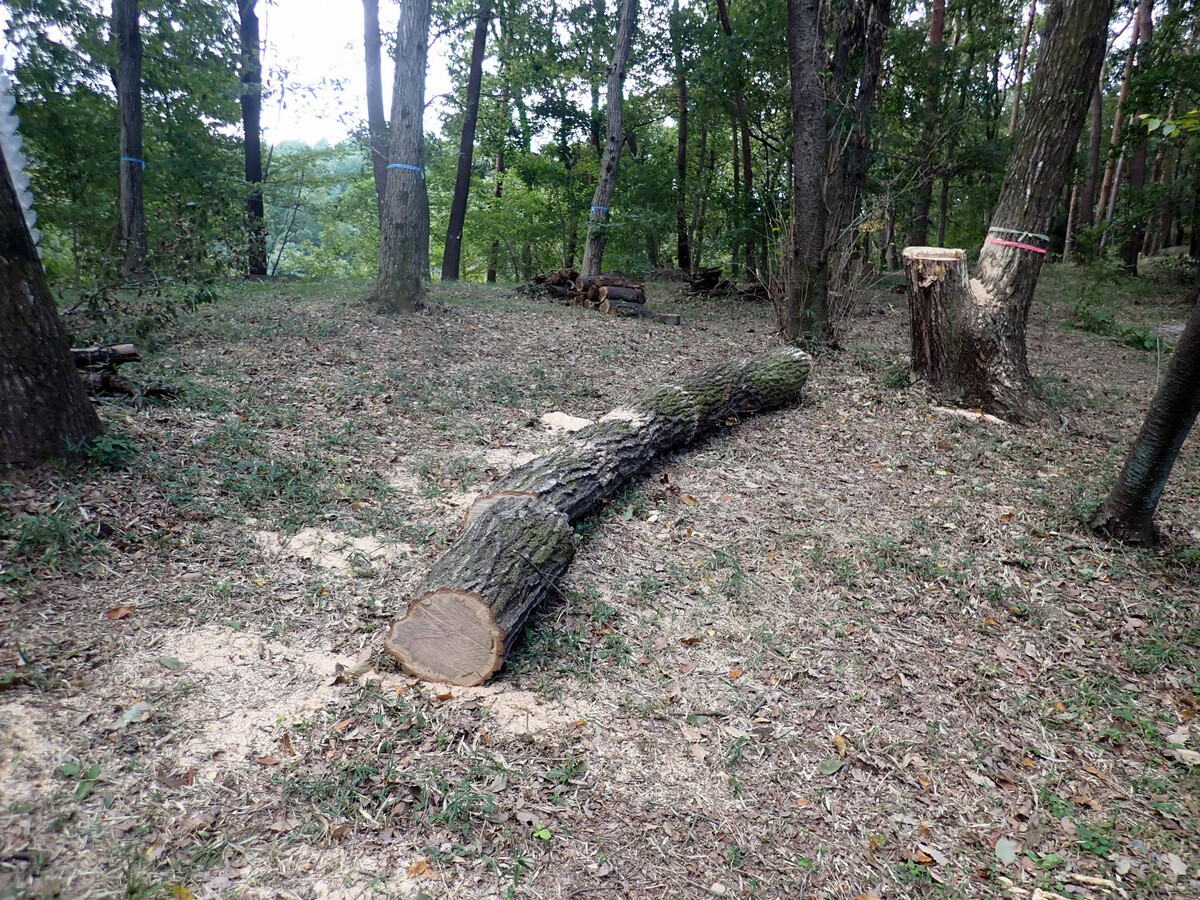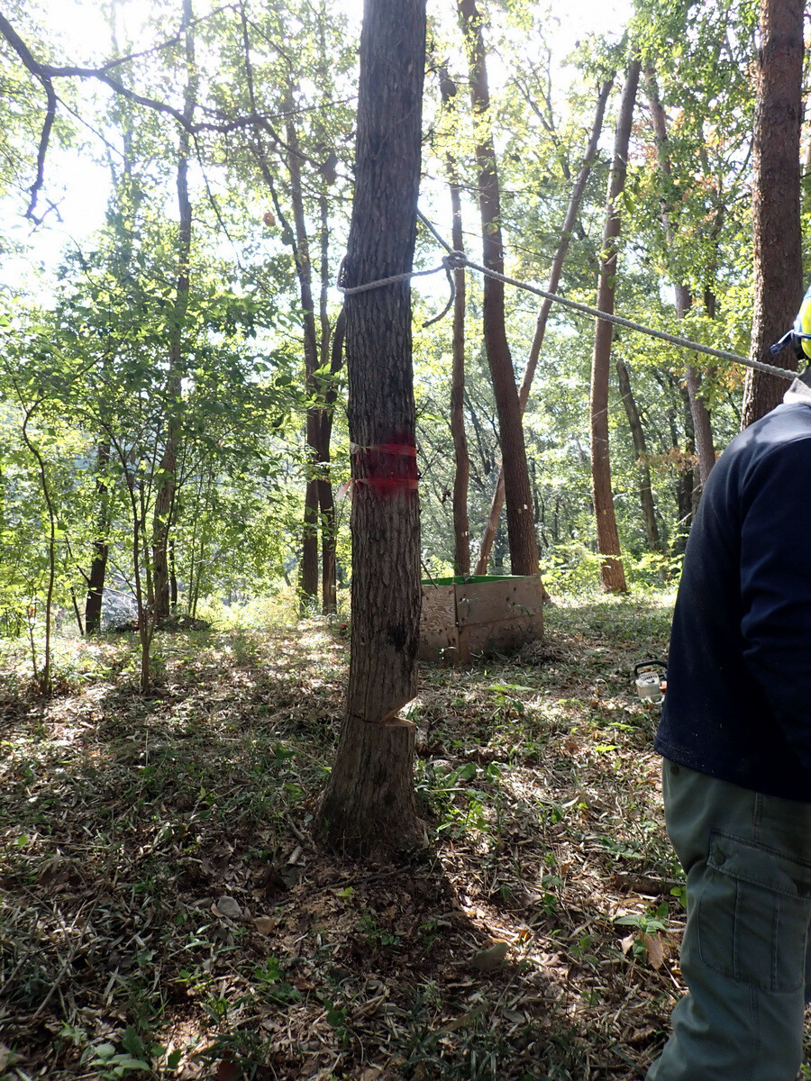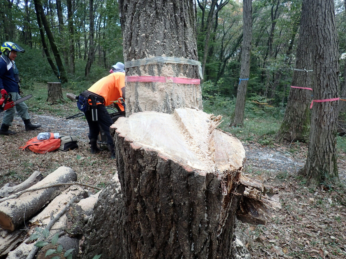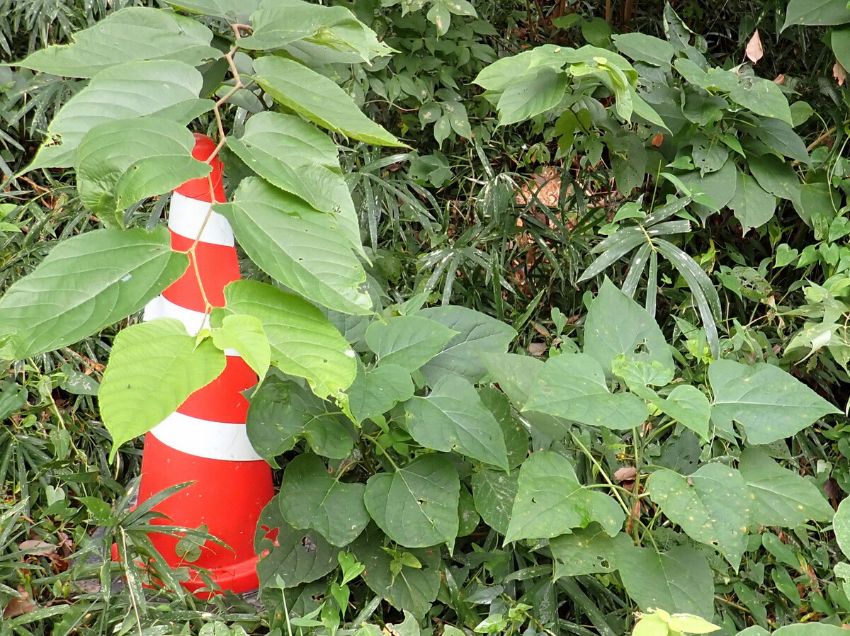 市民の森作業道下のクヌギの樹液にスズメバチが群がっています。カラーコーンを立てています。近づかないようにして下さい。
