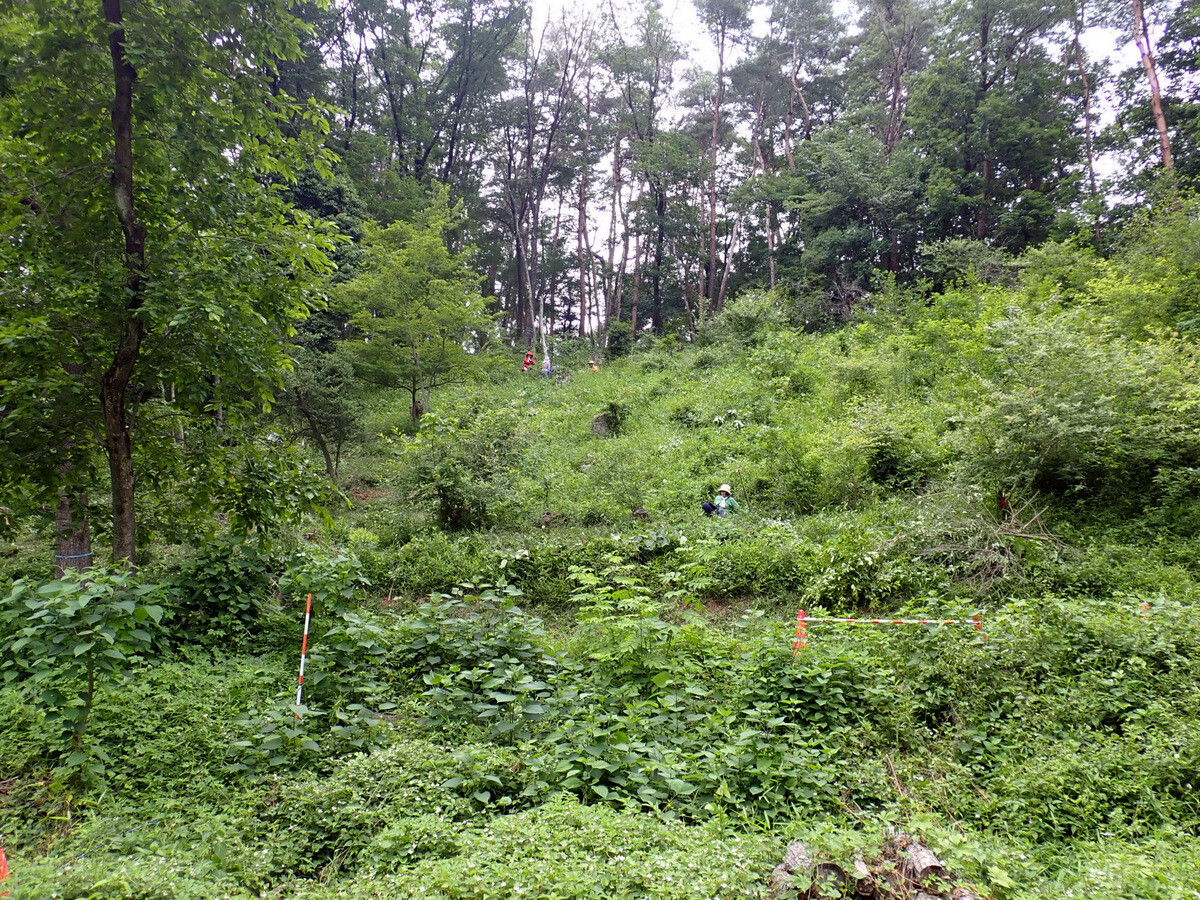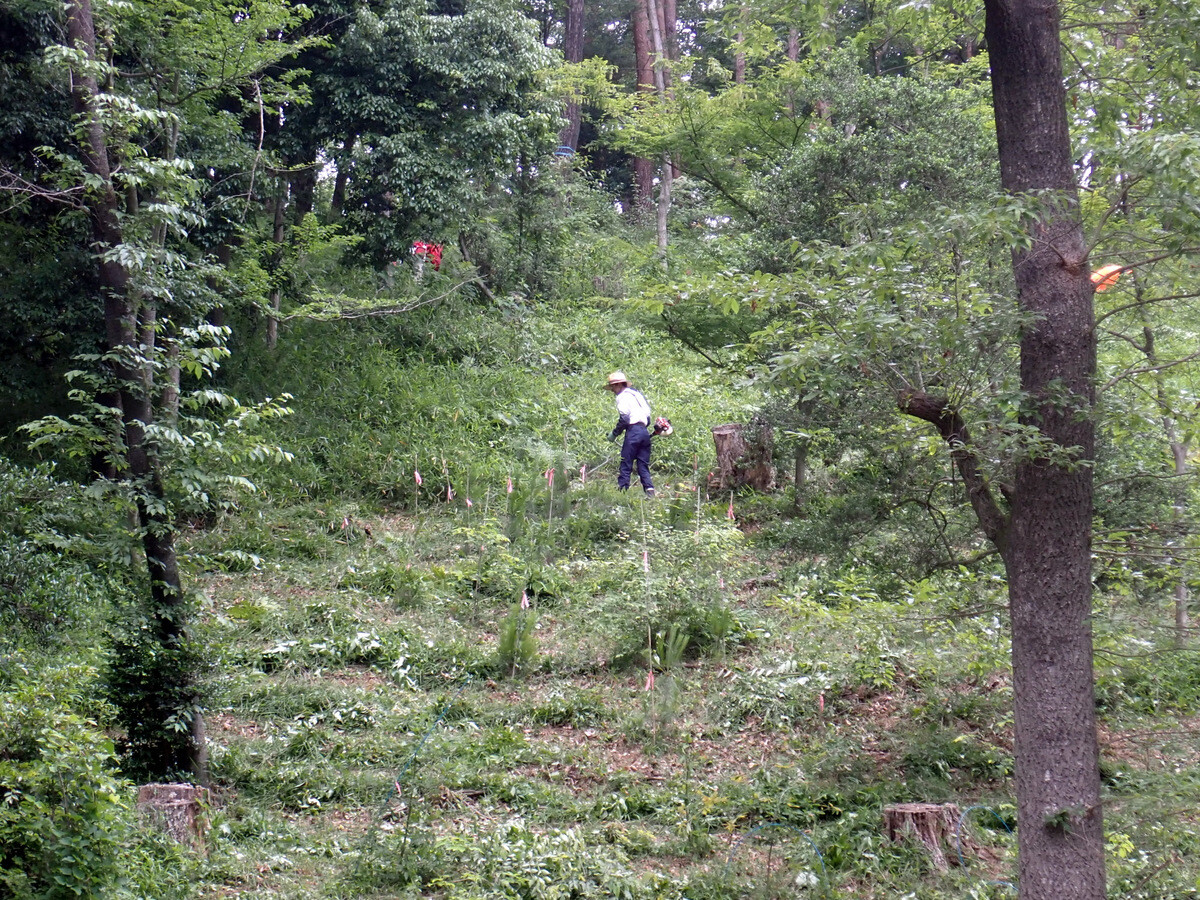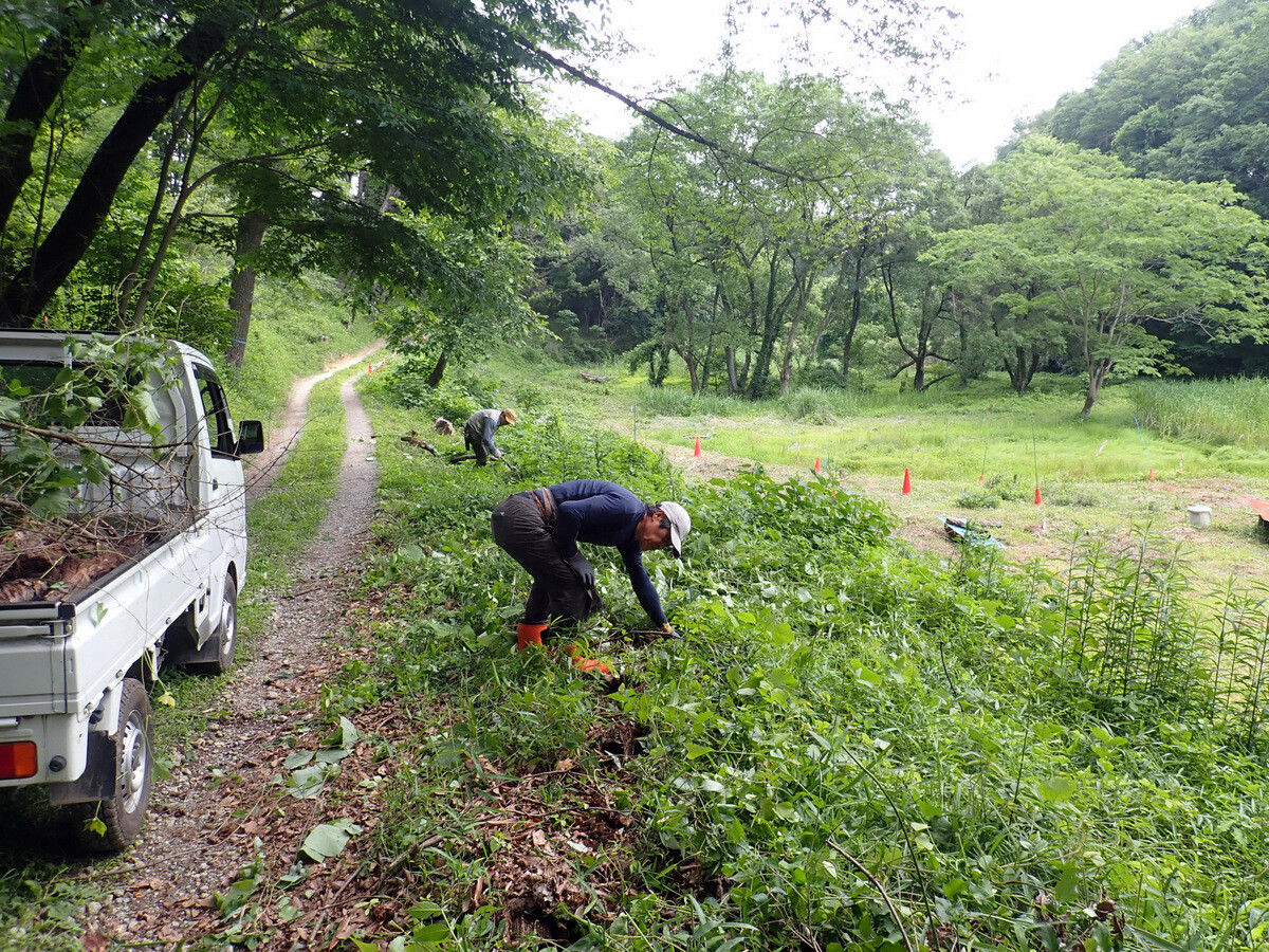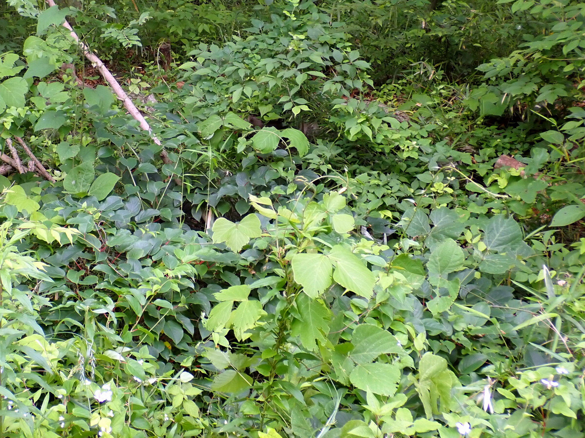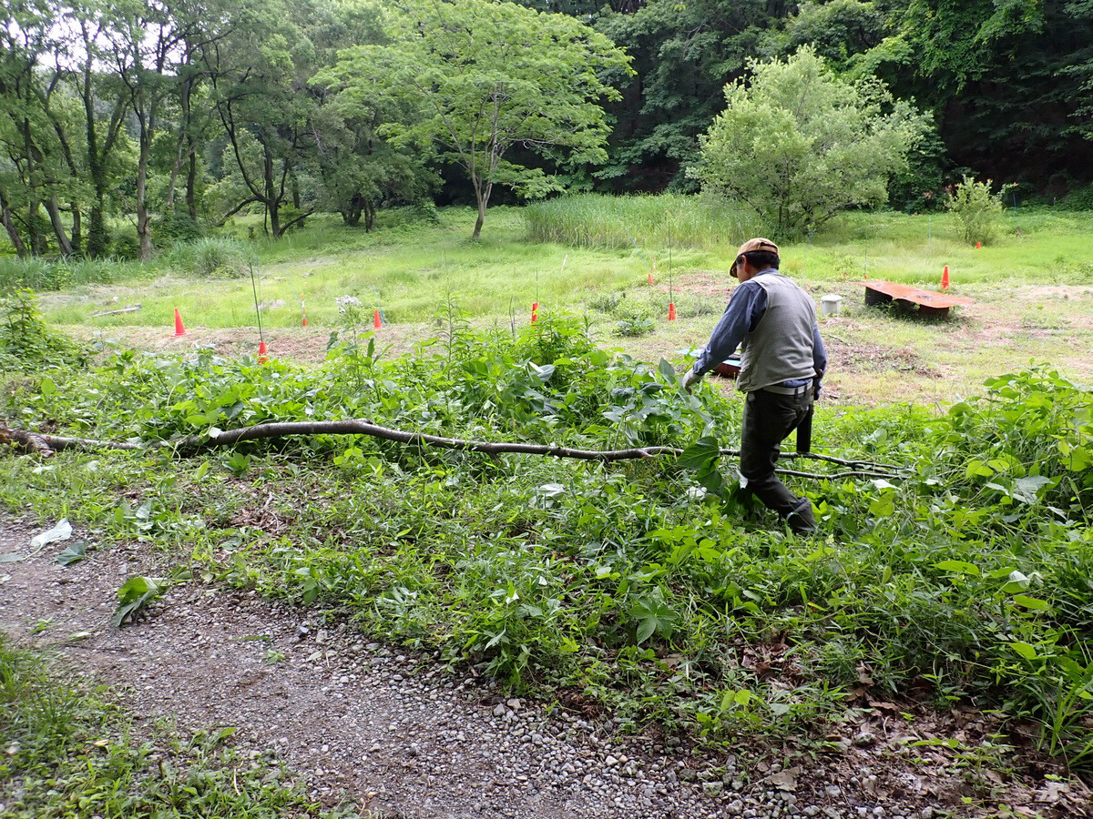 作業道と岩殿F地区との間の斜面を覆いつくしているカナムグラ(アサ科)の抜き取りを始めました。一年生のつる植物で雌雄異株。キタテハの幼虫の食草です。