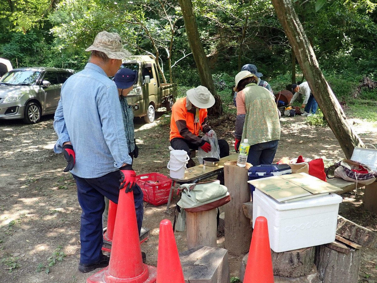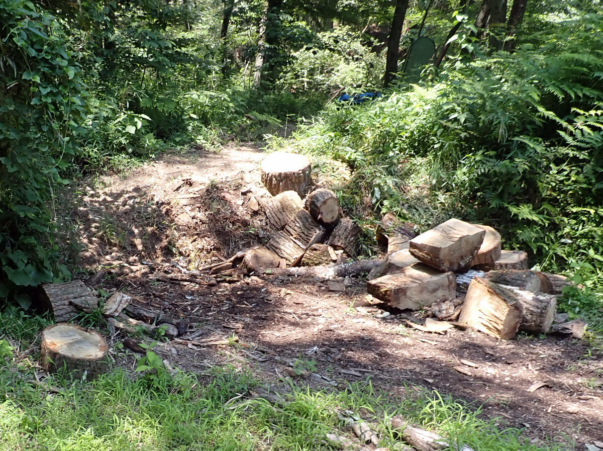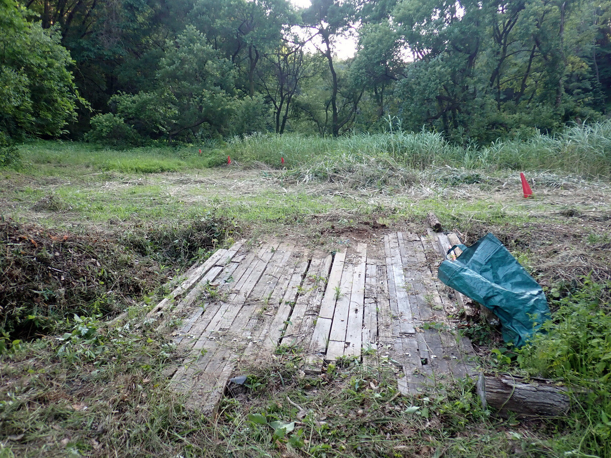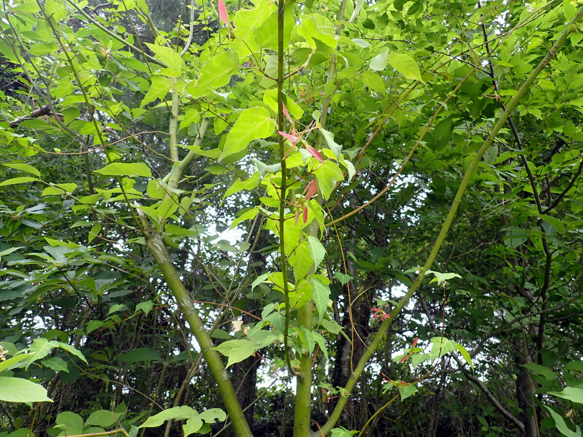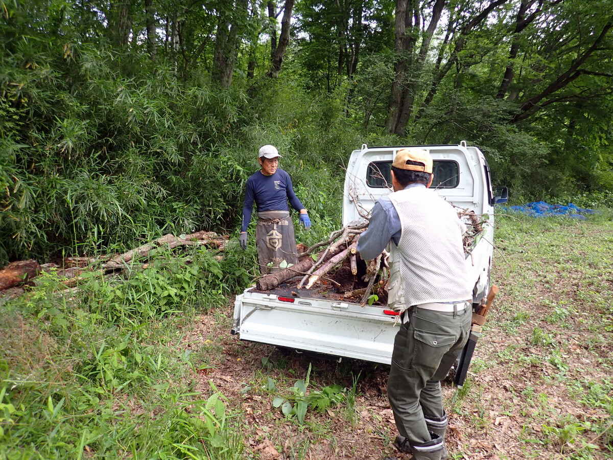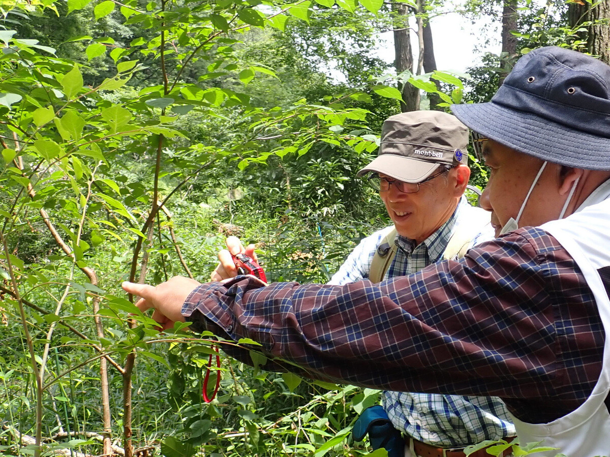 作業道と岩殿F地区との間の斜面を覆いつくしているカナムグラ(アサ科)の抜き取りを始めました。一年生のつる植物で雌雄異株。キタテハの幼虫の食草です。