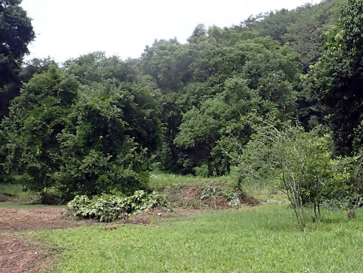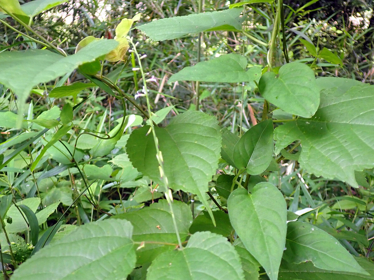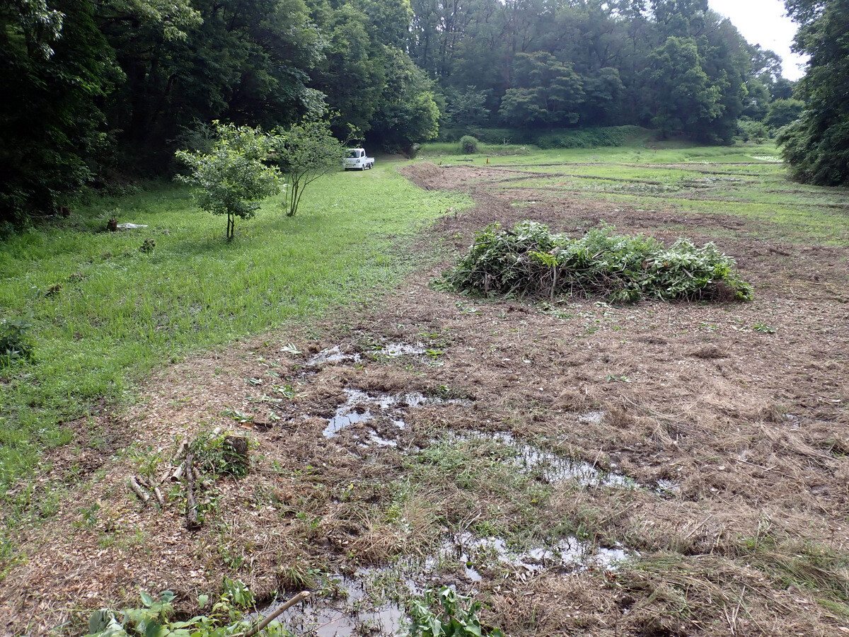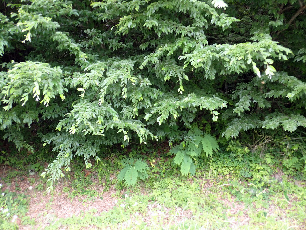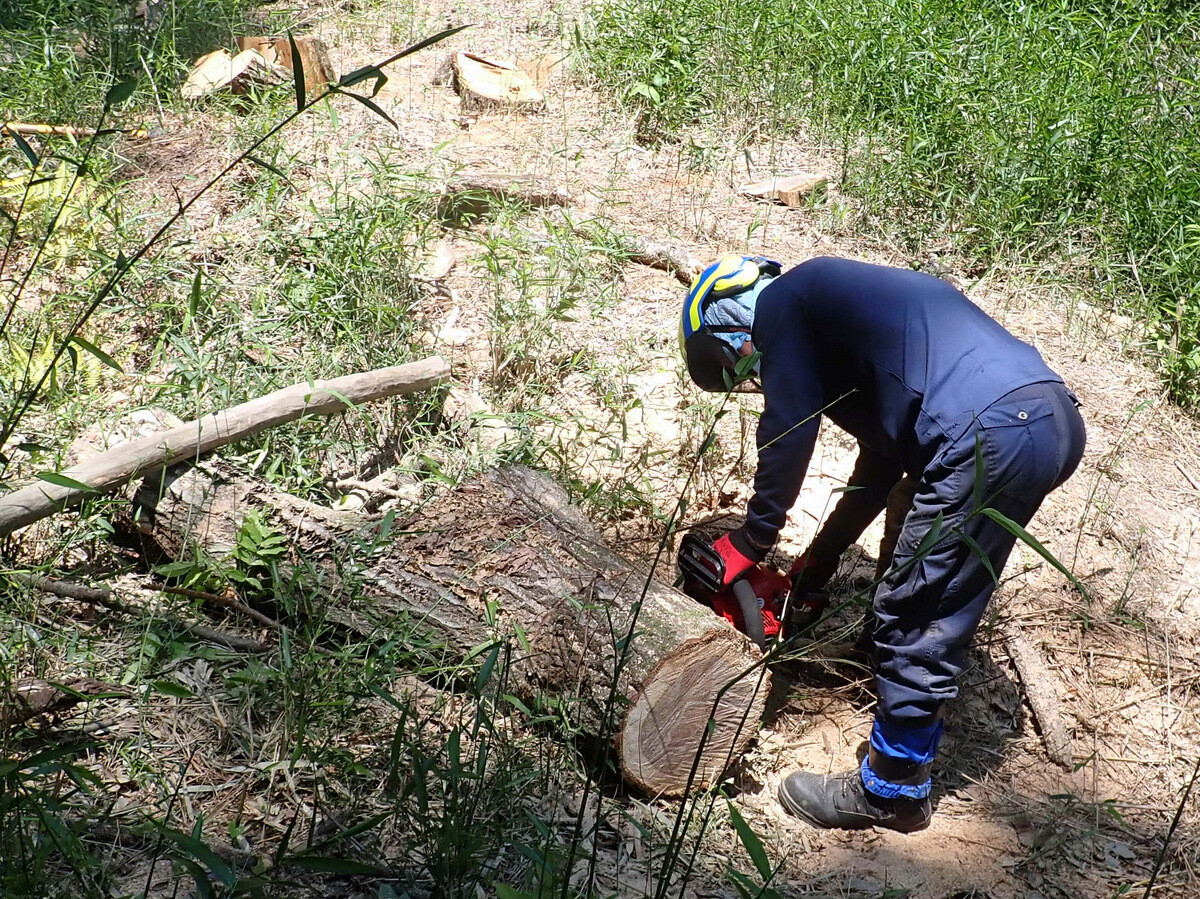 作業道と岩殿F地区との間の斜面を覆いつくしているカナムグラ(アサ科)の抜き取りを始めました。一年生のつる植物で雌雄異株。キタテハの幼虫の食草です。