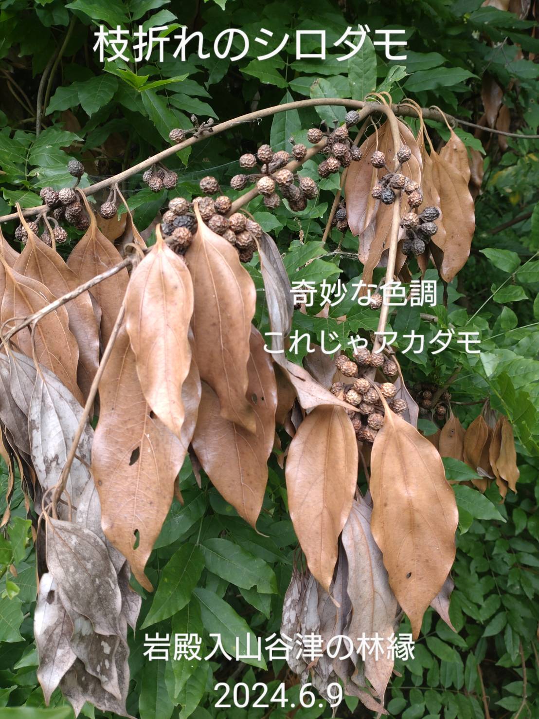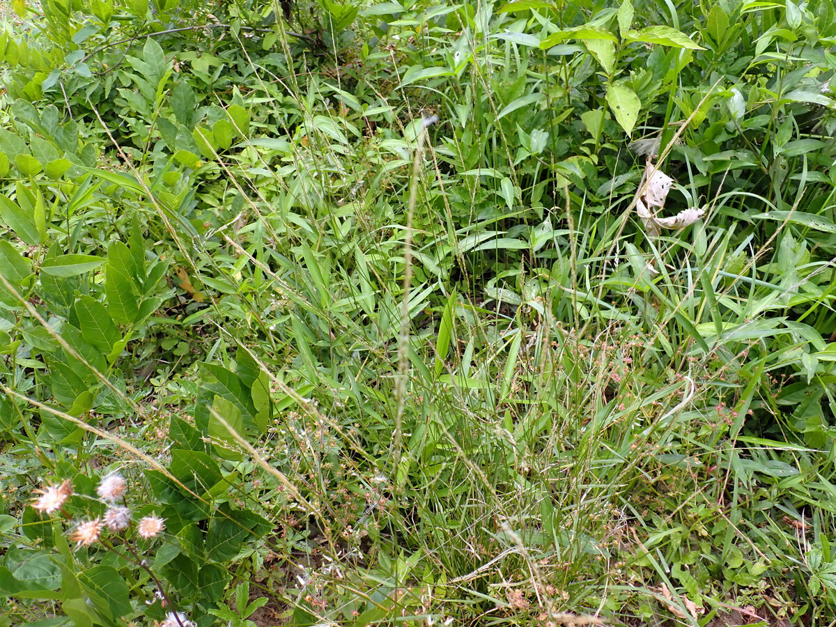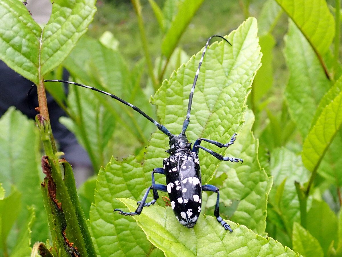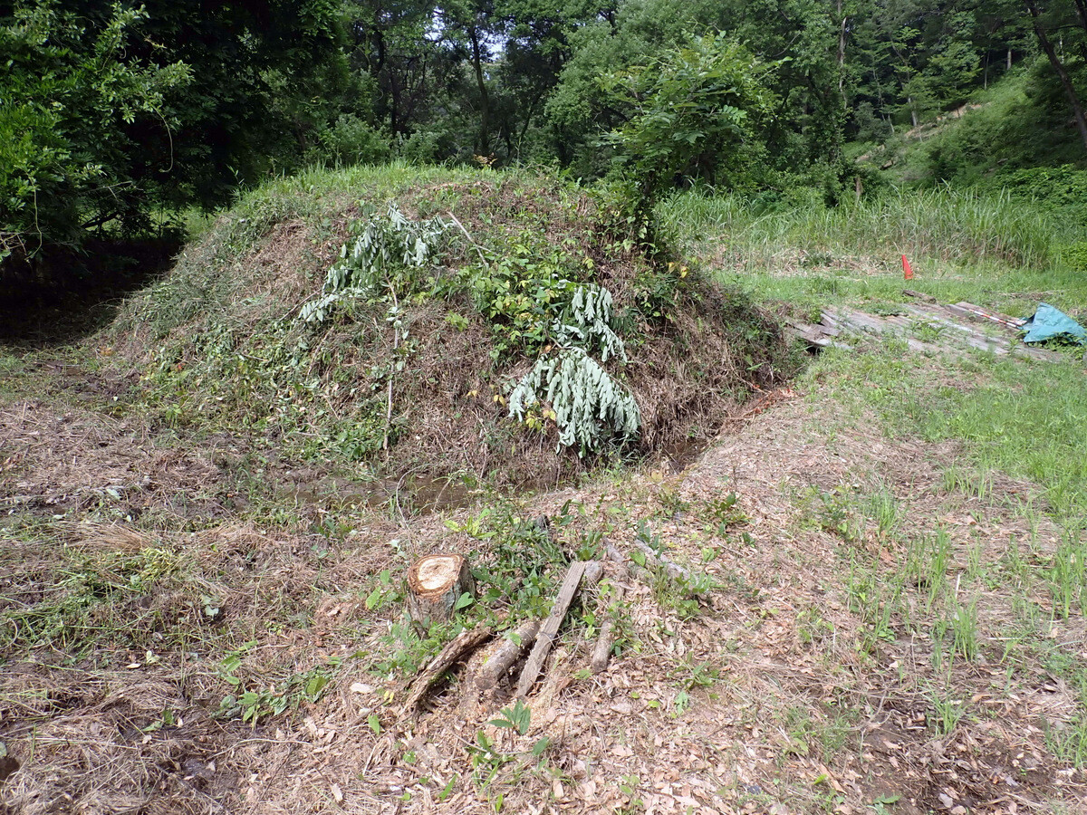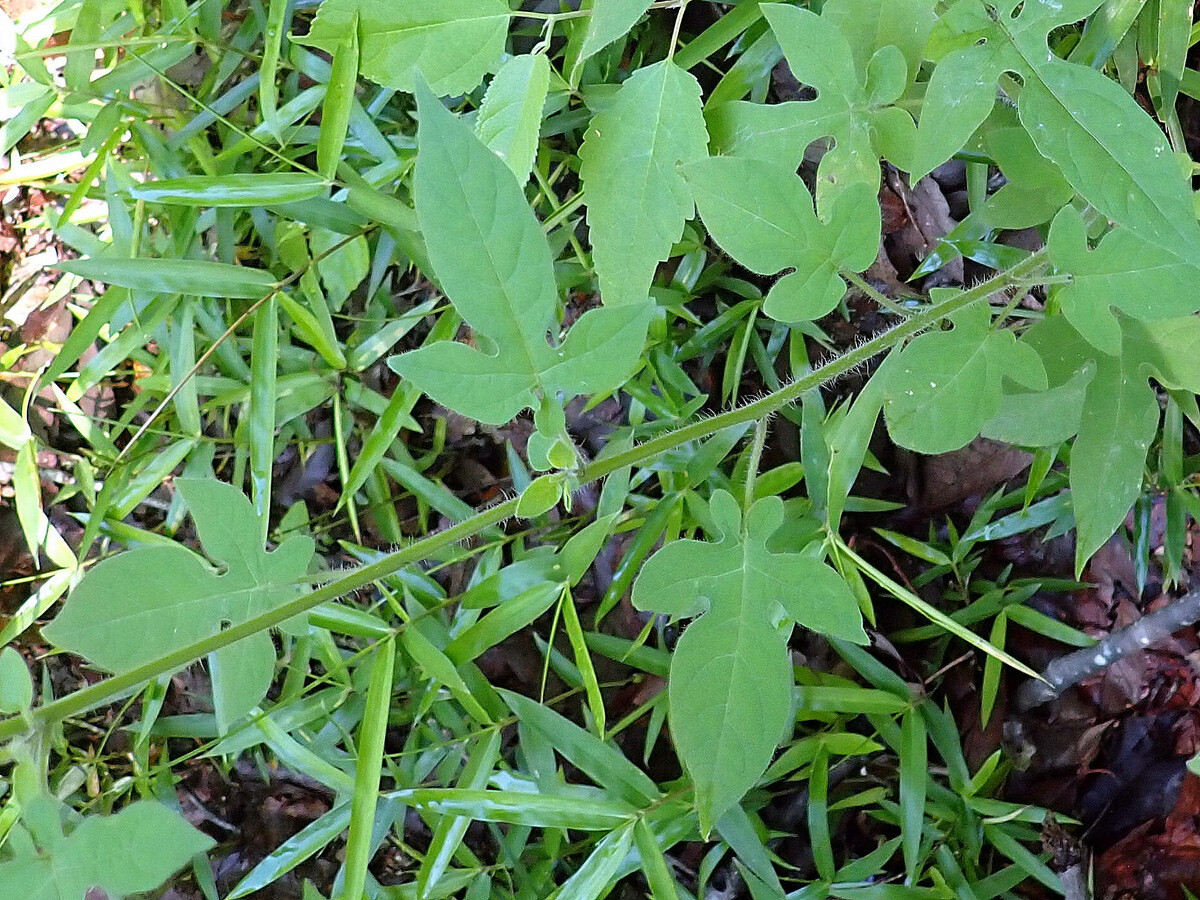 作業道と岩殿F地区との間の斜面を覆いつくしているカナムグラ(アサ科)の抜き取りを始めました。一年生のつる植物で雌雄異株。キタテハの幼虫の食草です。