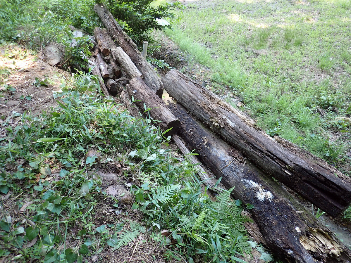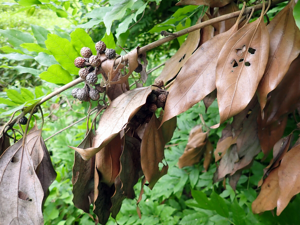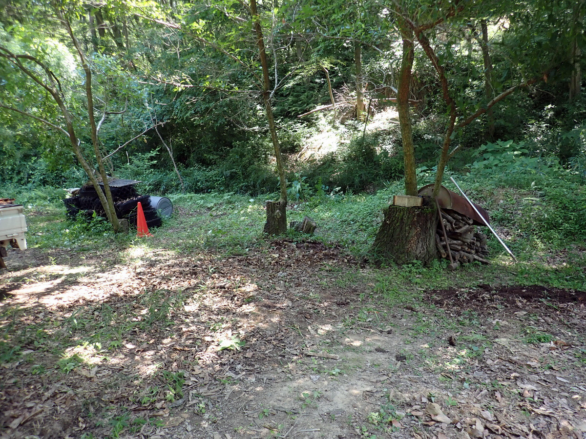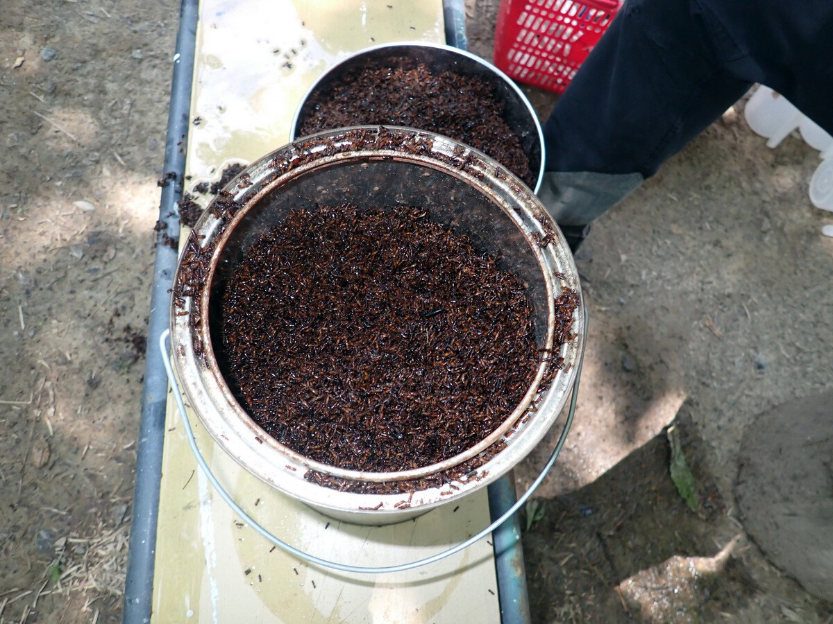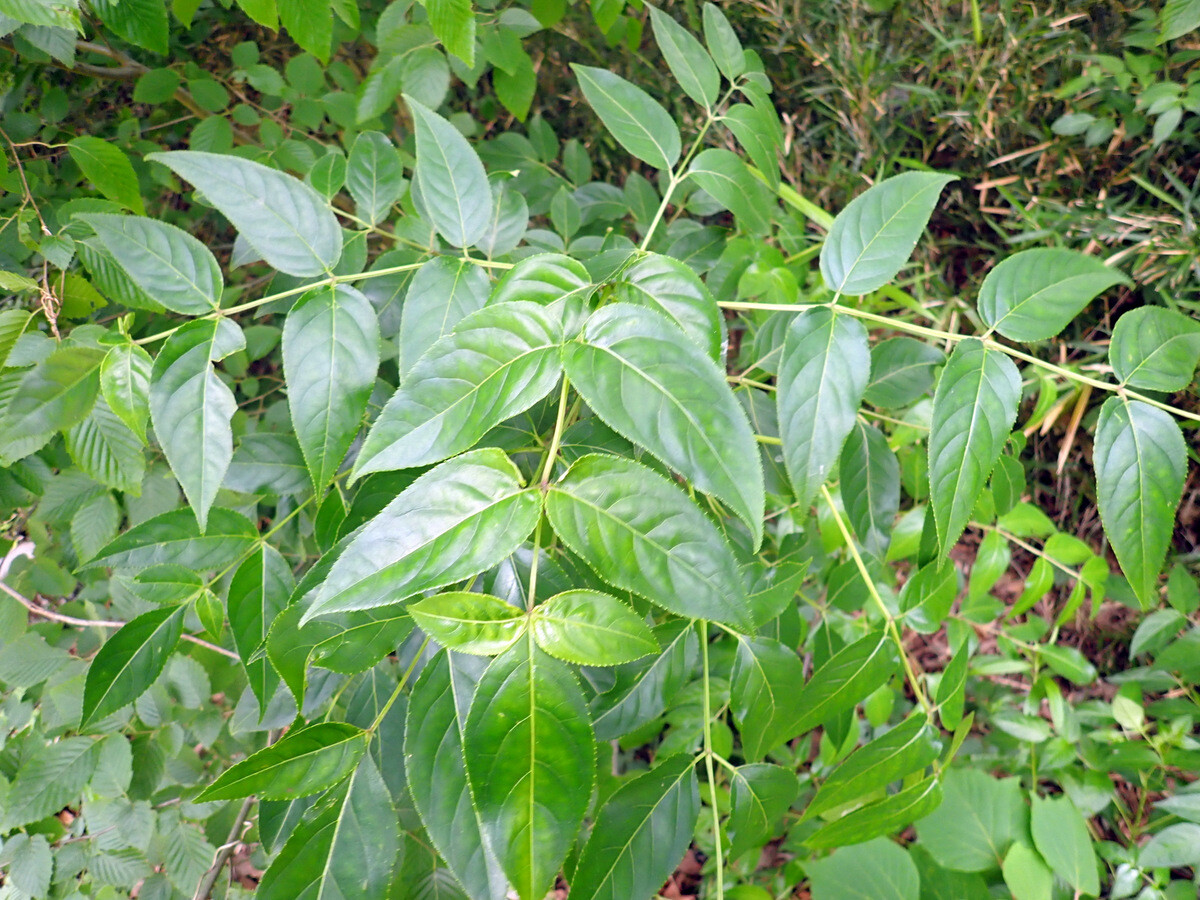 作業道と岩殿F地区との間の斜面を覆いつくしているカナムグラ(アサ科)の抜き取りを始めました。一年生のつる植物で雌雄異株。キタテハの幼虫の食草です。
