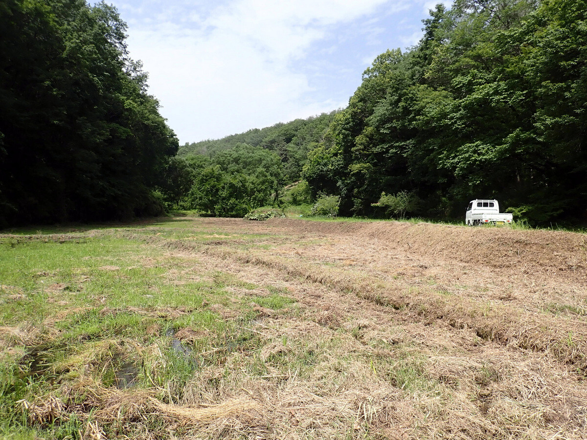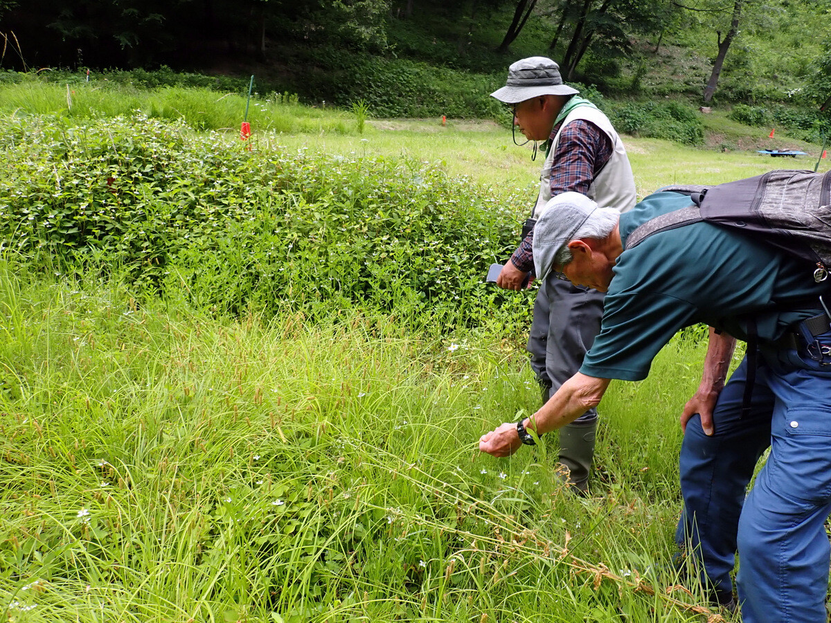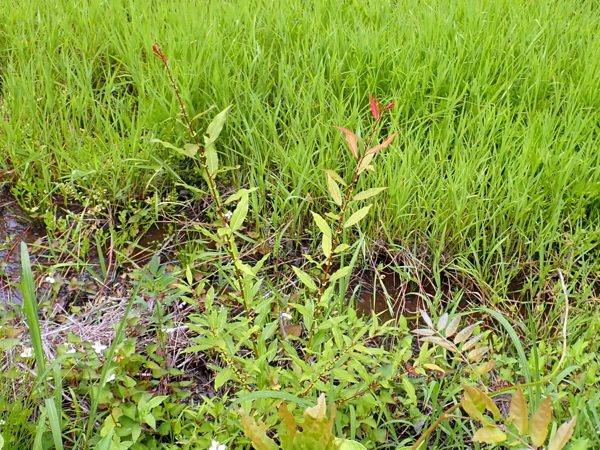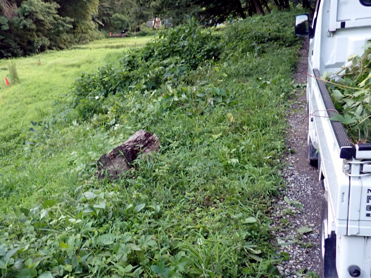 刈払いで行う場合は、カナムグラの草丈が、10~15㎝の高さになった時に、草削りなどを使って行います。この高さまで成長すると、「養分転換期」と言って、種子の養分を使い果たした段階になるためです。これを行った後に遅れて発生したり、再生が見られた時には、もう一度刈払いを行ってください。ただし、生育期の刈り取りは行いません。2~3年続ければおさまるでしょう。(『NPO法人緑地雑草科学研究所』)