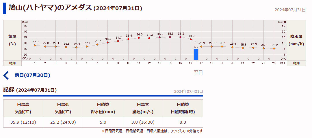 31日の鳩山アメダスの積算降水量は5㎜でした。