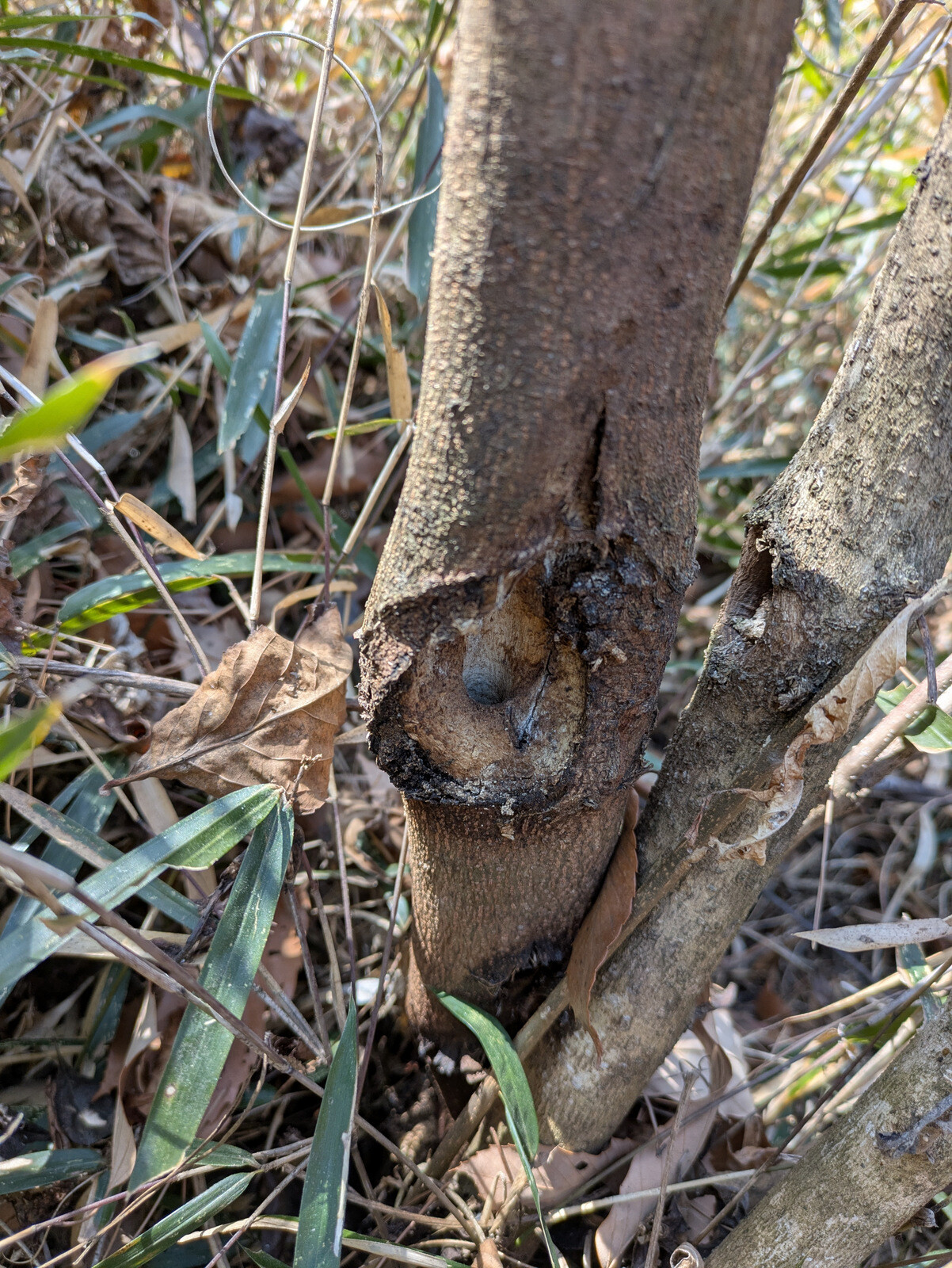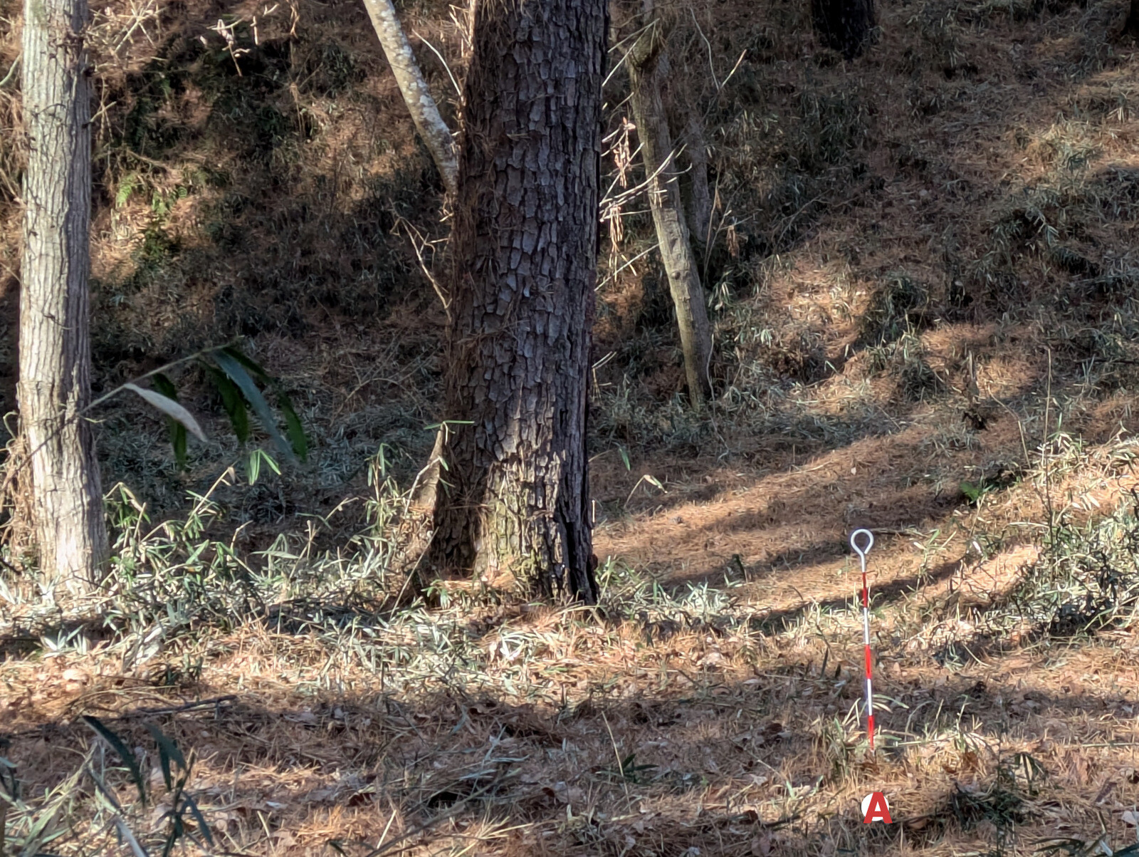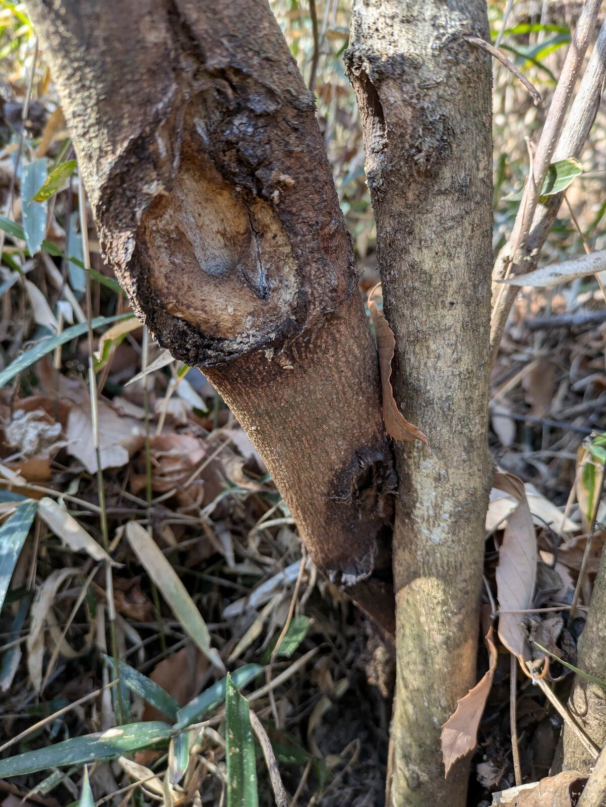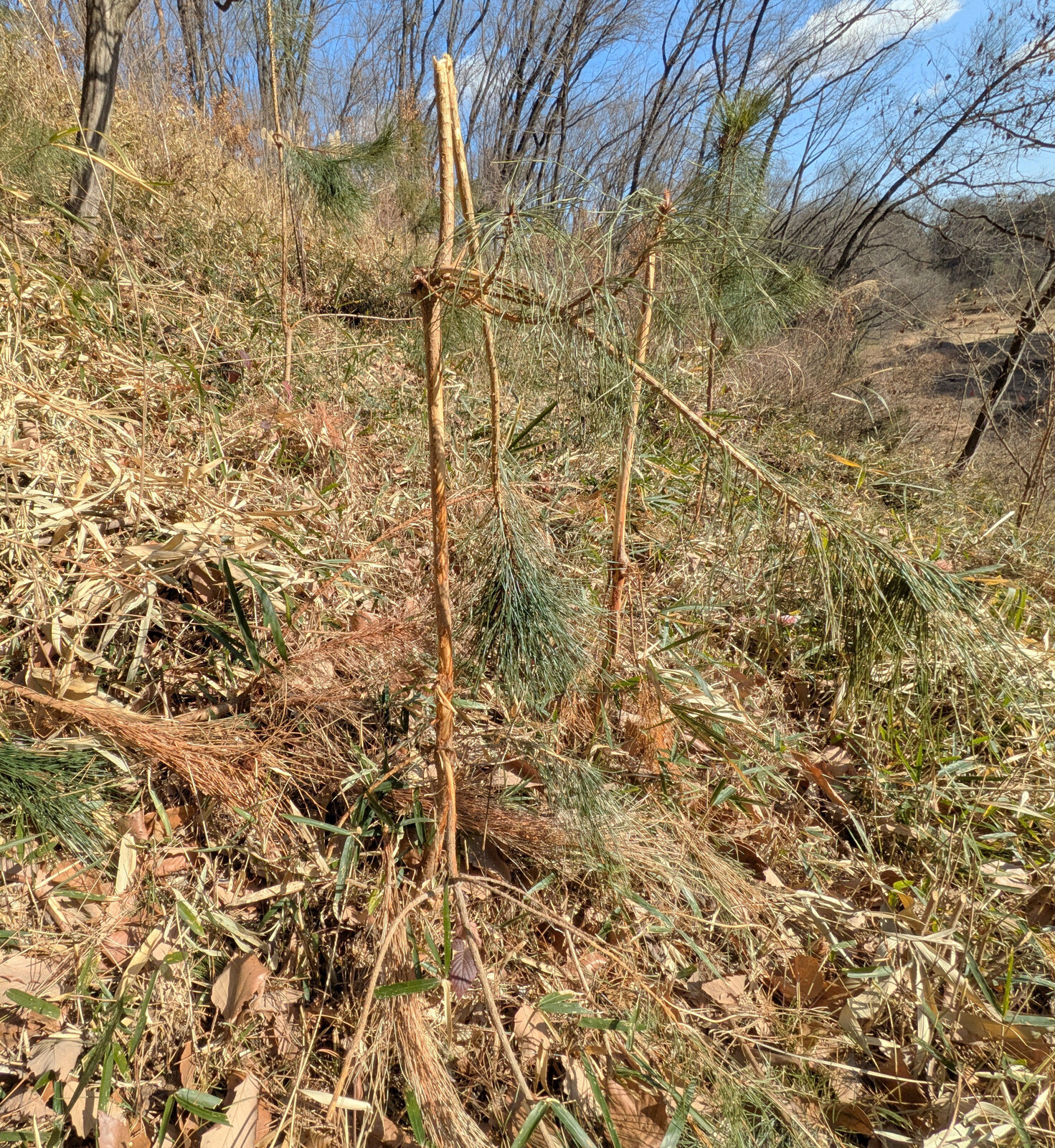 枝をへし折られたり、樹皮を剥がれて「巻き枯らし」状態になっているアカマツの実生があります。シカ、イノシシ?の仕業でしょうか。