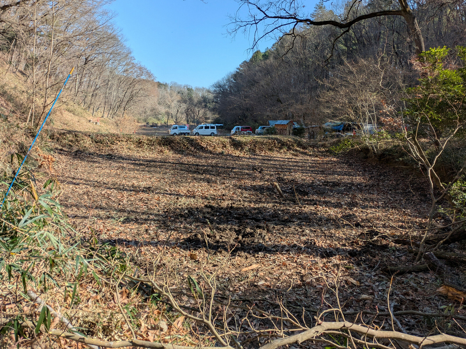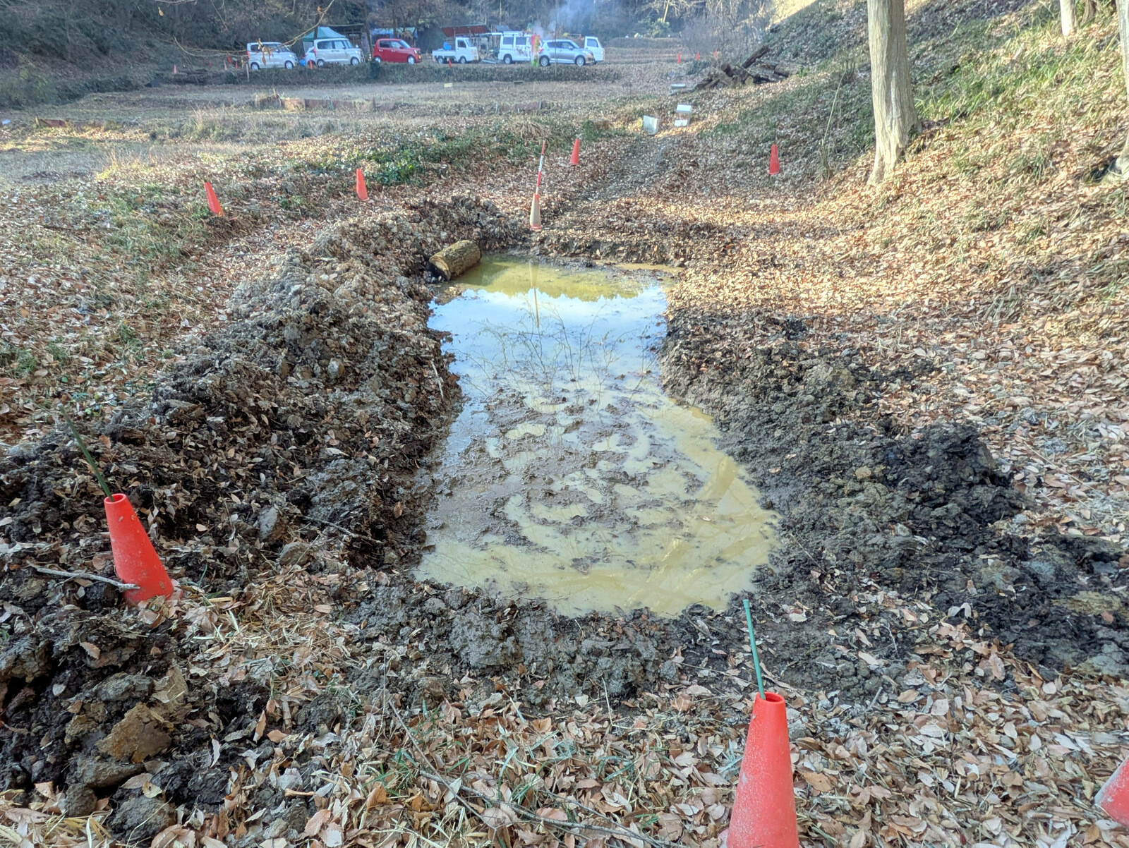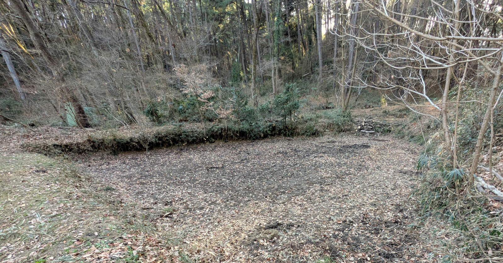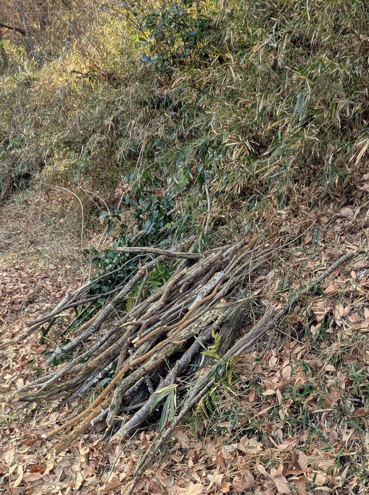昨年5月に岩殿B地区に設置した落葉堆肥枠は9月末にイノシシに壊されて解体していましたが、岩殿C地区の無名沼イ号下にその資材を運んで組み立て落ち葉を入れました。