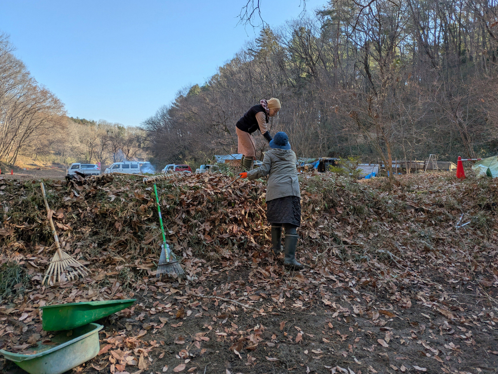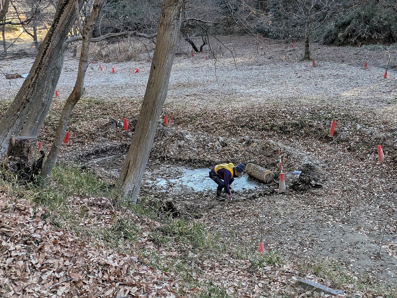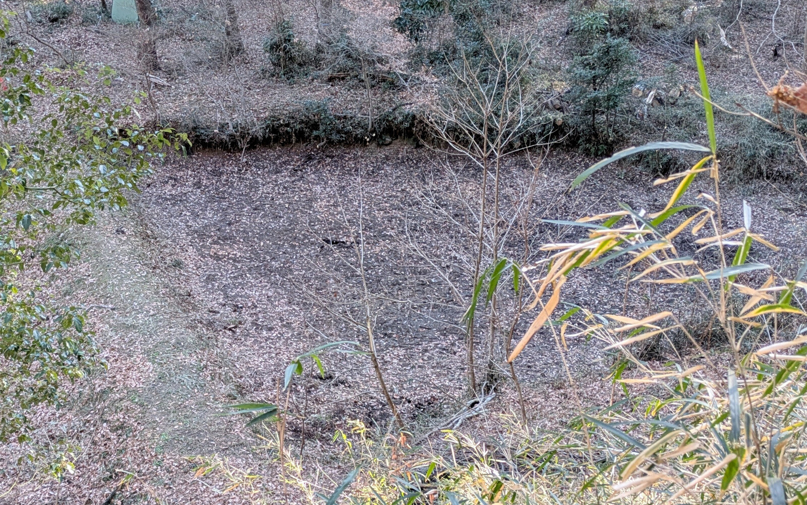 昨年5月に岩殿B地区に設置した落葉堆肥枠は9月末にイノシシに壊されて解体していましたが、岩殿C地区の無名沼イ号下にその資材を運んで組み立て落ち葉を入れました。
