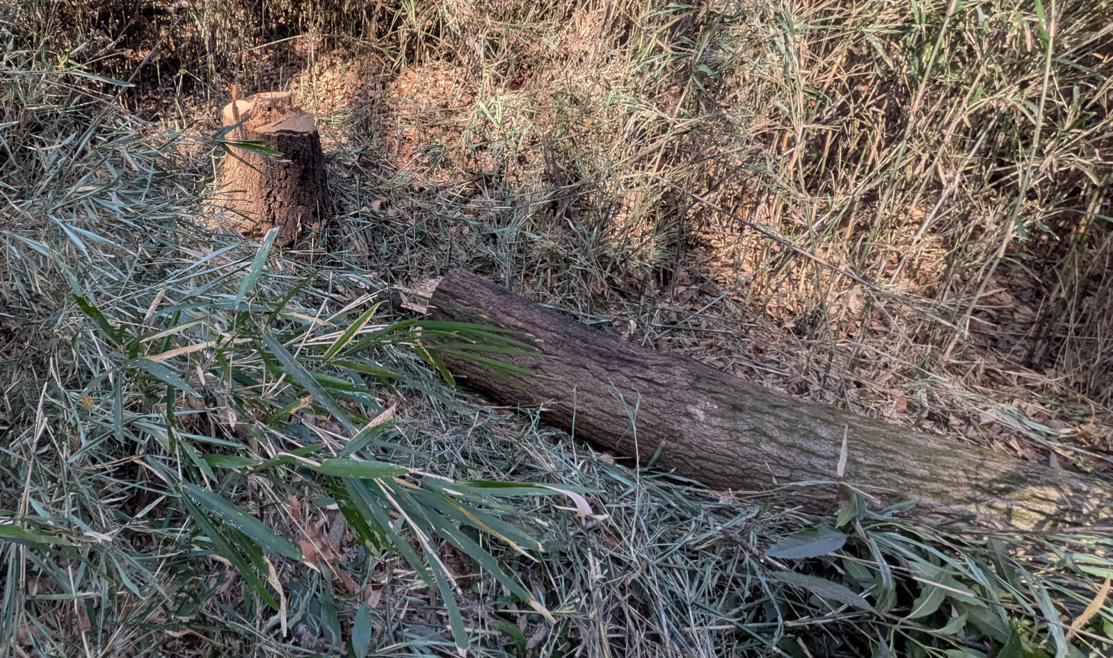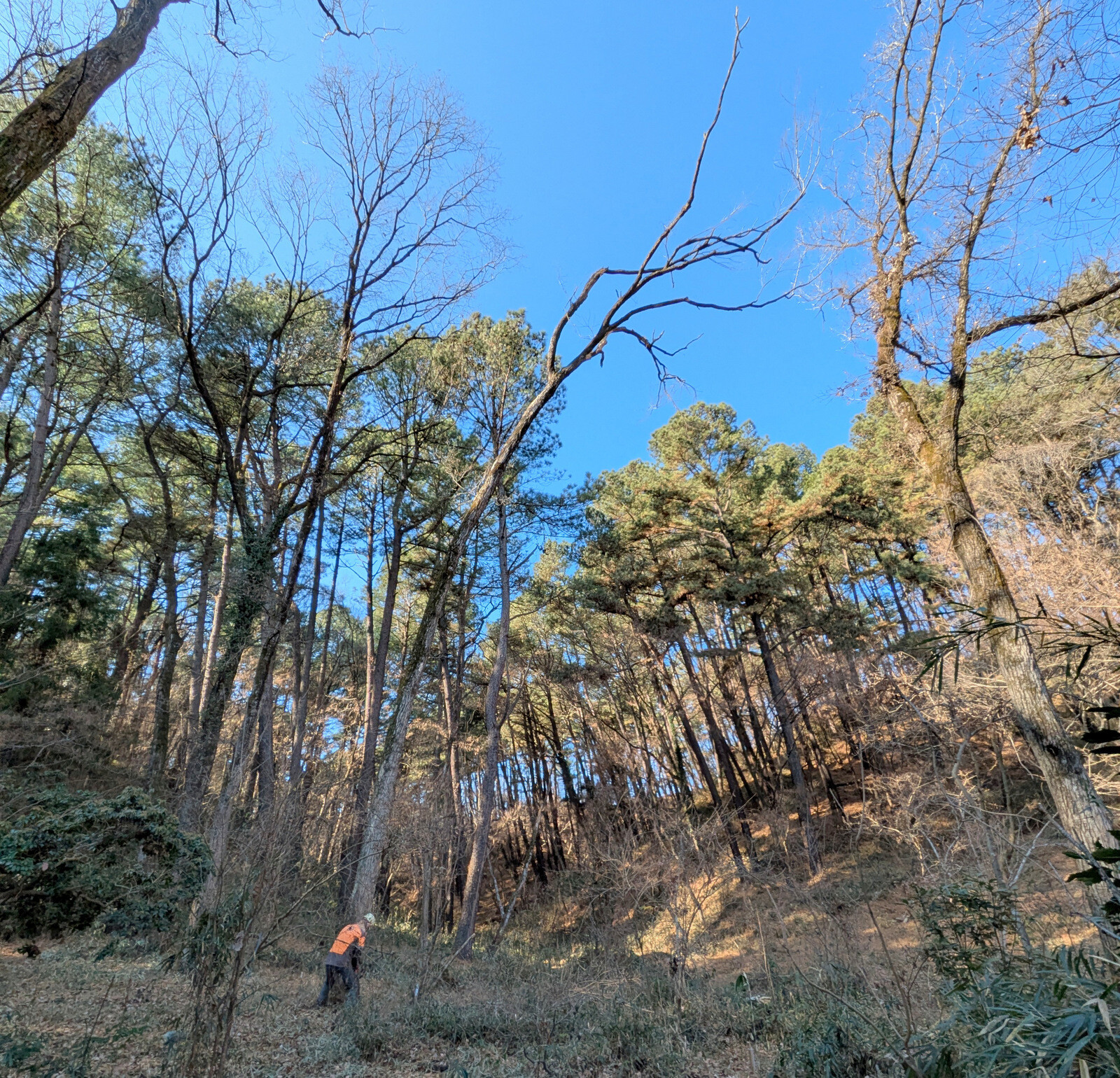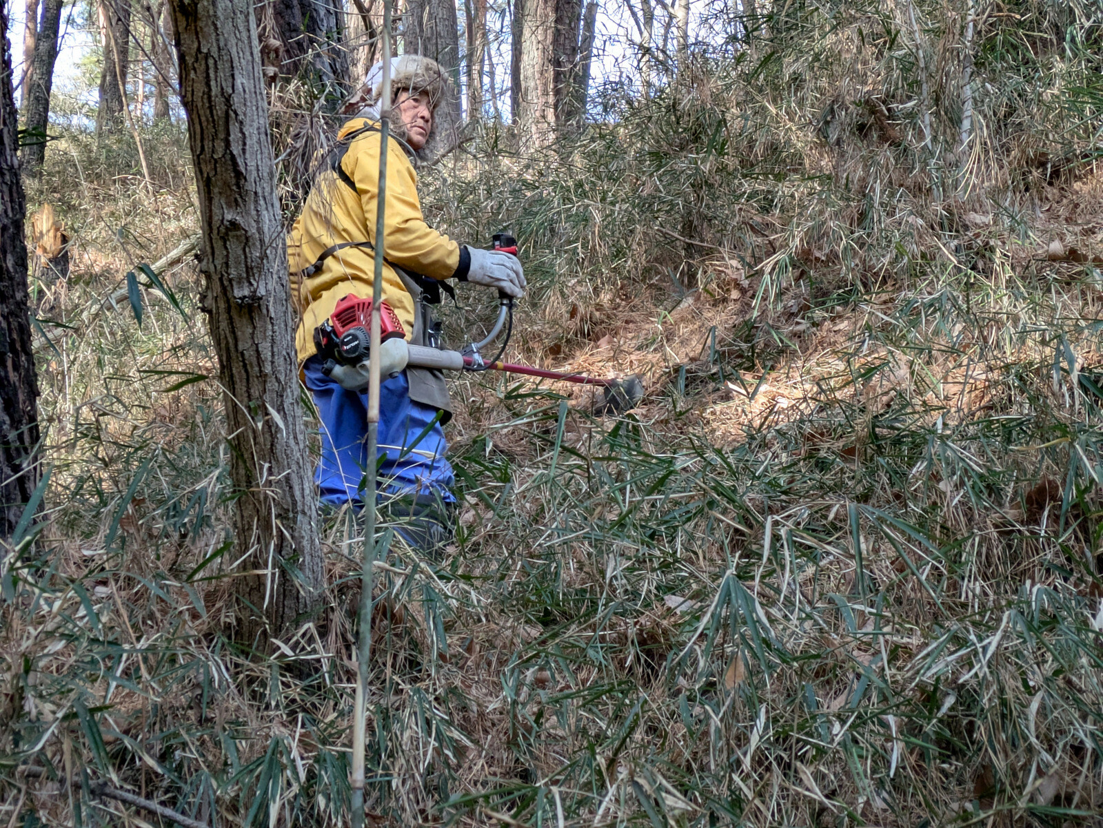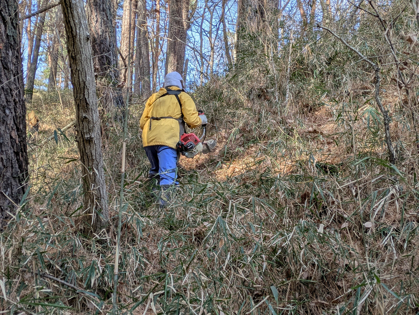 皆伐更新エリア林床のアズマネザサやつる植物、不用木を伐採しコナラの実生の刈り出し作業を続行しました。26日、27日、今日は除草機も使いましたがはかどりません。幼木の誤伐を避けるために、鎌等で坪刈りしてから除草機を使います。