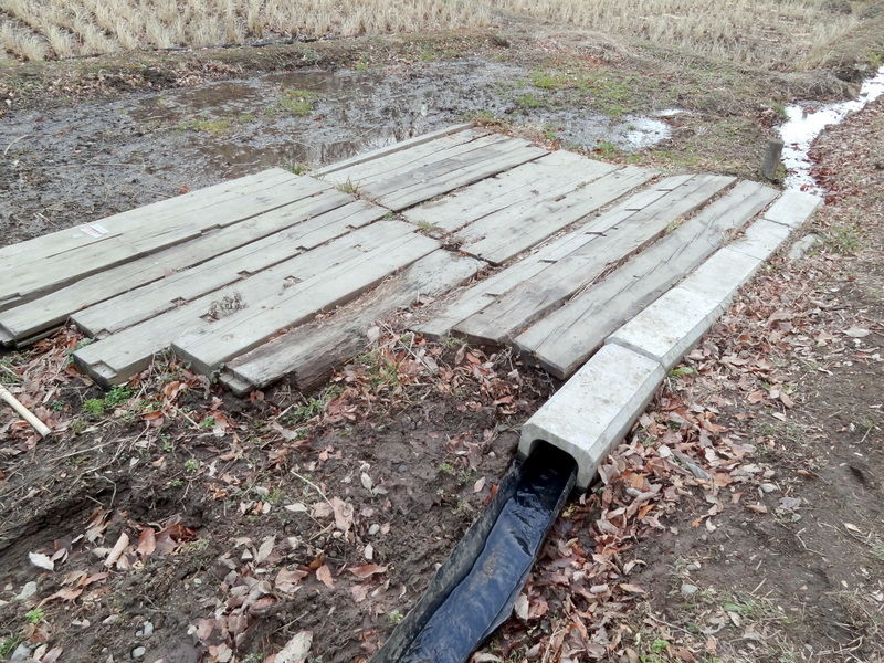 児沢田んぼに車で荷物を運んで来て、しばらく駐車する時は、水路にU字溝がかぶせてある場所から入り、角材の敷いてある場所に駐車します。U字溝からの漏水で、田んぼの手前がびしょびしょでした。