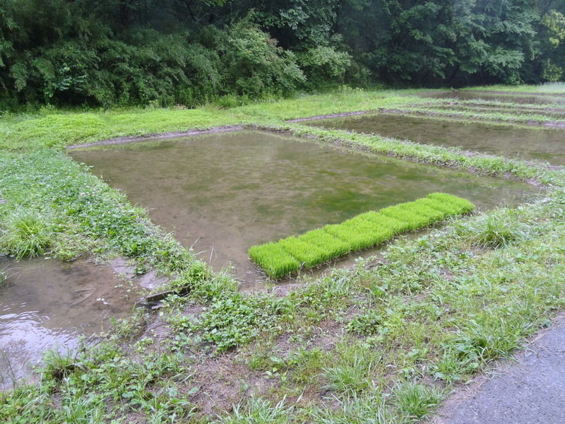 田んぼに苗がおいてありました。三本さんモミからの育苗、大変でしたね。