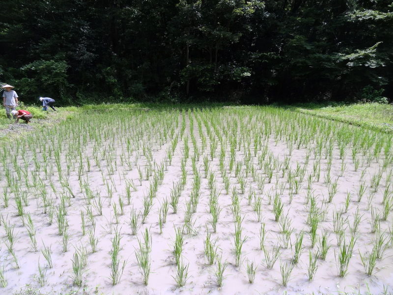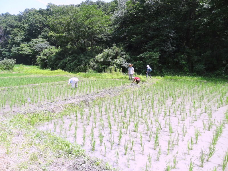 児沢探検隊の田んぼを手取りとアルミ製の中耕除草機を使って除草しました。田んぼに入って這い回っていると田んぼの個性がわかってくるような気がします。