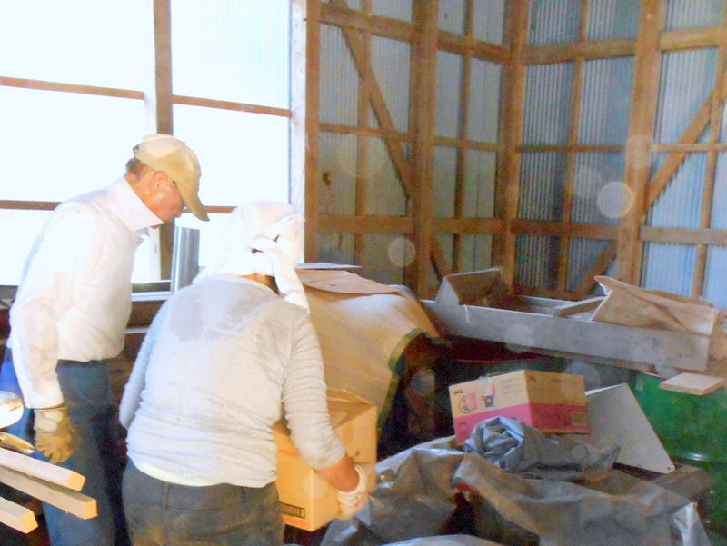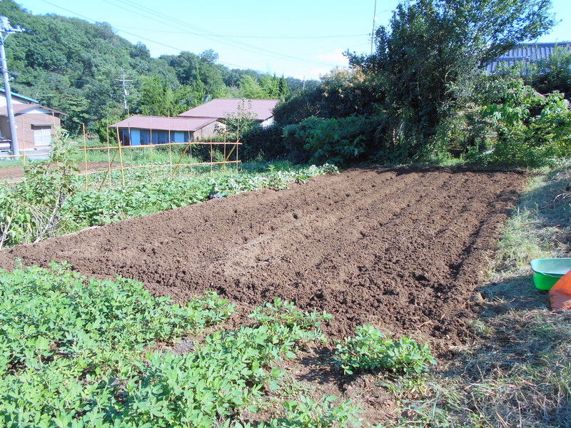 8時前から、昨日の続きのラッカセイの除草、つづいてその奥を除草し、苦土石灰とヌカを撒いて、耕運機で耕いました。並行して、児沢家の物置の片付、掃除をし、棚を作る場所を開けました。