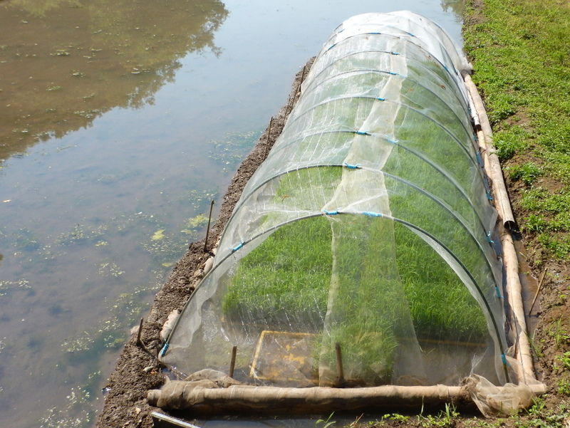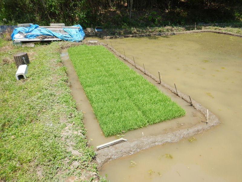 今日も気温が上がりました。児沢の手前の田んぼにおいてある苗箱の覆いをはずしました。手前の田んぼは6月5日、殿山農場の皆さんが田植えをすることになっています。