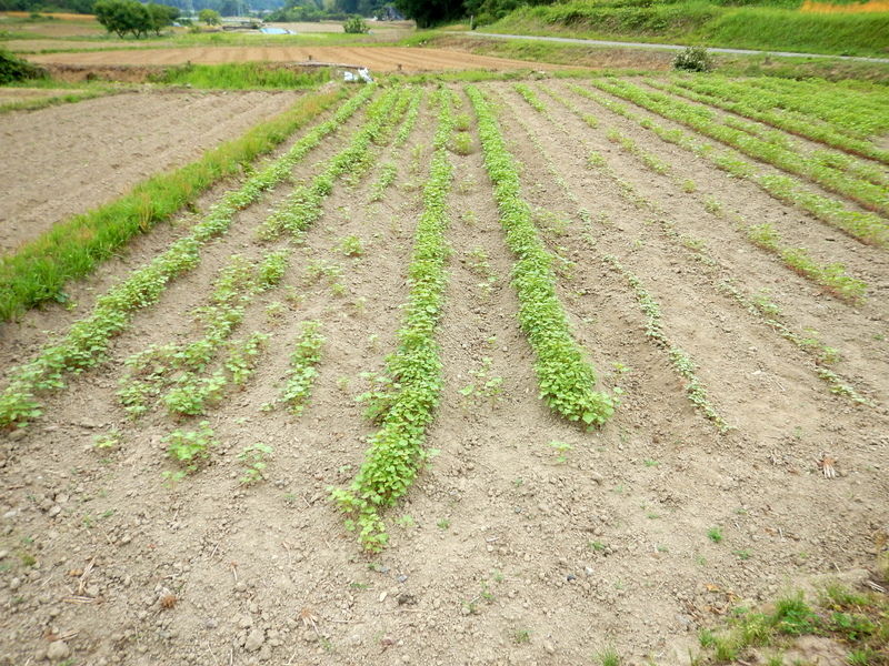 岩殿(入山)A地区の畑と青木ノ入の畑では、須田さんが作業をしました。新たに種や苗を植えたり、間引いたり大忙しです。ソバは早くも花が咲き始めているものもありました。