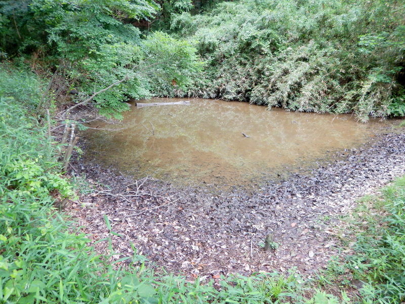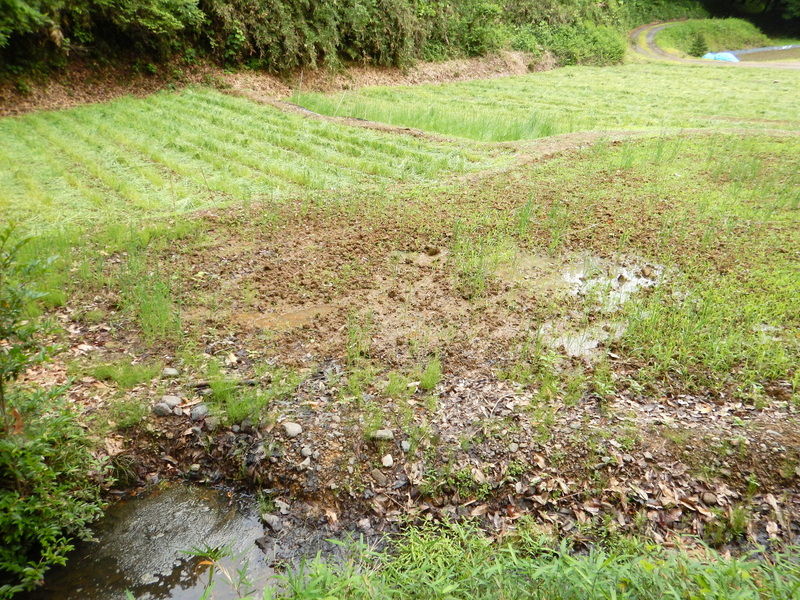沼の堰堤の下、手前の区画にも耐湿性に優れ湛水条件でも栽培できるグリーンミレット(イネ科)と、湿害圃場の改善に効果があるセスバニア(ロストアラータ)(マメ科)とをまいてみます。