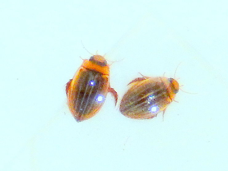 ※HP『Hondaキャンプ』「生きもの図鑑」のシマゲンゴロウ(体長1.5㎝位、体色は黒、両側に太くて白い縞があり、背中の中央に一対の丸い斑点)